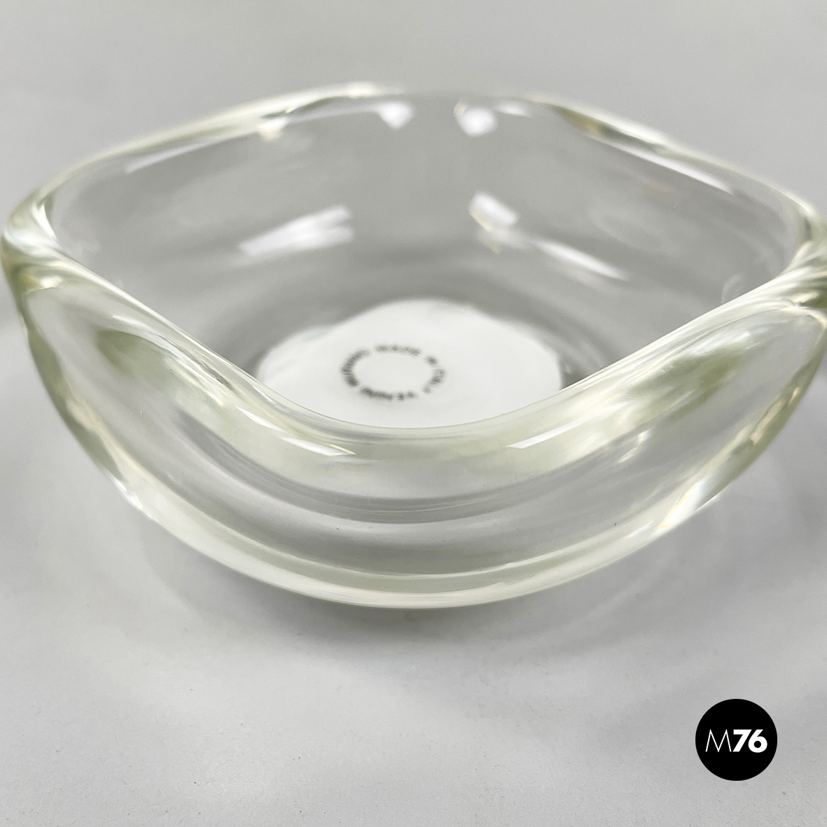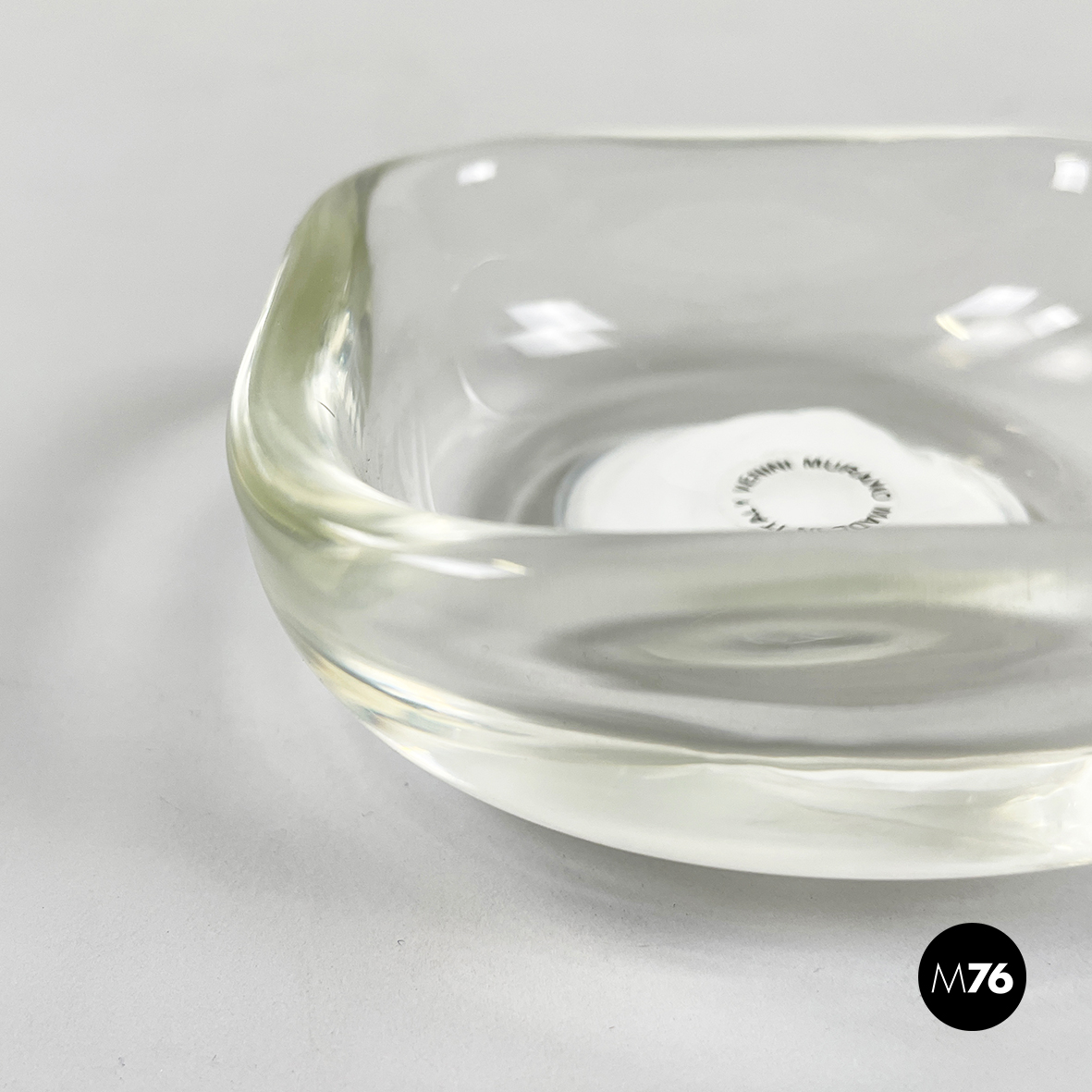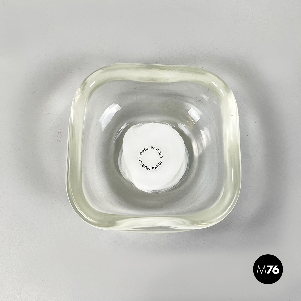 Posacenere da tavolo a base quadrata con angoli arrotondati in vetro di Murano trasparente. Al centro presenta una parte in vetro bianco.