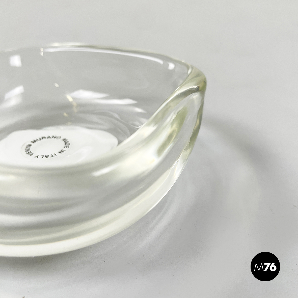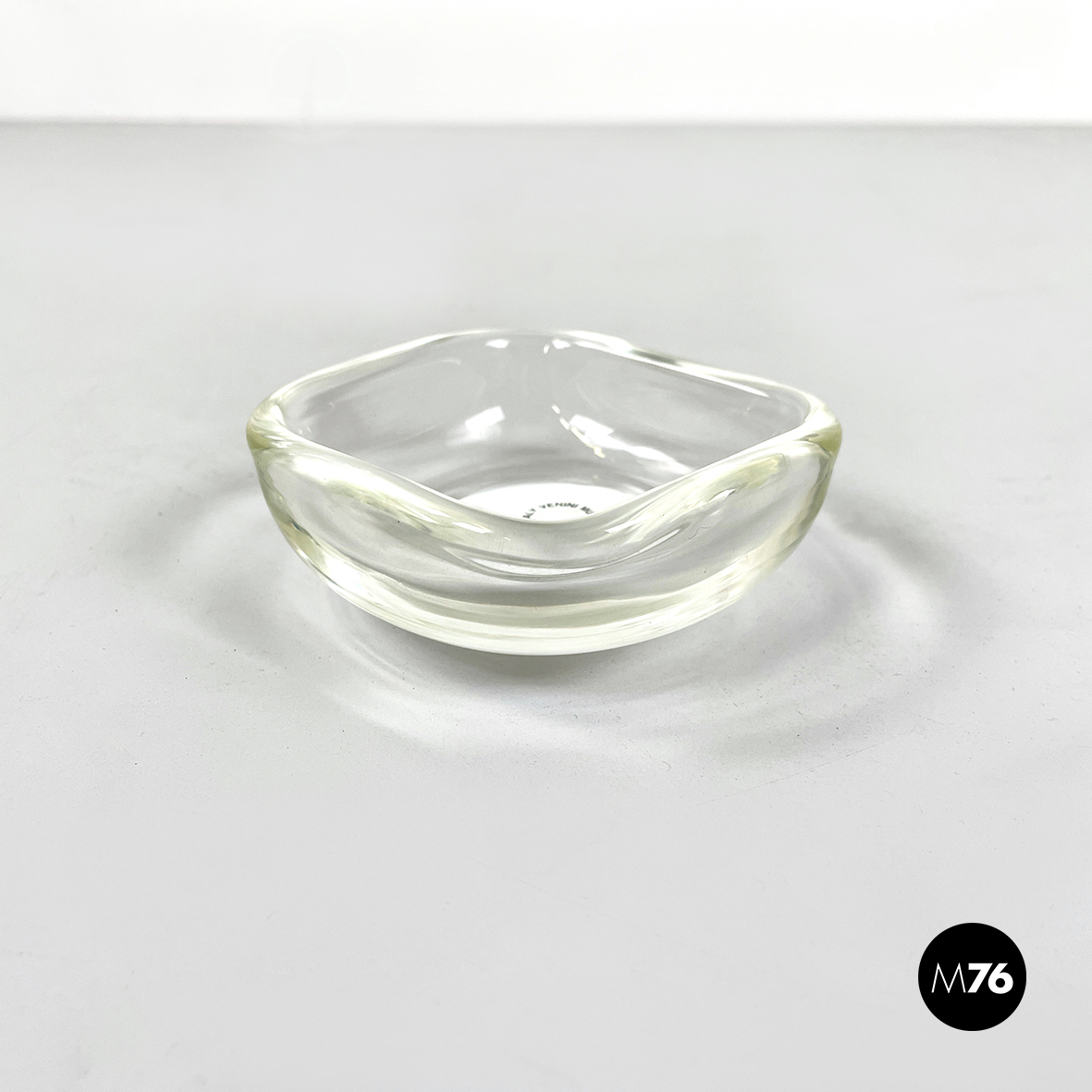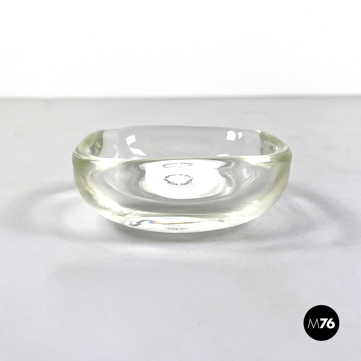 Posacenere da tavolo a base quadrata con angoli arrotondati in vetro di Murano trasparente. Al centro presenta una parte in vetro bianco.