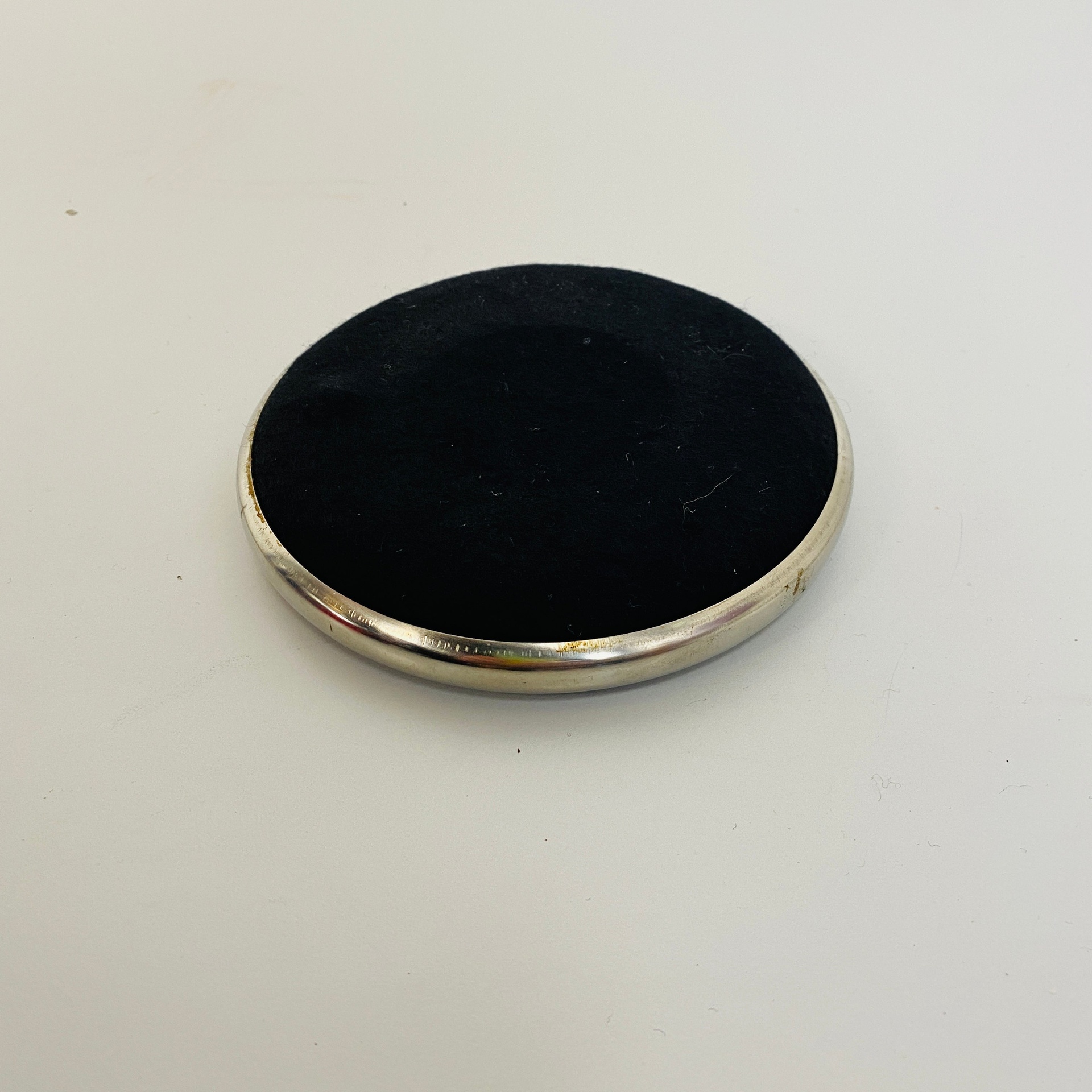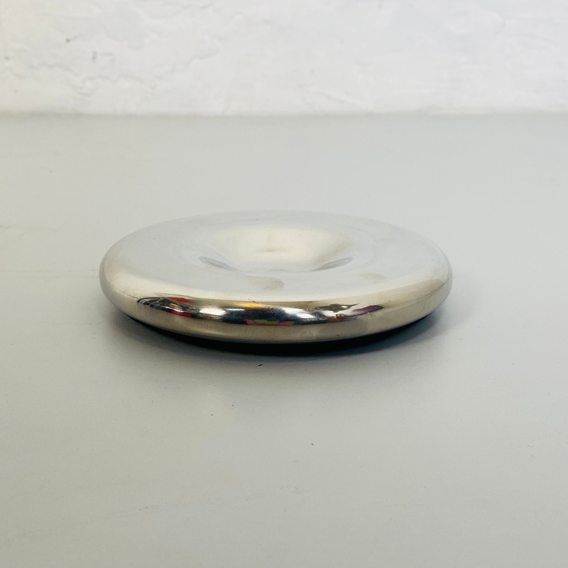 Posacenere da tavolo tondo in acciaio cromato, con imbottitura in tessuto sul retro.