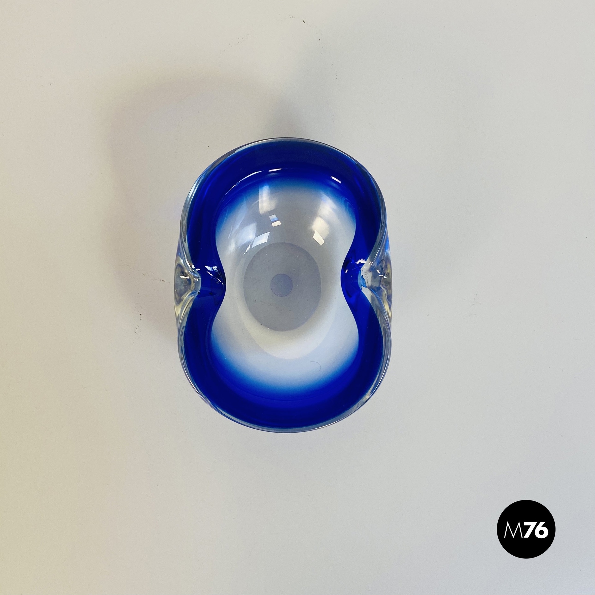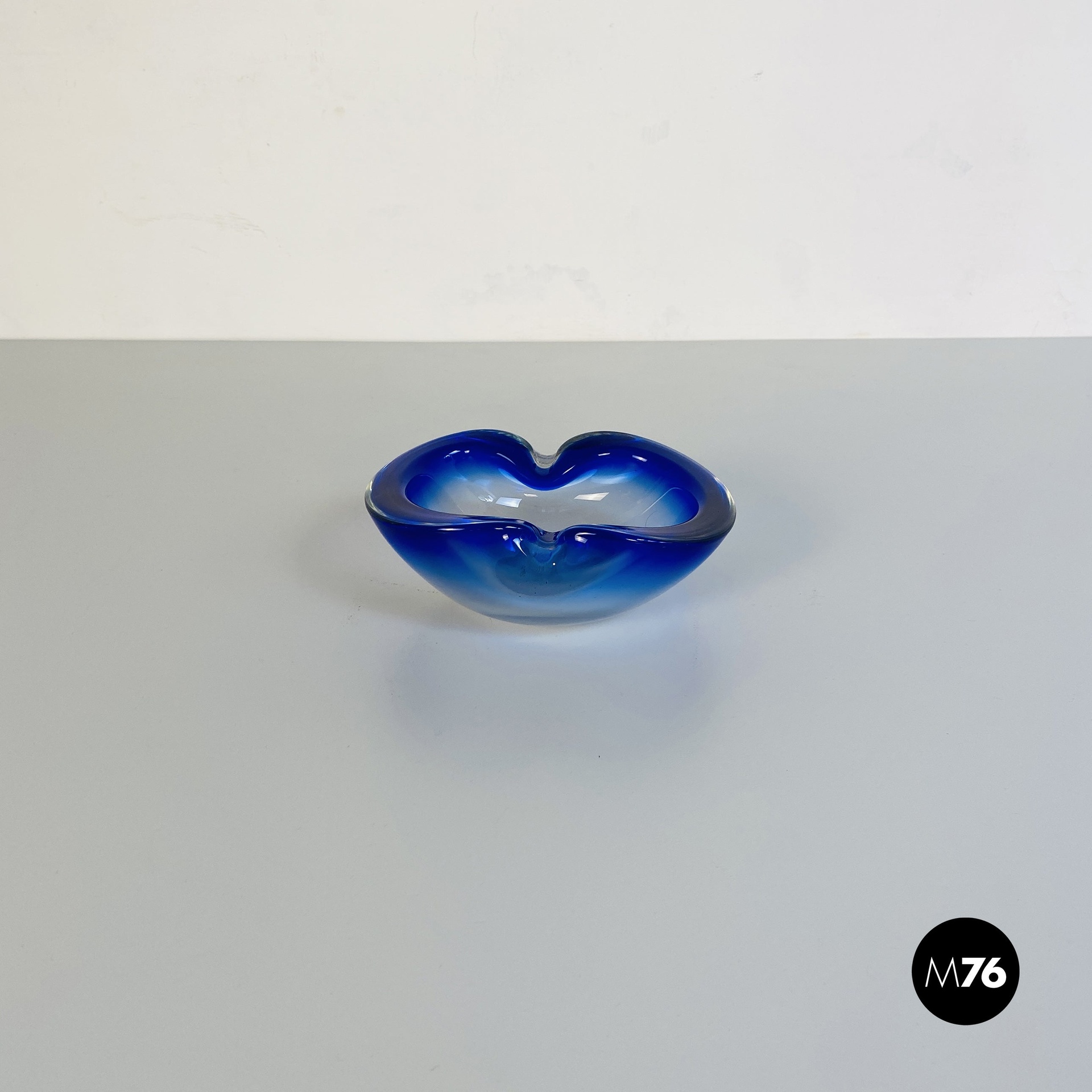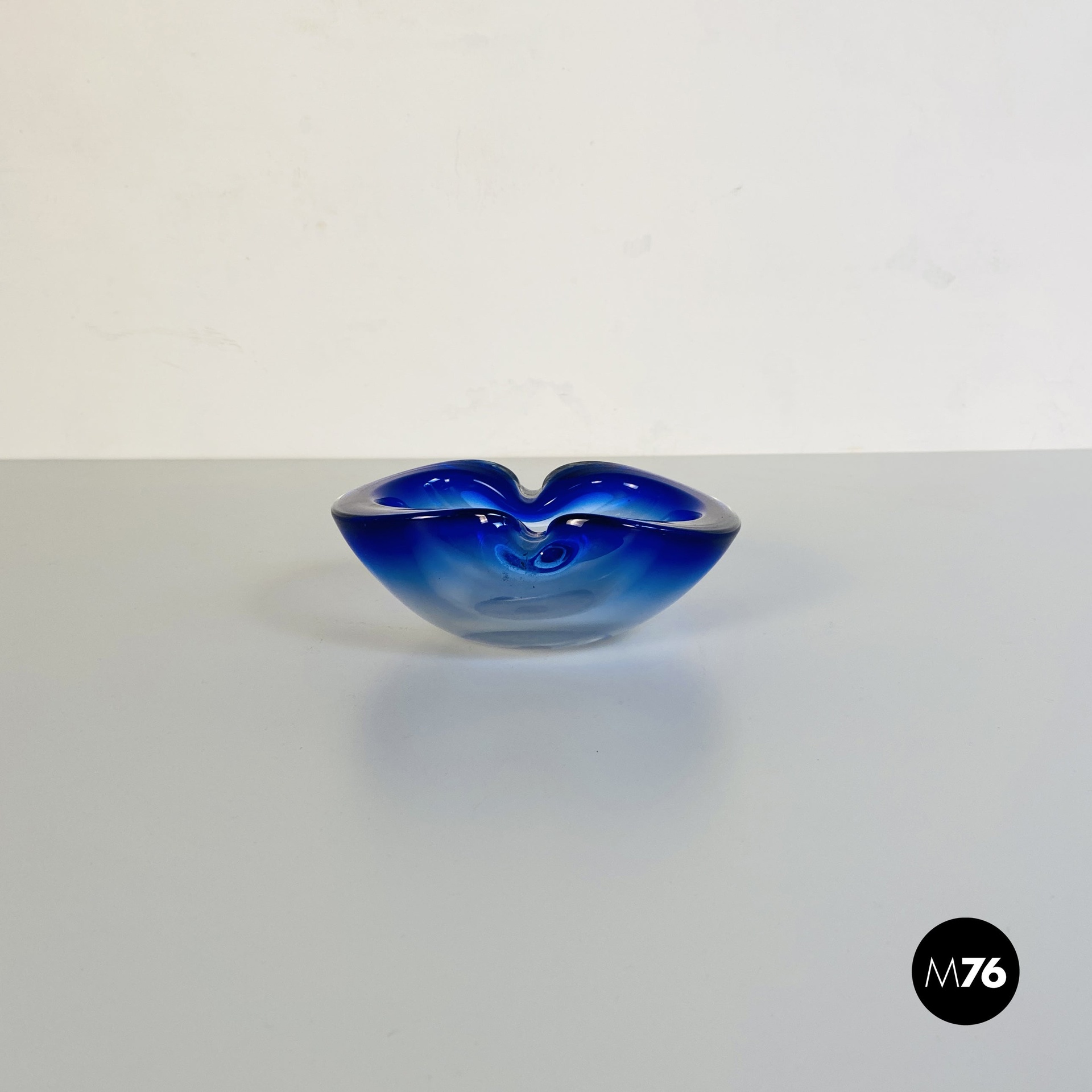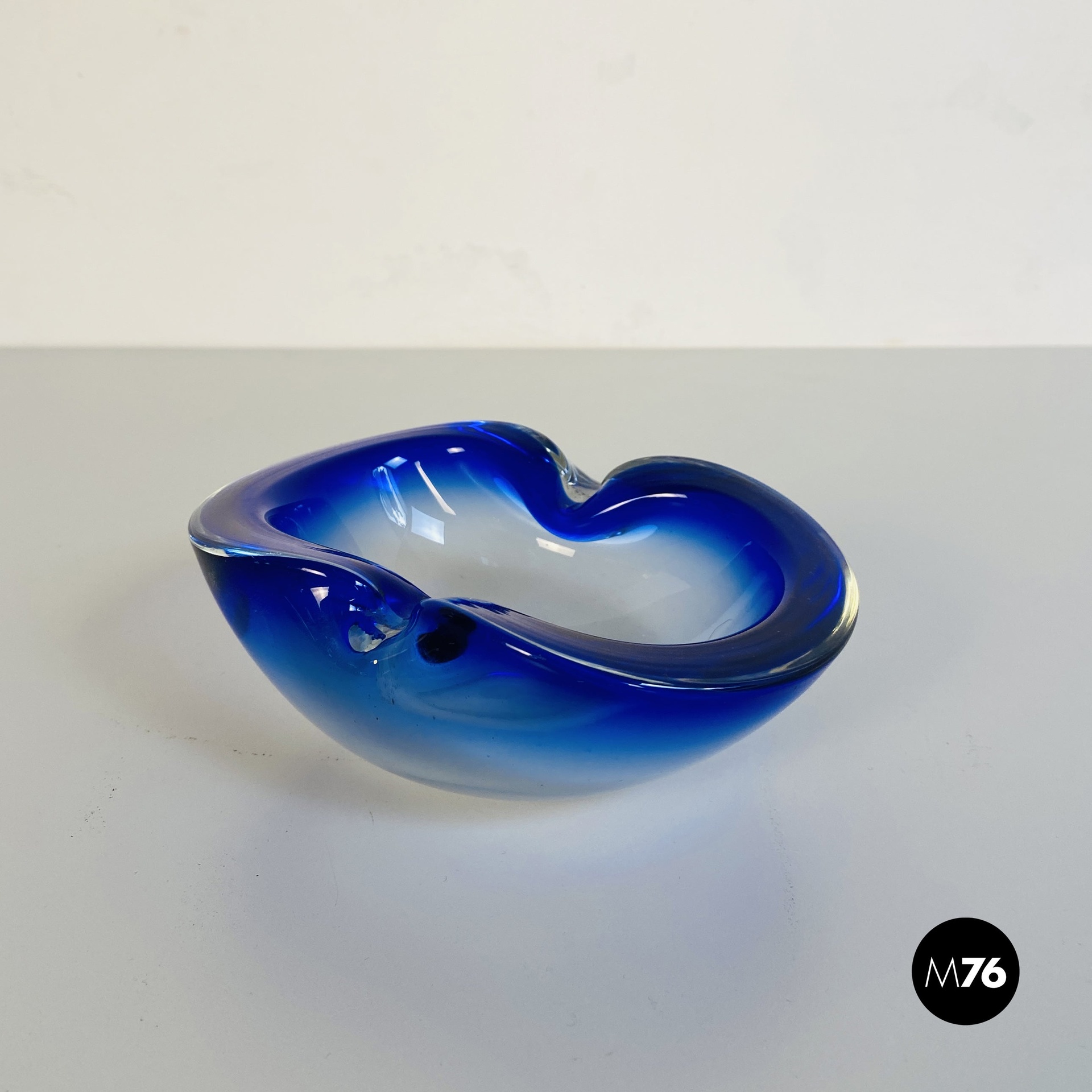 Posacenere da tavolo di forma irregolare in vetro di Murano blu, azzurro e trasparente, con bordi sfumati.