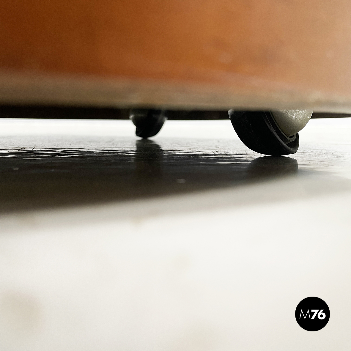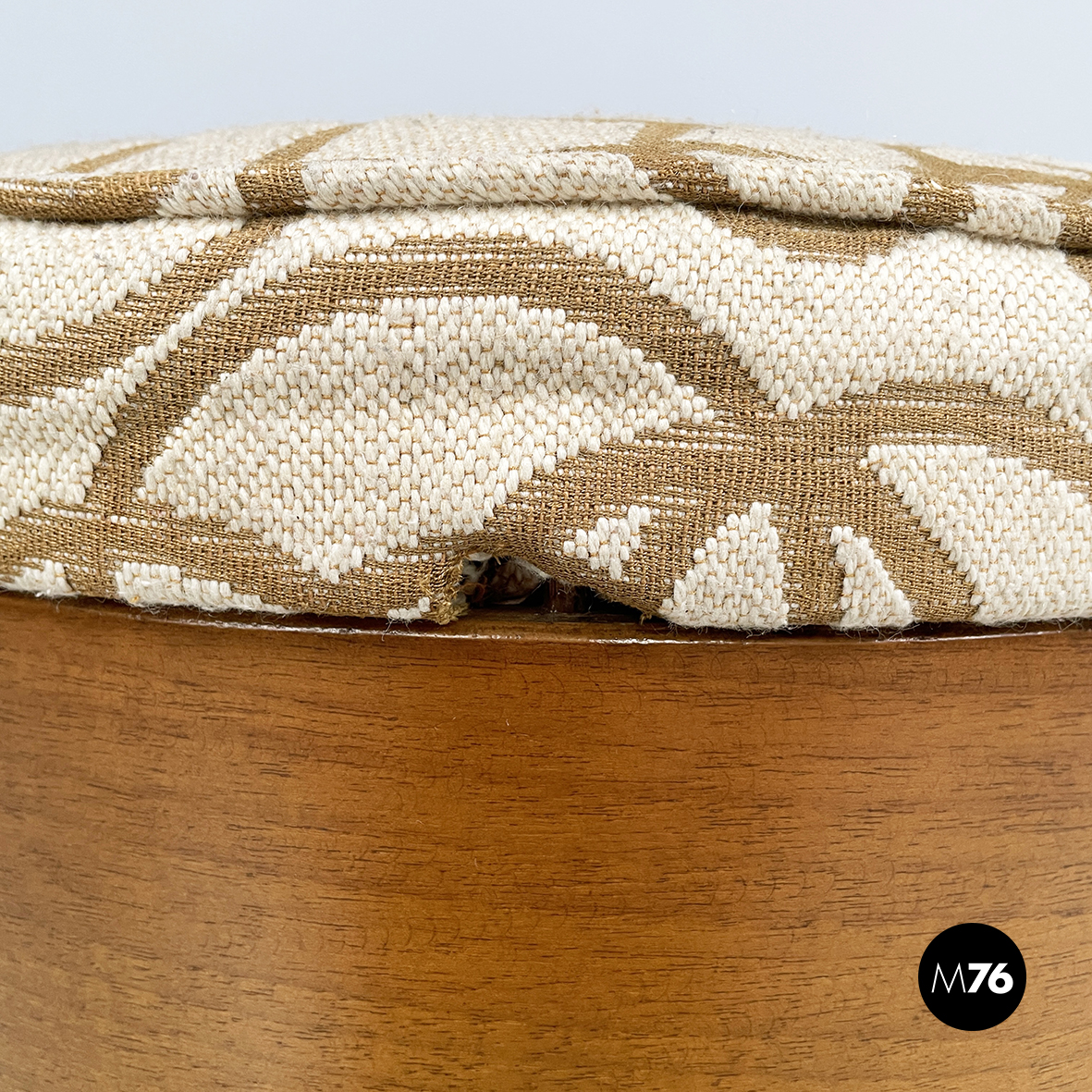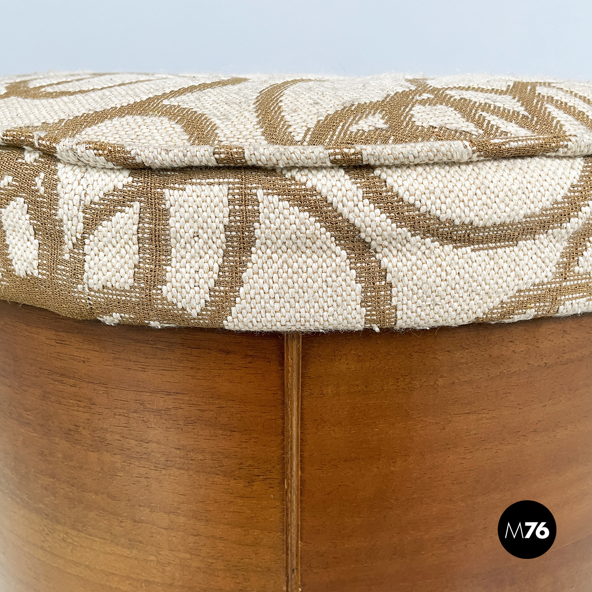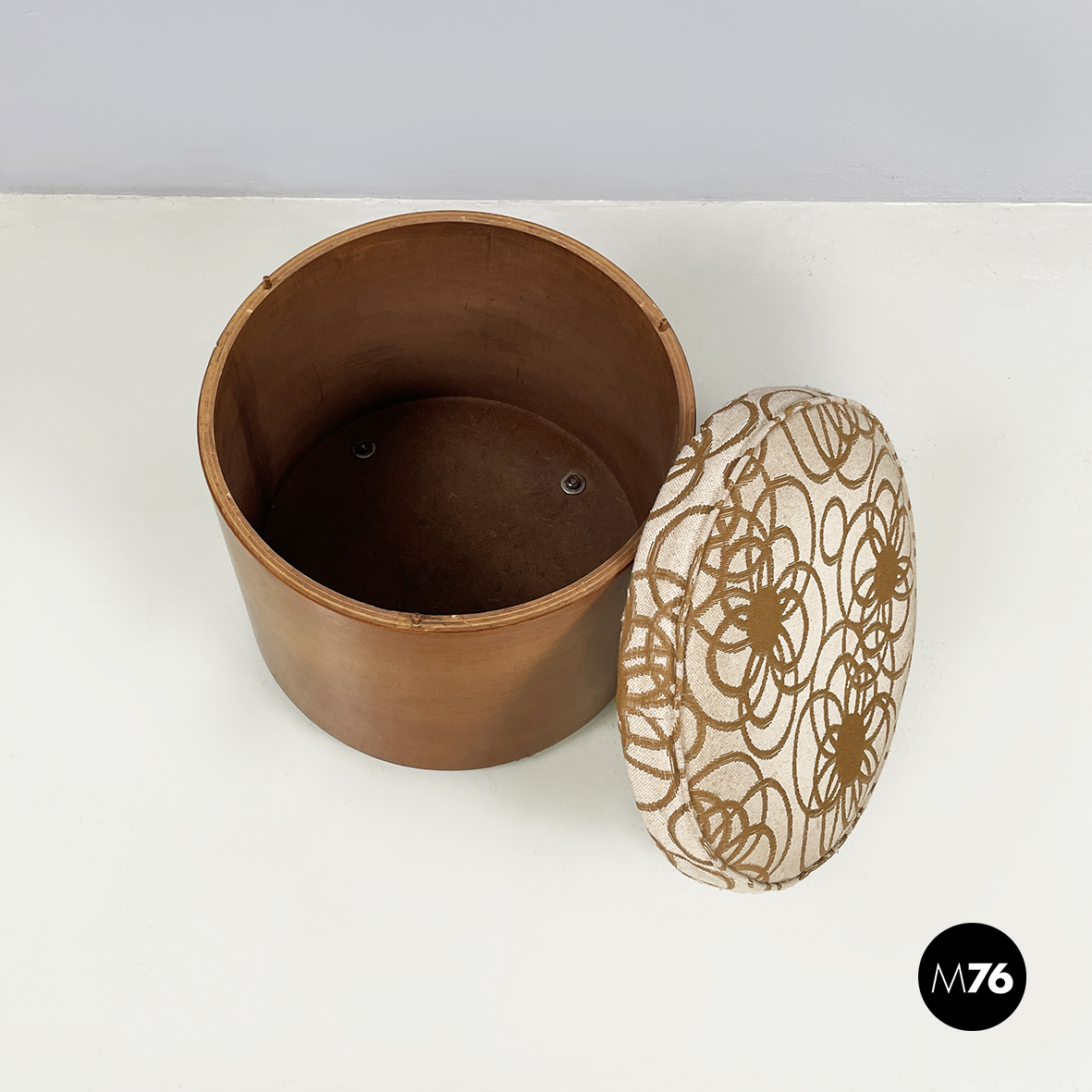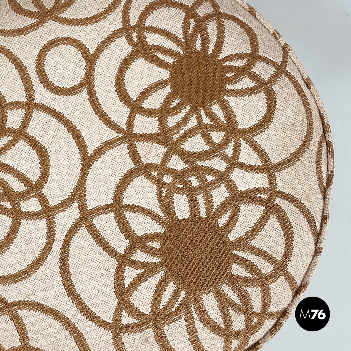 Pouf a base tonda in tessuto e legno. La seduta è imbottita e rivestita con tessuto a sfondo beige con decorazione floreale stilizzata marrone. La seduta è rimovibile e mostra lo scompartimento interno nascosto. La struttura dello sgabello è in legno. Alla base presenta quattro ruote non a vista. Utilizzabile anche come poggiapiedi.