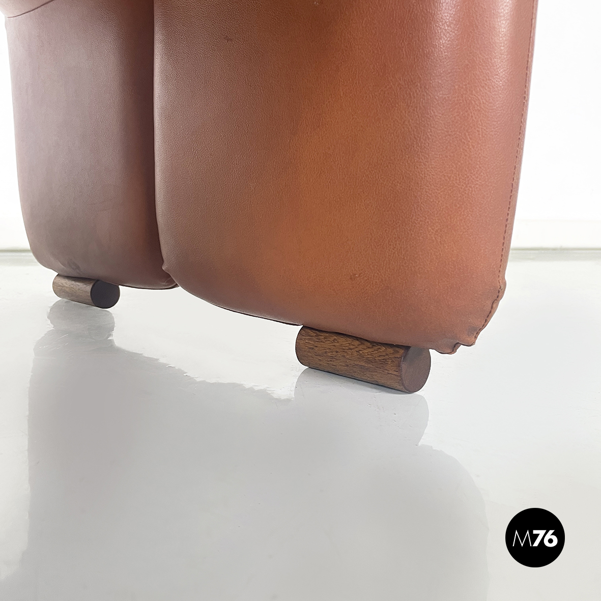 Coppia di pouf modello Coronado leggermente imbottitI e rivestitI in pelle marrone. Piedini a sezione tonda in legno. Utilizzabile anche come poggiapiedi.