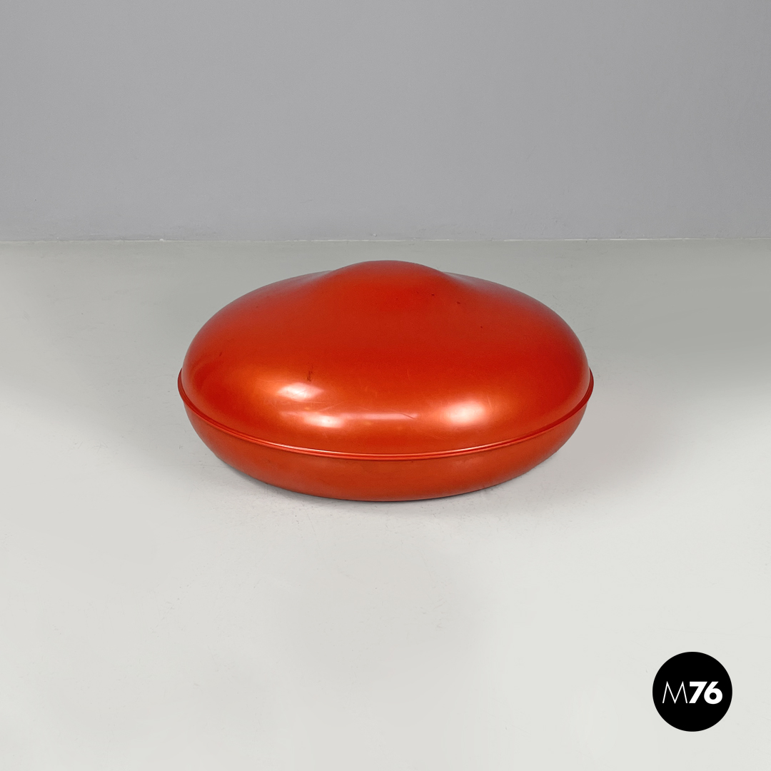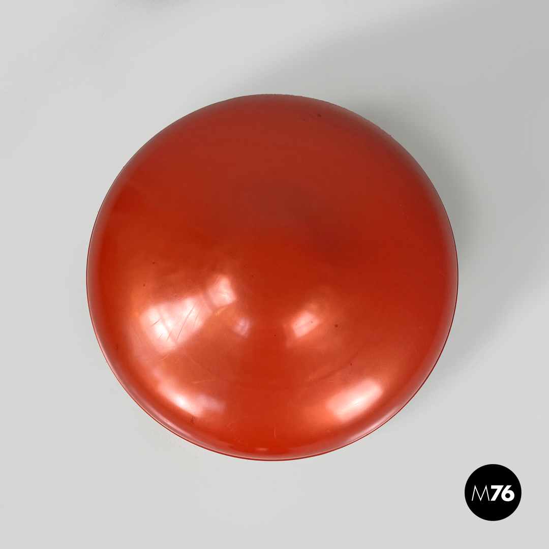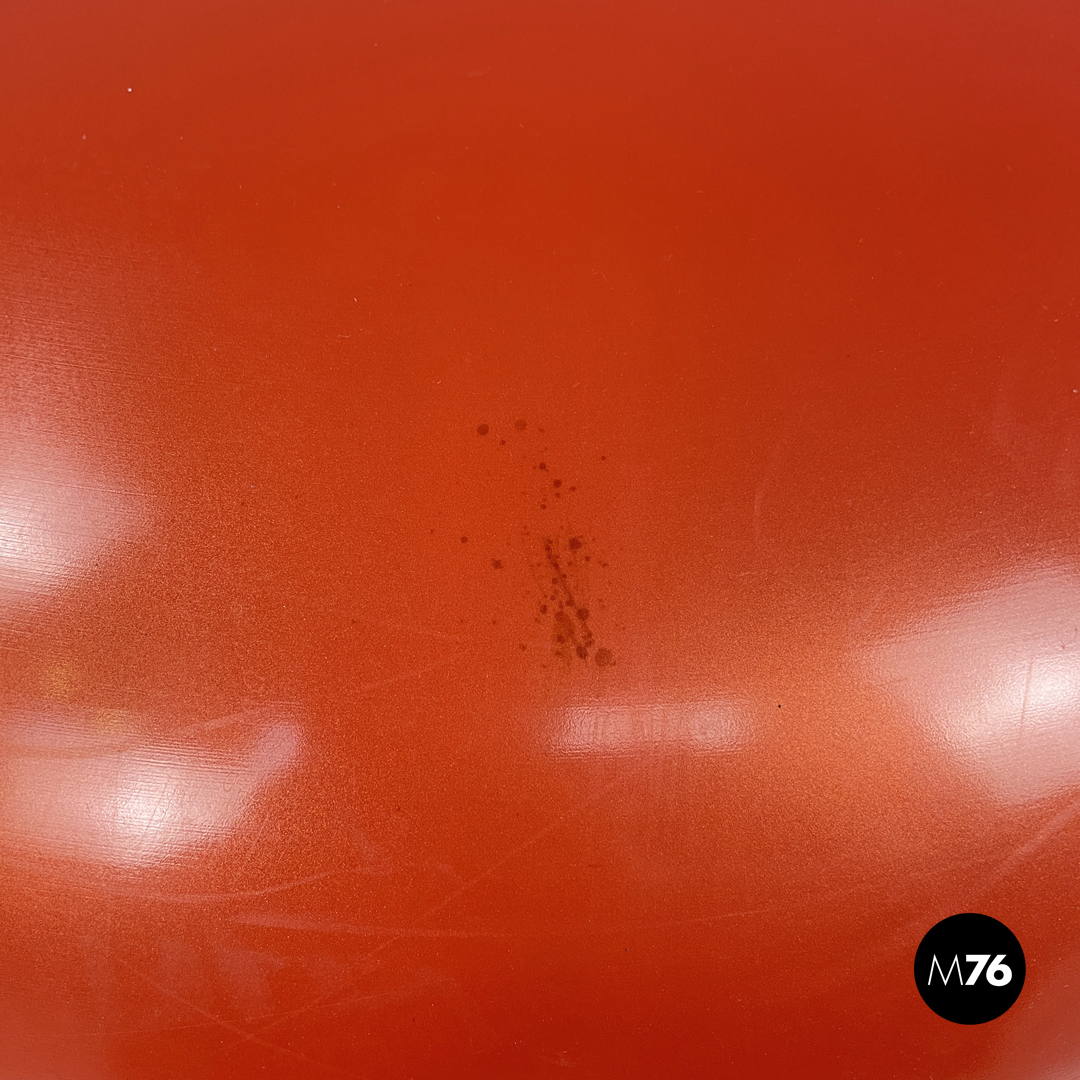 Coppia di pouf modello Globulo tondi in plastica rossa e giallo chiaro. La struttura presenta linee morbide e curve. Sotto alla base si trova un tappo in plastic gialla. Adatti anche per un ambiente esterno come un giardino un terrazzo o una veranda.