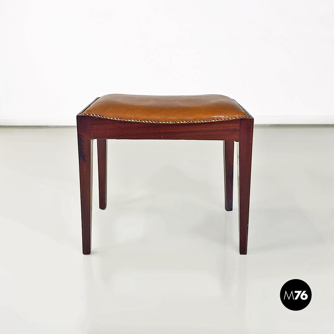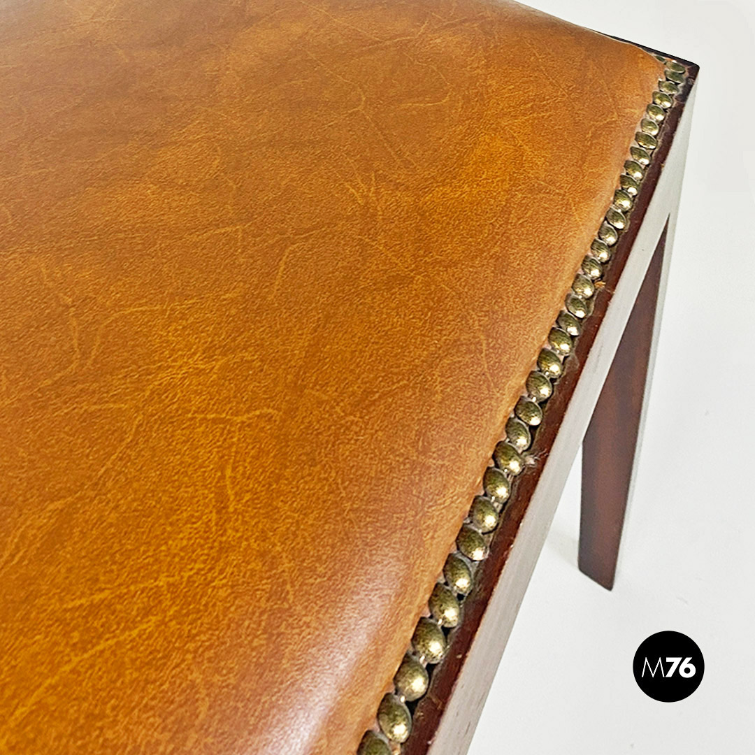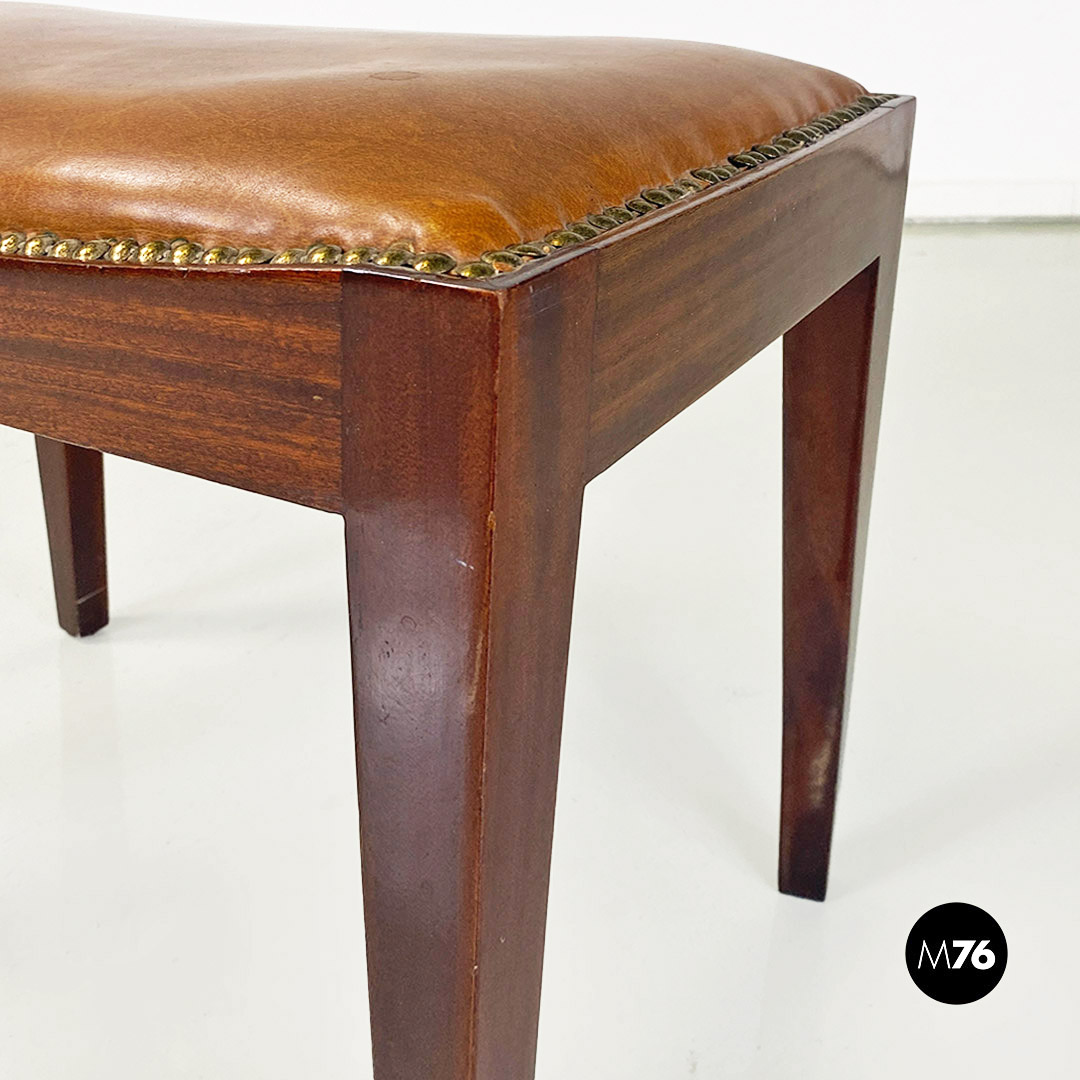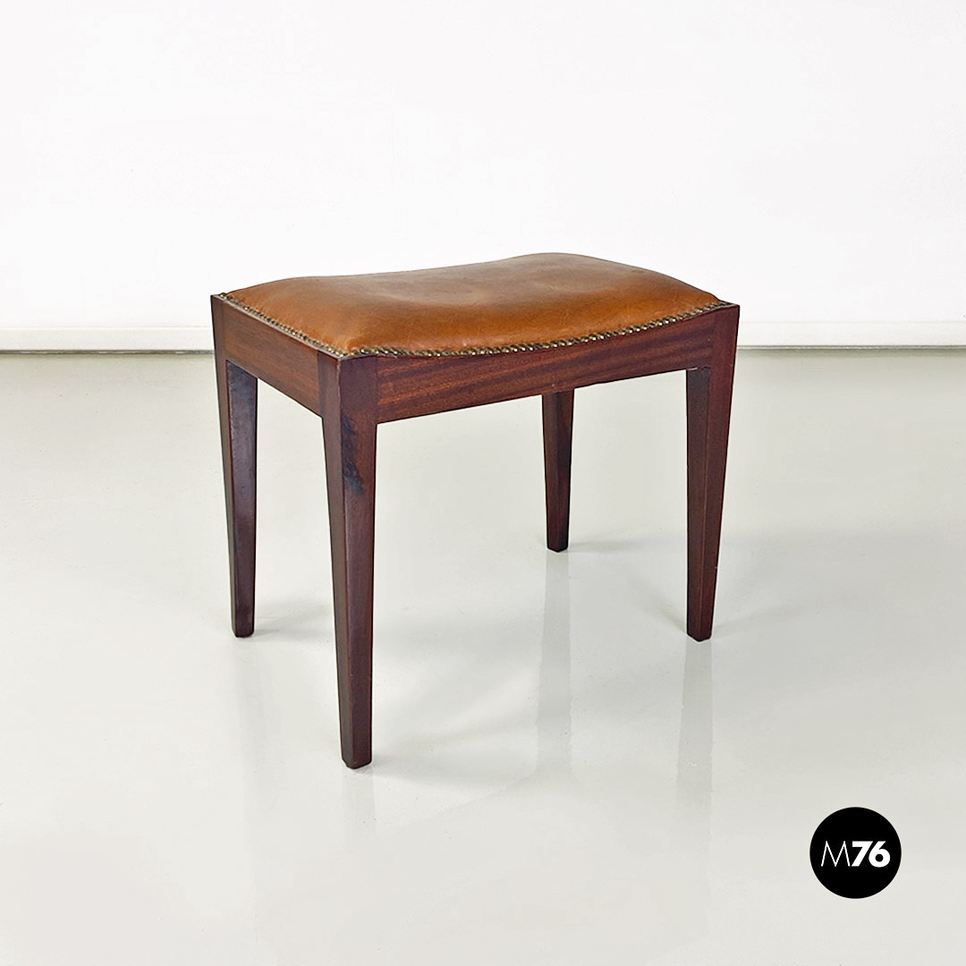 Poggiapiedi o pouf con seduta in cuoio marrone e struttura in legno massello scuro con borchie tonde in ottone sul perimetro della seduta. Utilizzabile anche come poggiapiedi.
