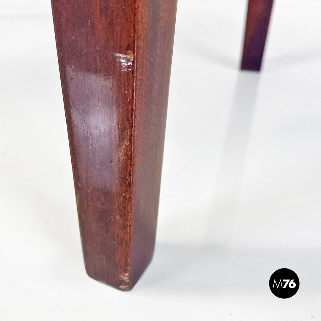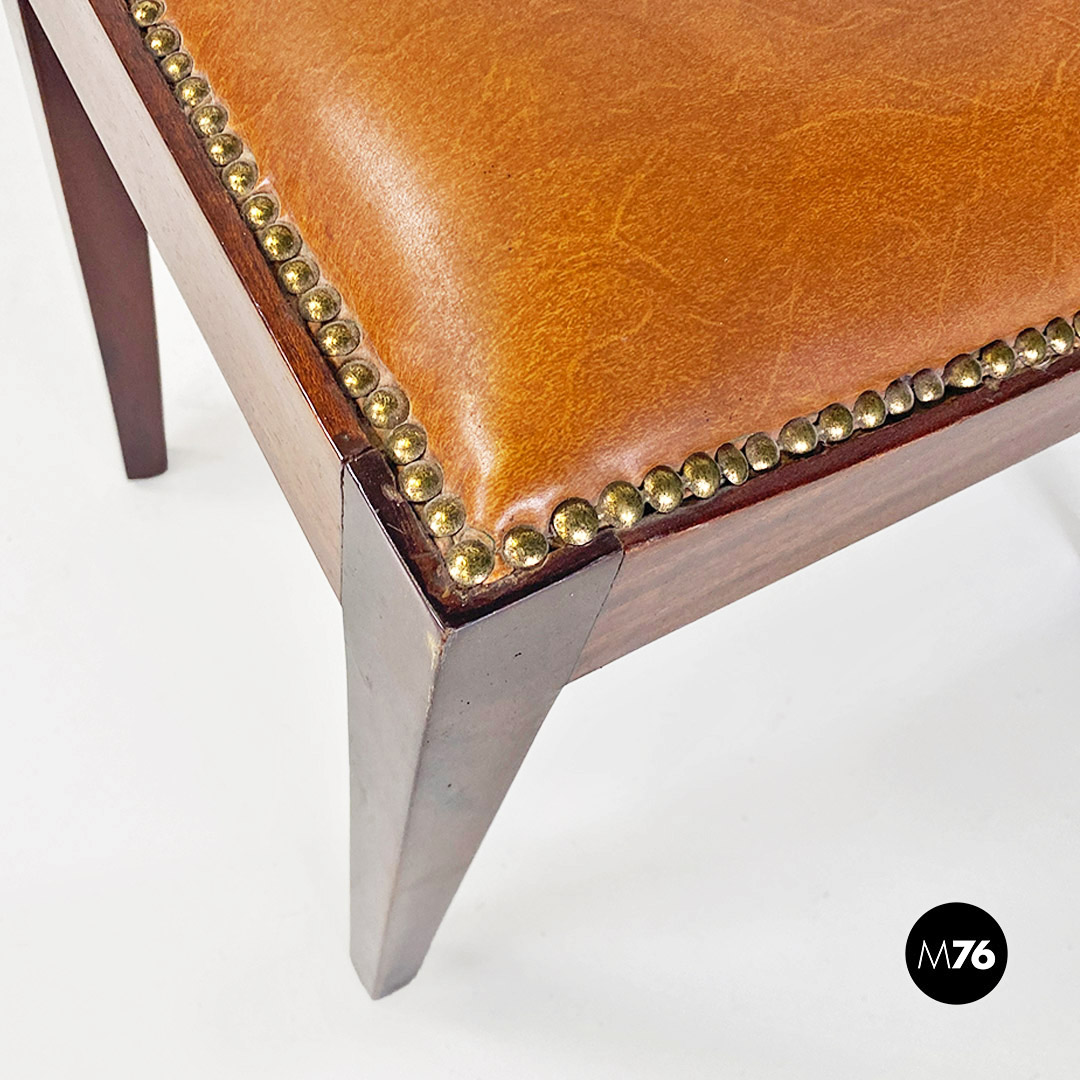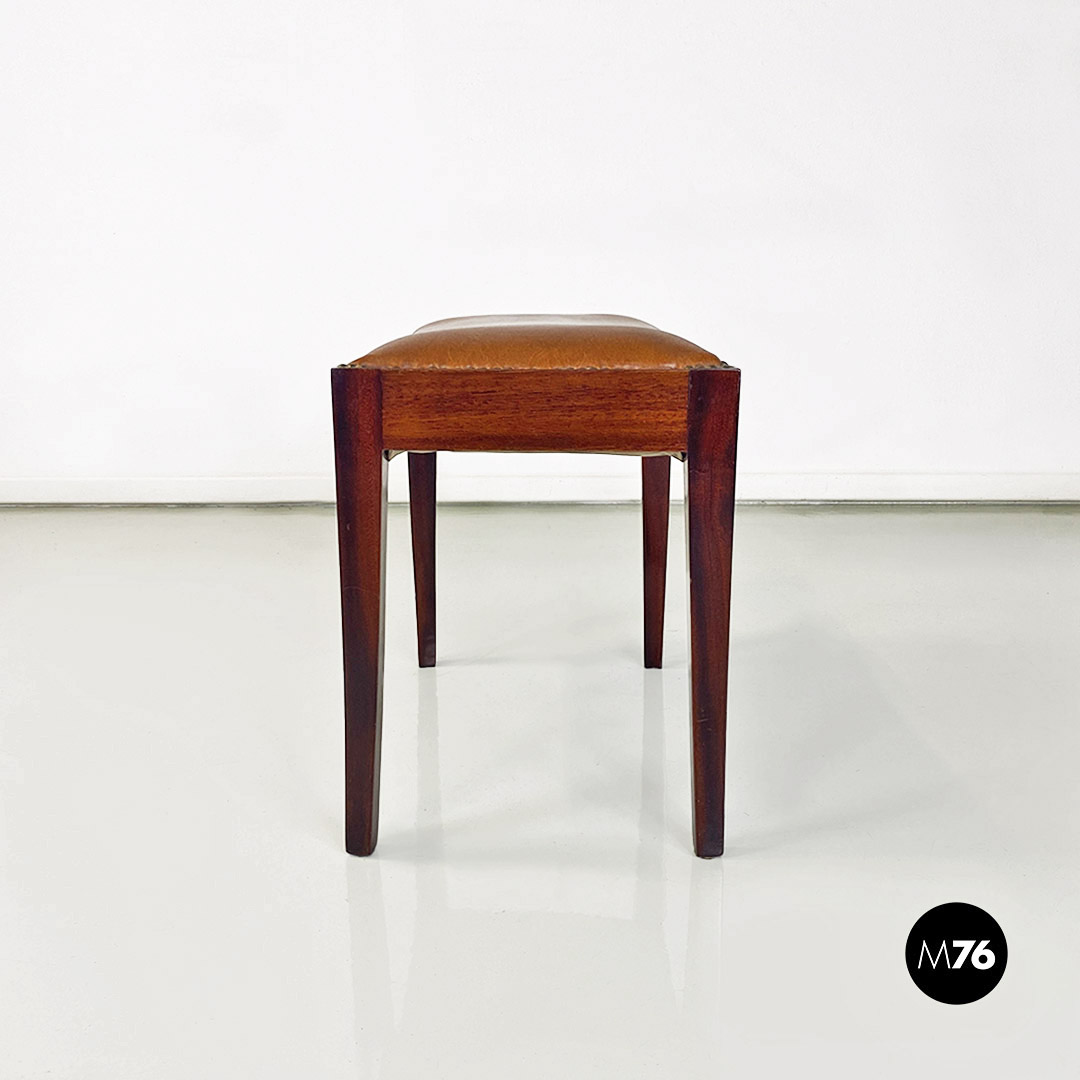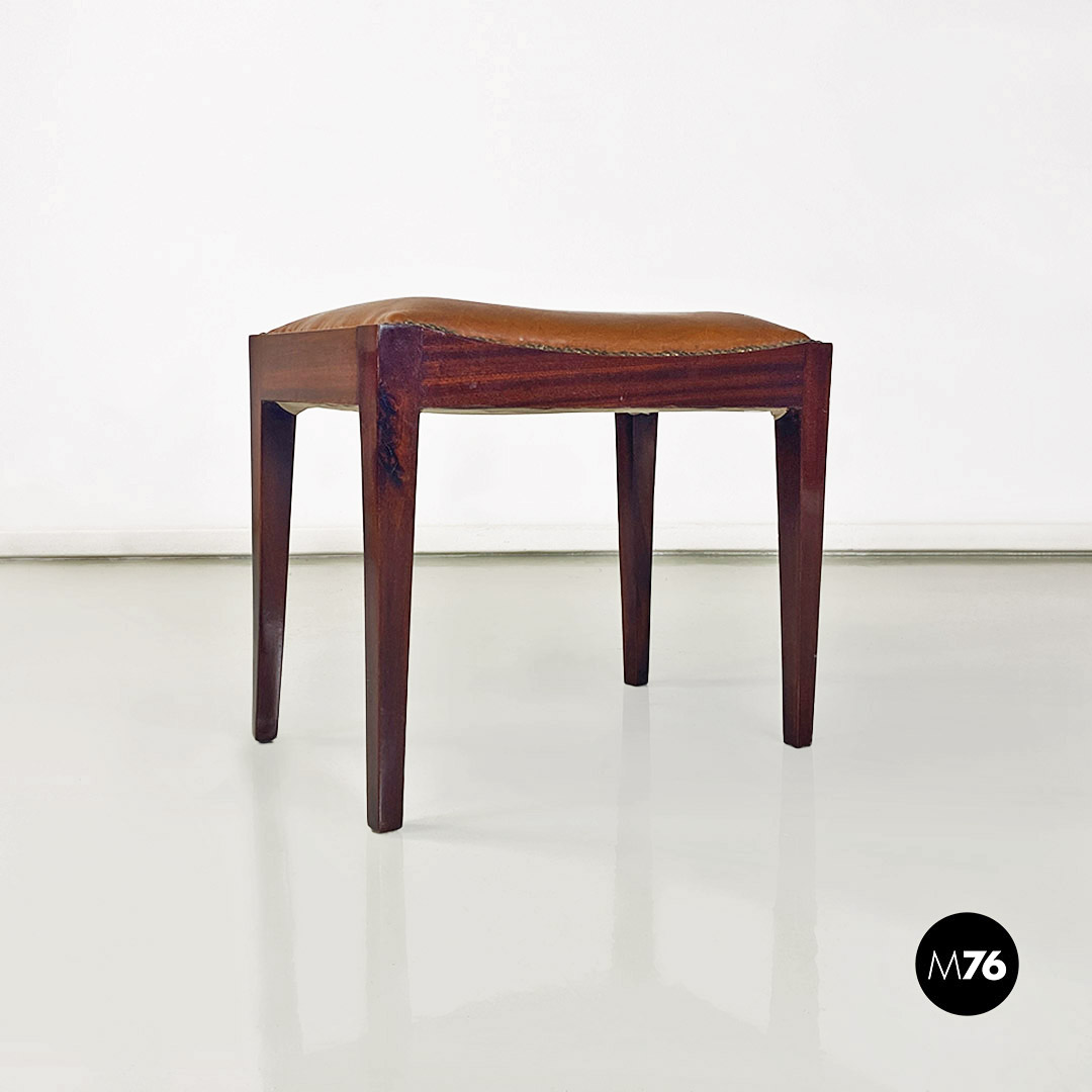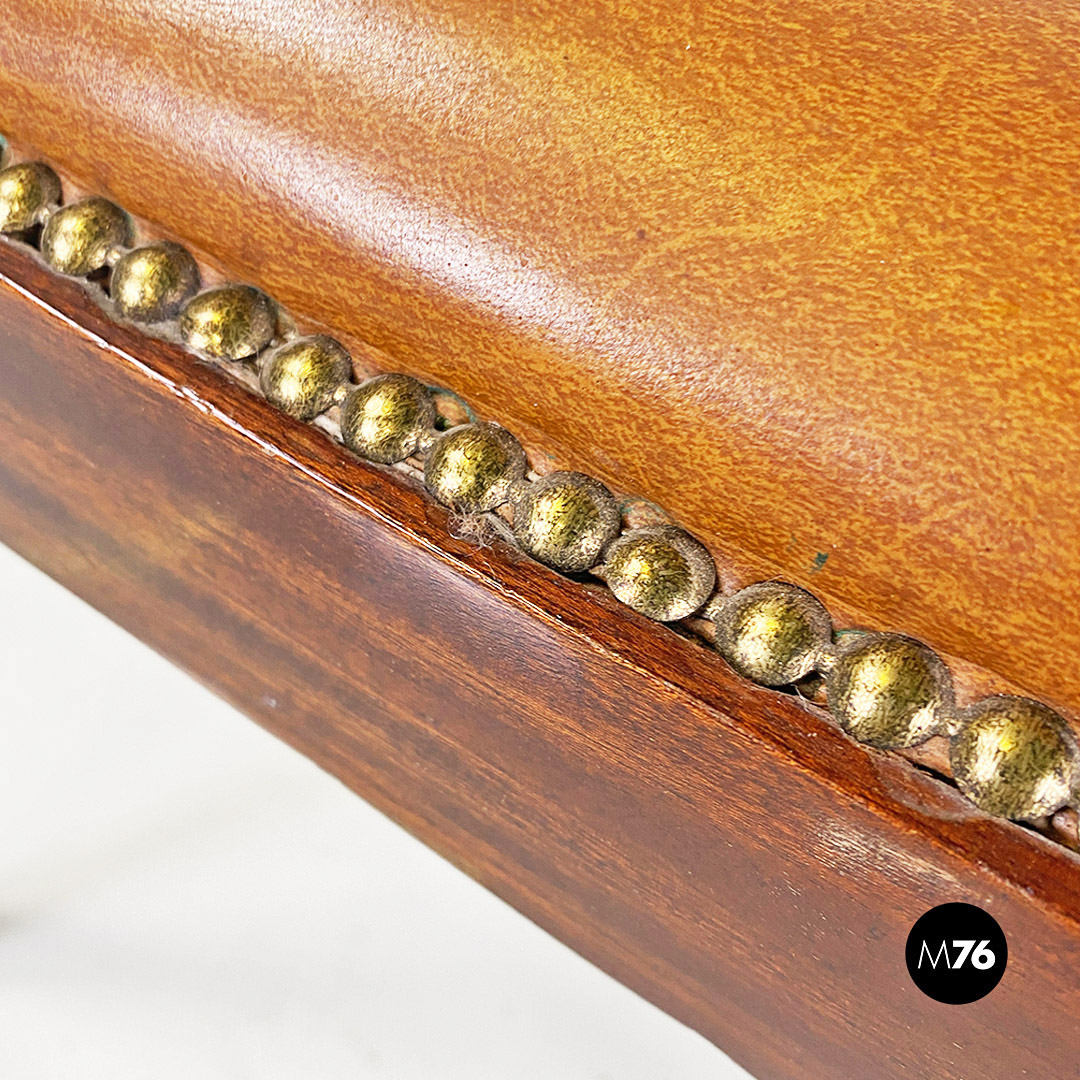 Poggiapiedi o pouf con seduta in cuoio marrone e struttura in legno massello scuro con borchie tonde in ottone sul perimetro della seduta. Utilizzabile anche come poggiapiedi.