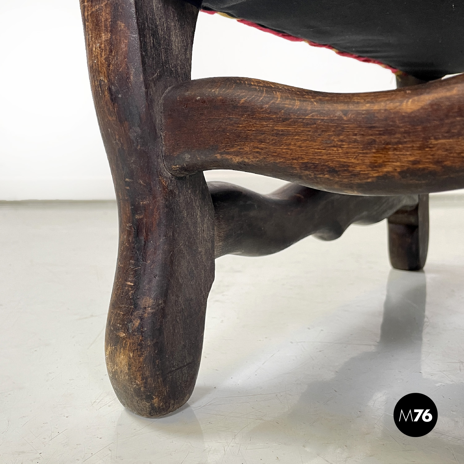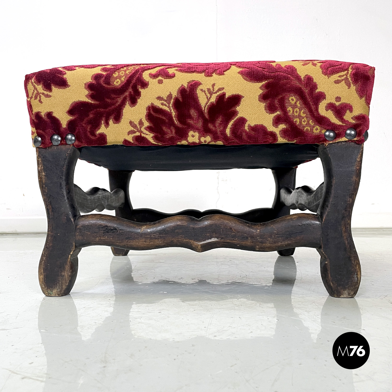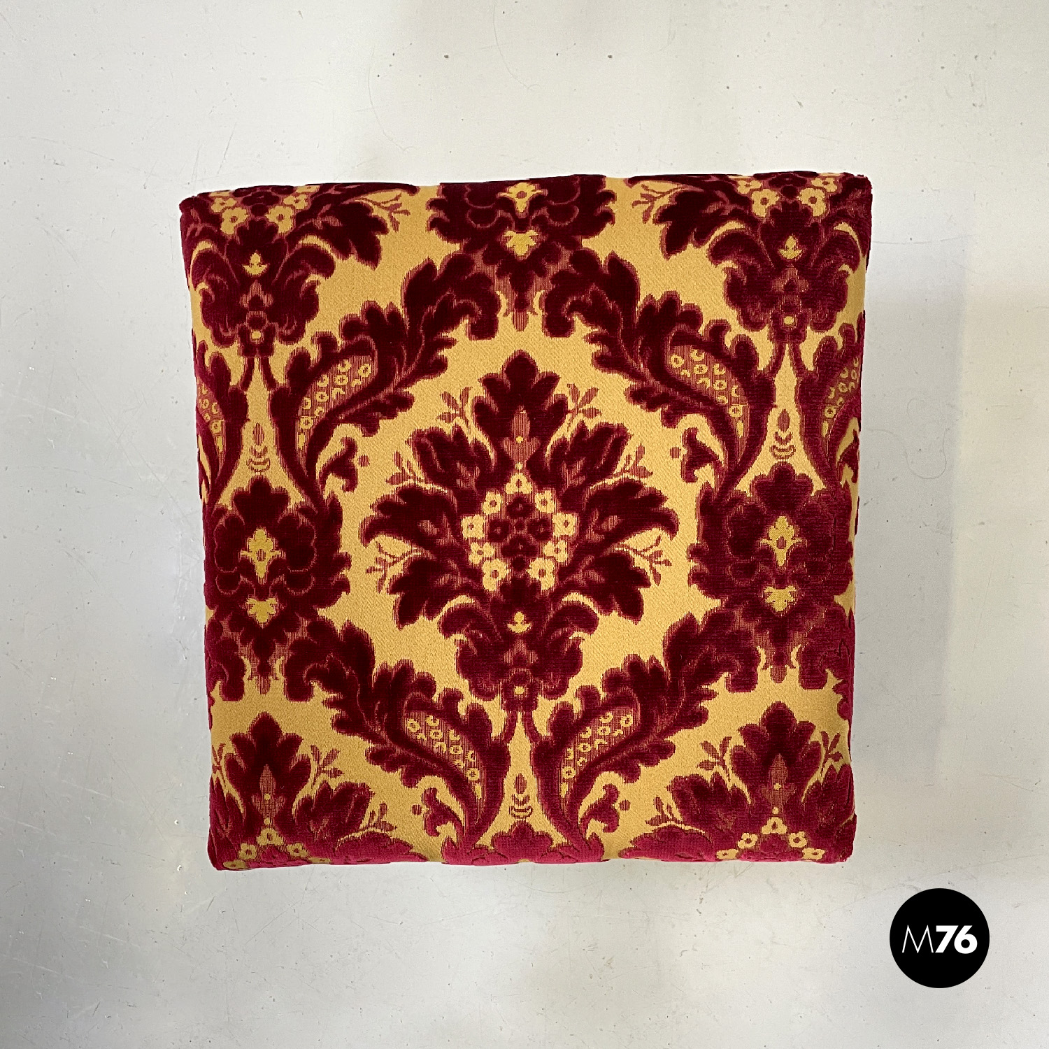 Coppia di pouf quadrati. Presentano la seduta imbottita e rivestita con un tessuto damascato giallo senape e rosso profondo la decorazione in rosso è in velluto ed è leggermente in rilievo. Il tessuto è fissato alla struttura con delle borchie tonde nere alle quattro gambe. La struttura delle gambe è in legno scuro tornito con quattro piccole traverse anch’esse lavorate. Utilizzabili anche come poggiapiedi.