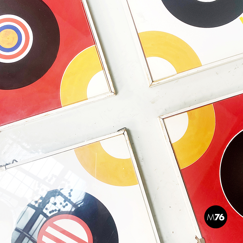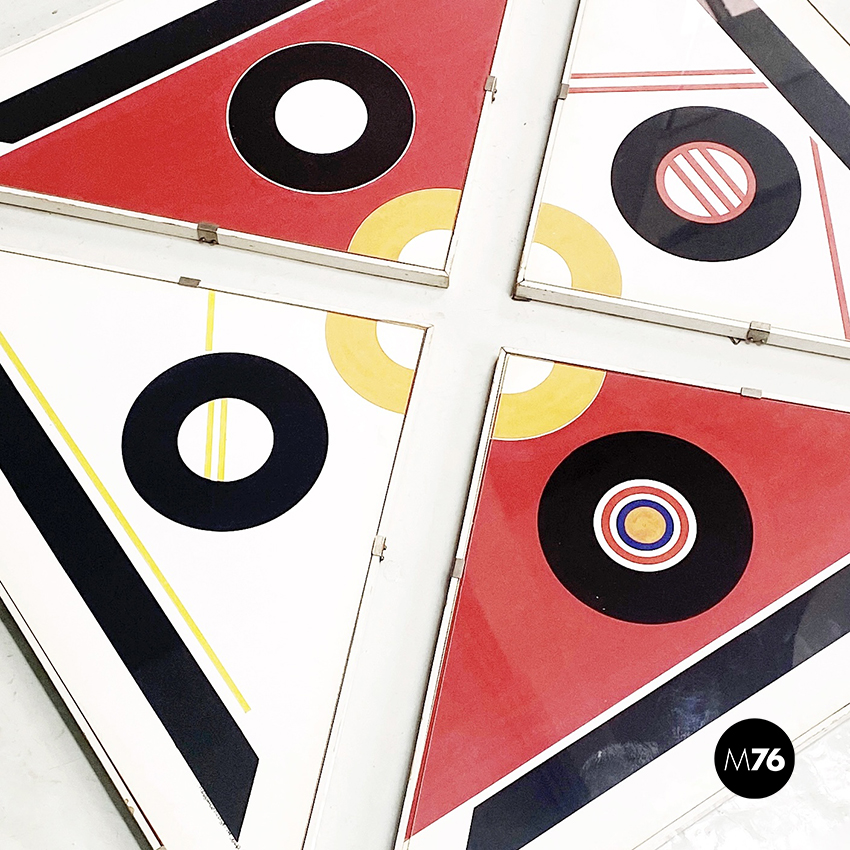 Set di quattro quadri di forma triangolare con stampe raffiguranti cerchi colorati e figure geometriche nei colori rosso nero bianco e giallo. Le cornici sono originali e realizzate su misura. Si possono creare composizioni come quella romboidale o quadrata rappresentata in foto.