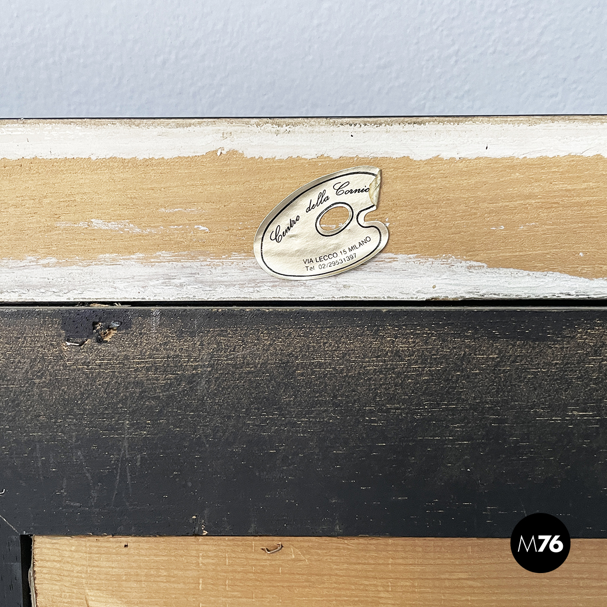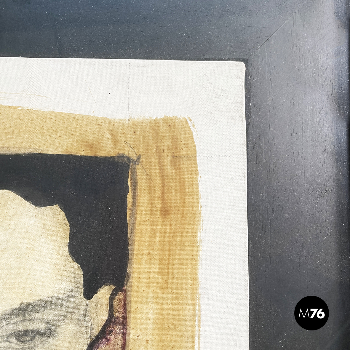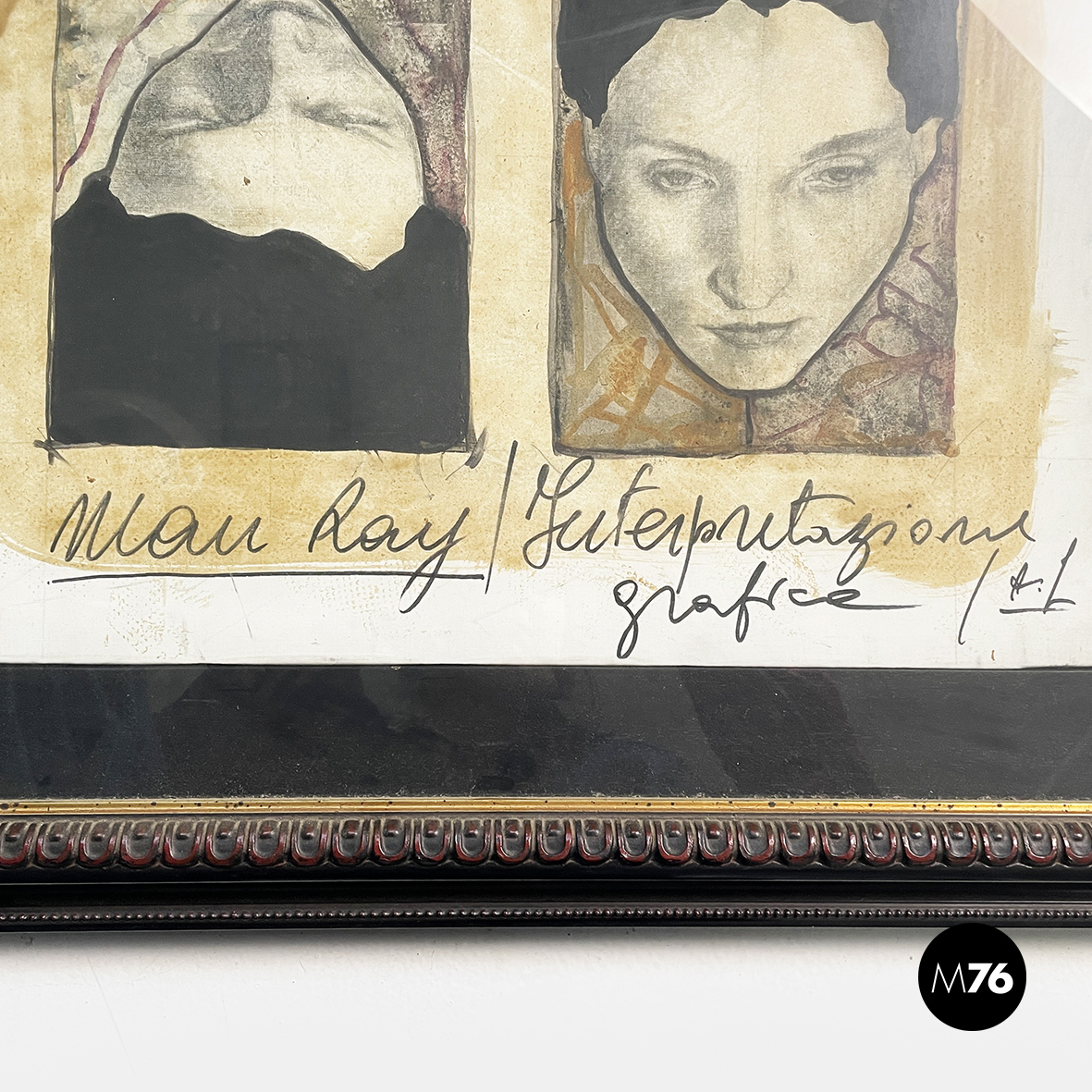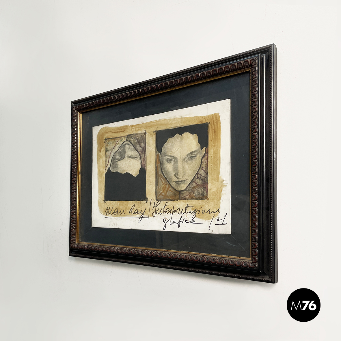 Quadro intitolato “Interpretazione grafica n.1” a tecnica mista su carta. L’opera raffigura due volti di donna uno dritto e uno capovolto con un outline grosso e nero. Lo sfondo è dipinto in un marrone tenue. Il foglio è fissato su un fondo nero. In cornice di legno scuro finemente lavorata con un motivo ripetuto e con dettaglio in oro.