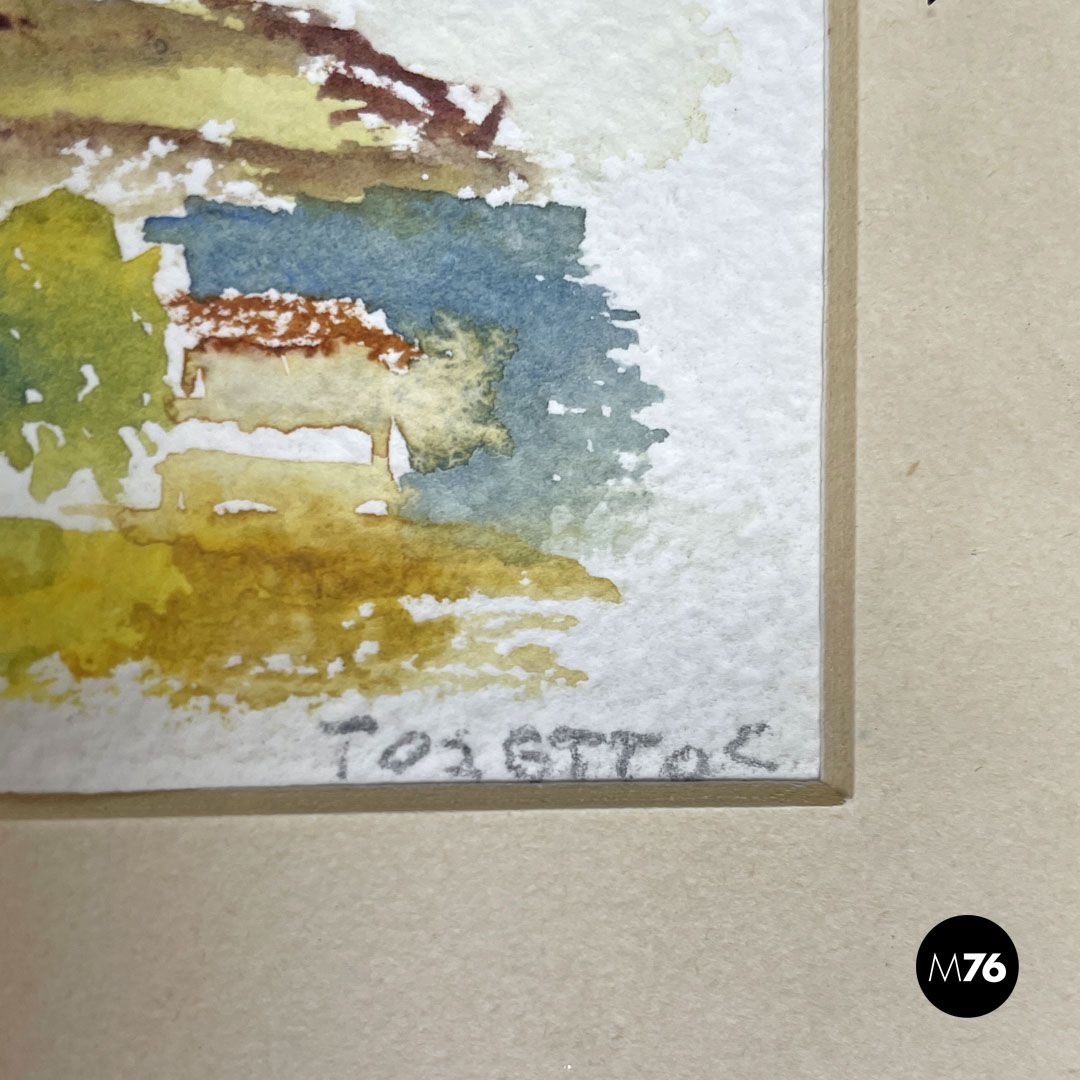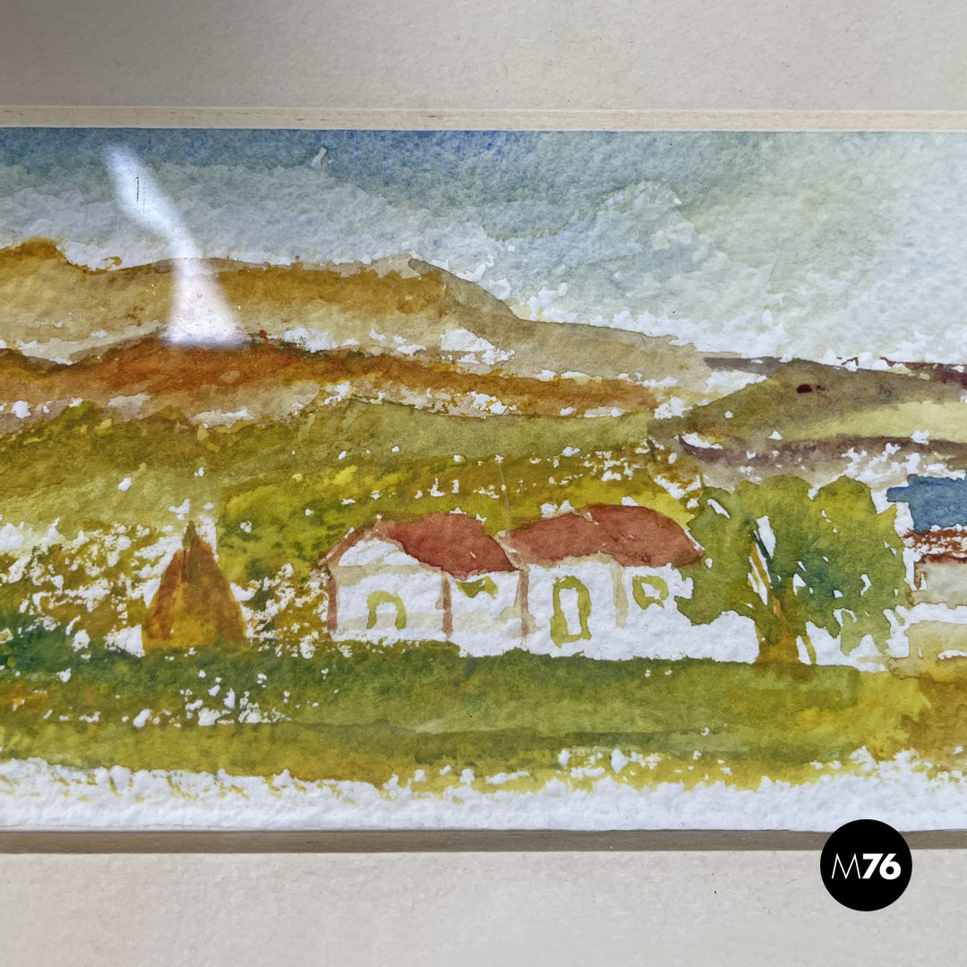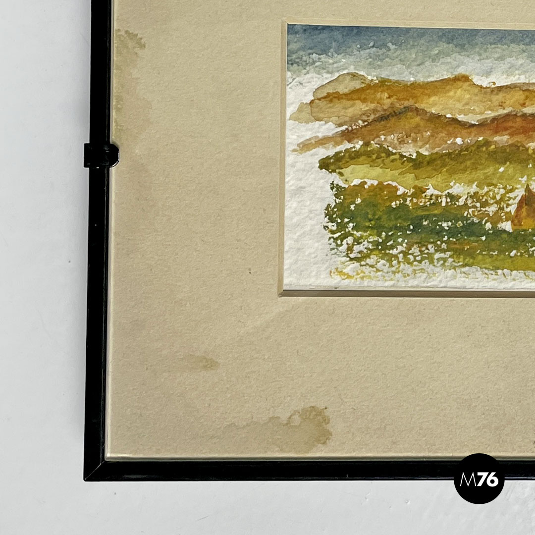 Quadro ad acquerello con cornice rettangolare in legno laccato nero e passe-partout. Il dipinto rappresenta un paesaggio di campagna con due case case in prima piano dai colori caldi sul tono del beige e del giallo per la natura e celeste per il cielo. Sulla cornice sono presenti quattro elementi in metallo anch’essi neri.