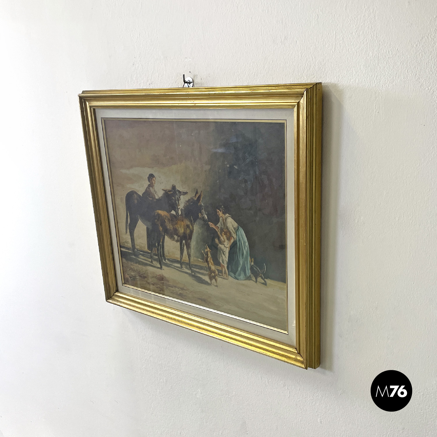 Dipinto ad olio con cornice rettangolare. Il quadro rappresenta due asini accompagnati da una ragazza un’altra figura femminile con un bambino un cane e un gatto in un ambiente agricolo. I colori sono principalmente sui toni del beige e del marrone fatta eccezione per la gonna celeste della donna sulla destra. Presenta una cornice in legno dorato con passepartout interno.
