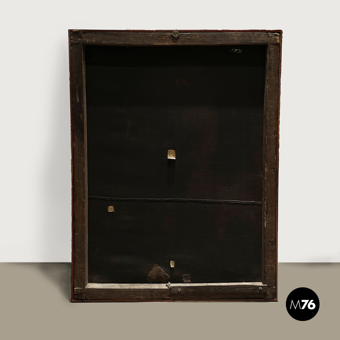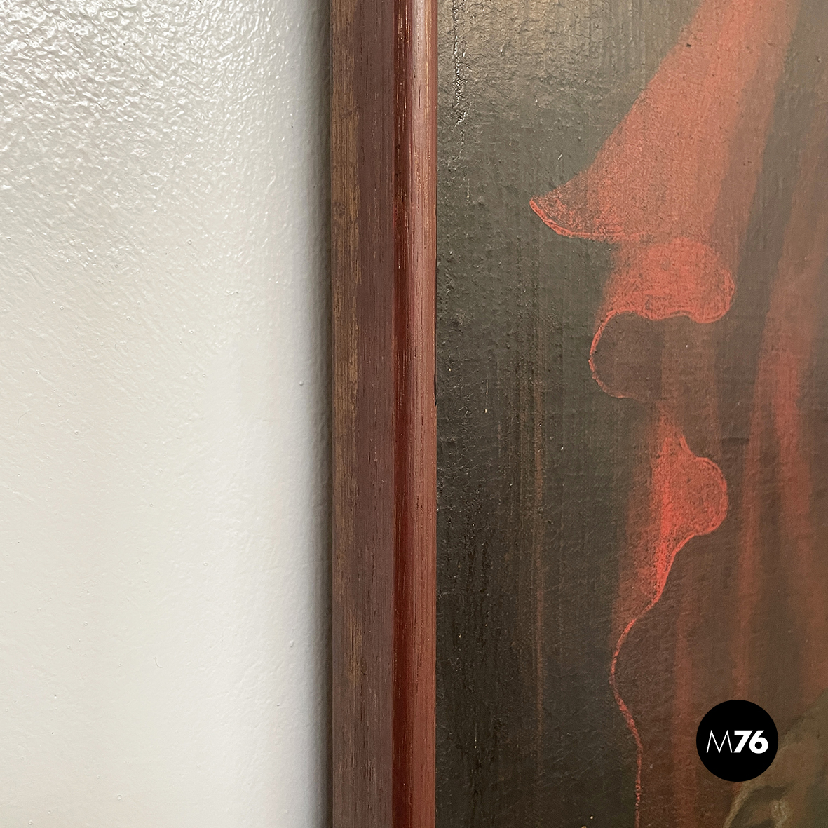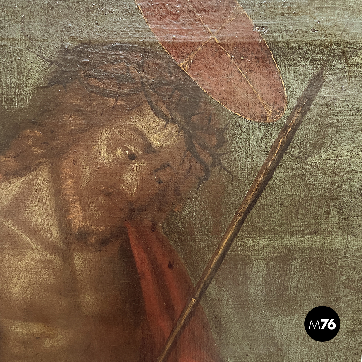 Quadro ad olio su tela con soggetto sacro. Il dipinto raffigura Gesù Cristo seduto e vestito con solo il drappo bianco (perizonium) con la corona di spine e l’aureola in testa in mano tiene un bastone ed è cinto con un drappo rosso. Lo sfondo è in verdone scuro mentre il pavimento è color mattone. In cornice di legno.