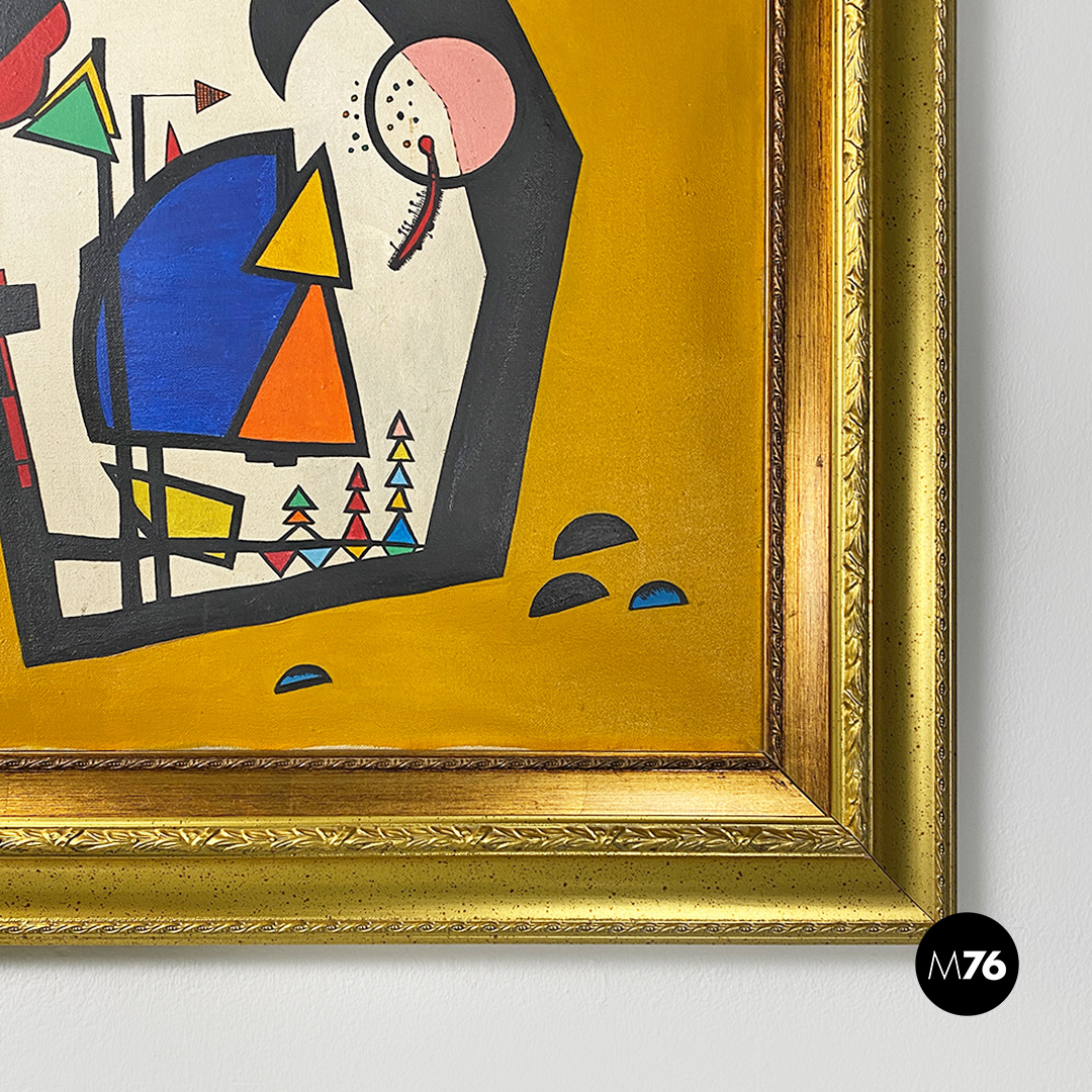 Quadro intitolata Anamnesi su tela a pittura acrilica. Il soggetto è astratto con forme geometriche multicolore su fondo color mostarda e cornice in legno con fregi con finitura dorata.