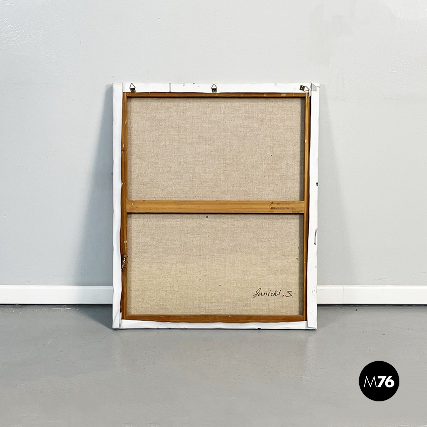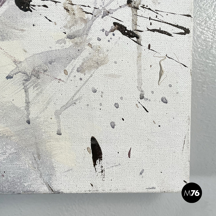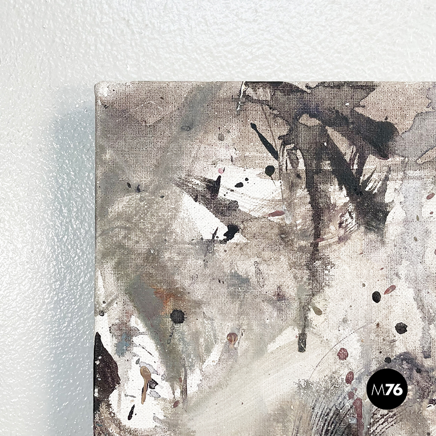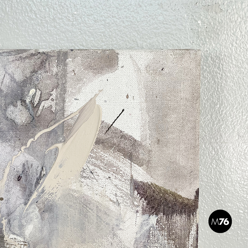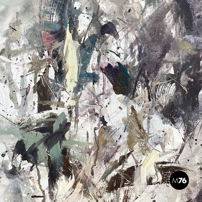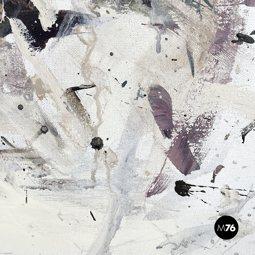 Quadro astratto a tecnica mista su tela bianca. I colori presenti spaziano dal beige al viola al verdone e al grigio. Telaio in legno.
