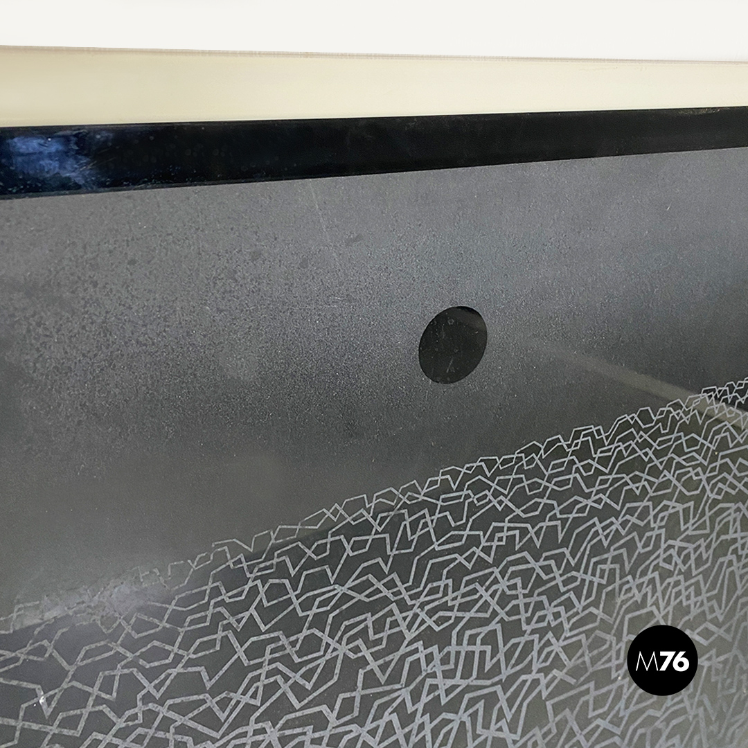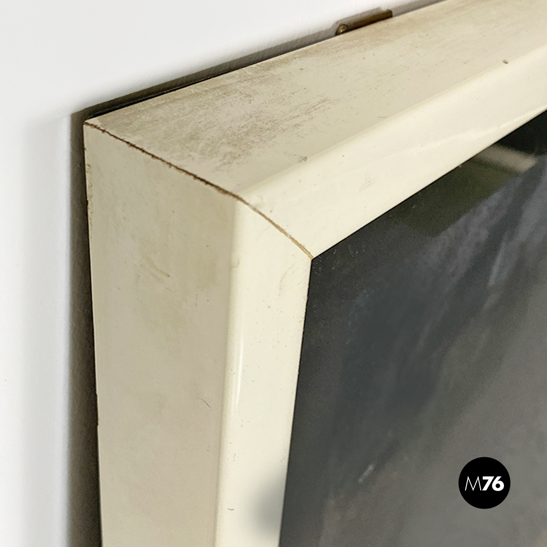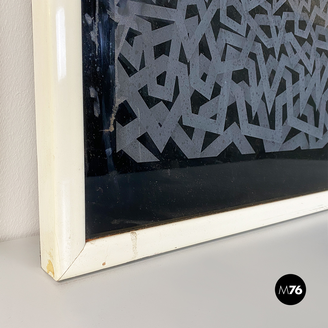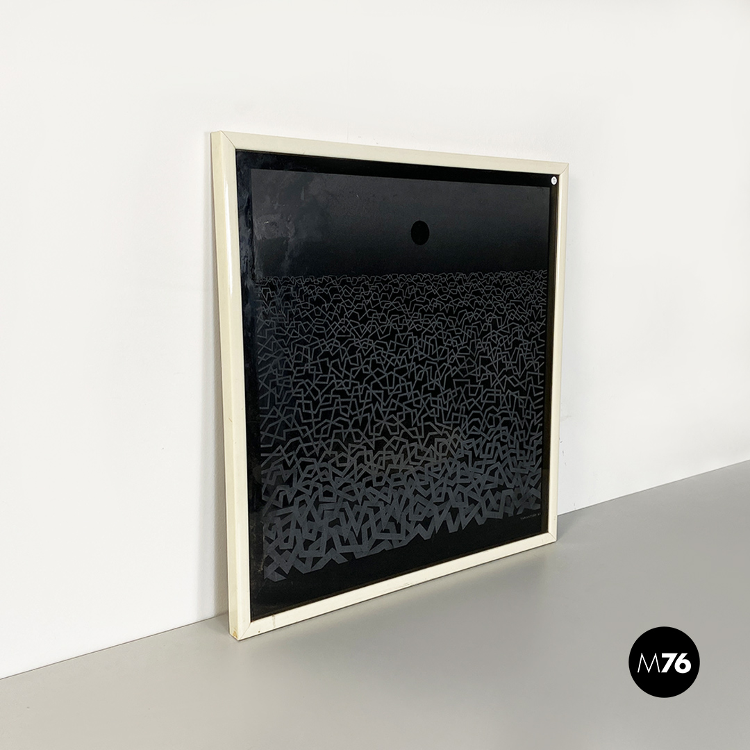 Opera su vetro con fondo nero e disegno satinato raffigurante una distesa d’acqua ed un sole o luna in fase calante. Cornice in legno bianco.