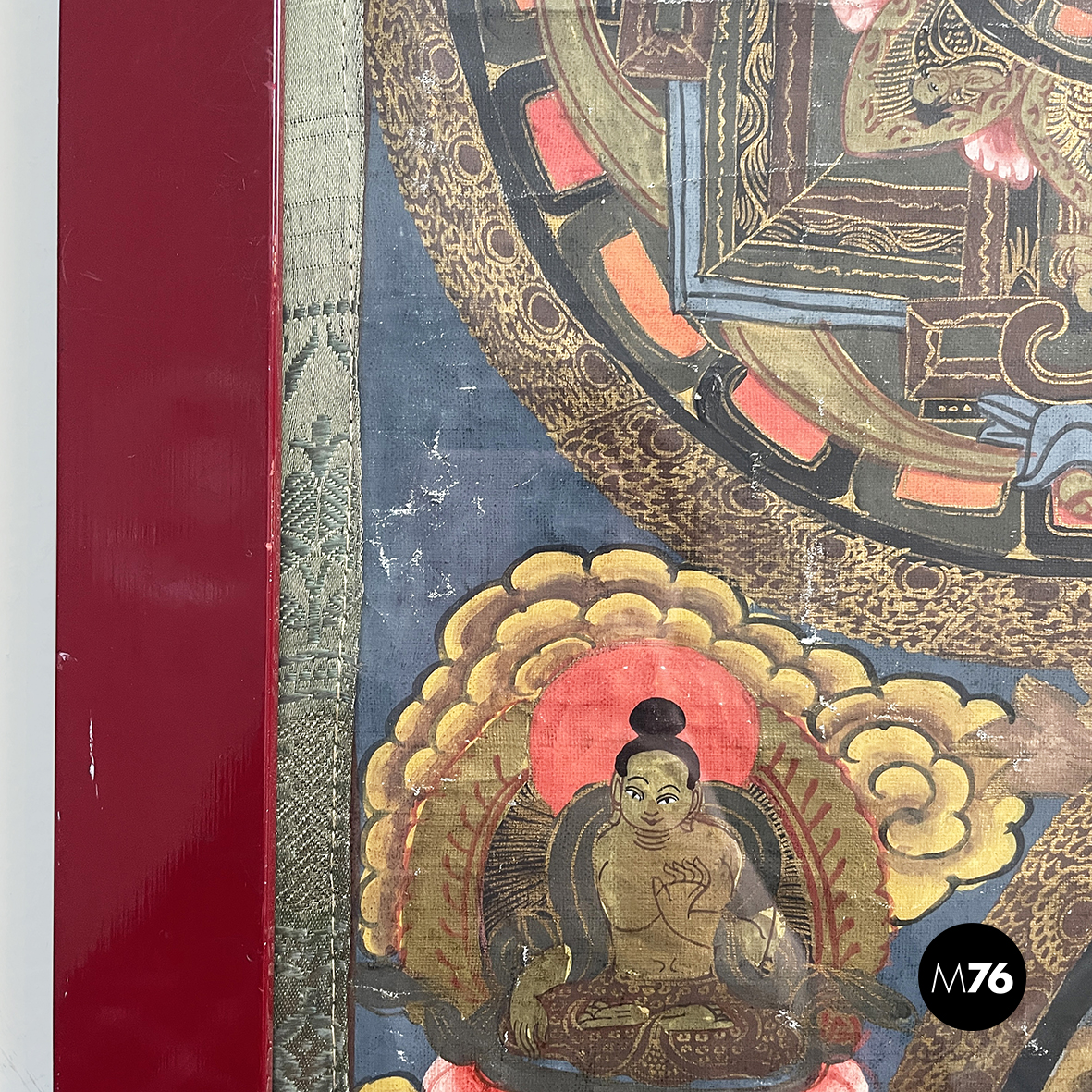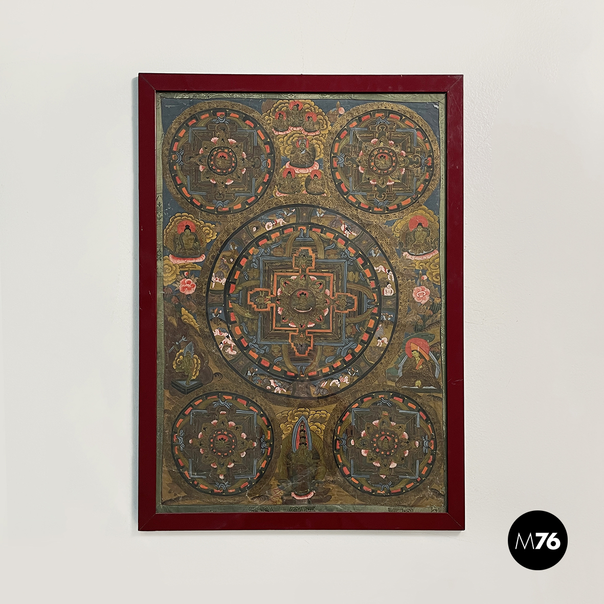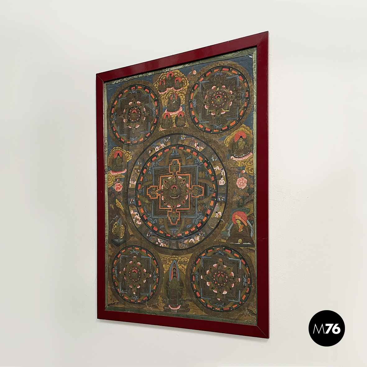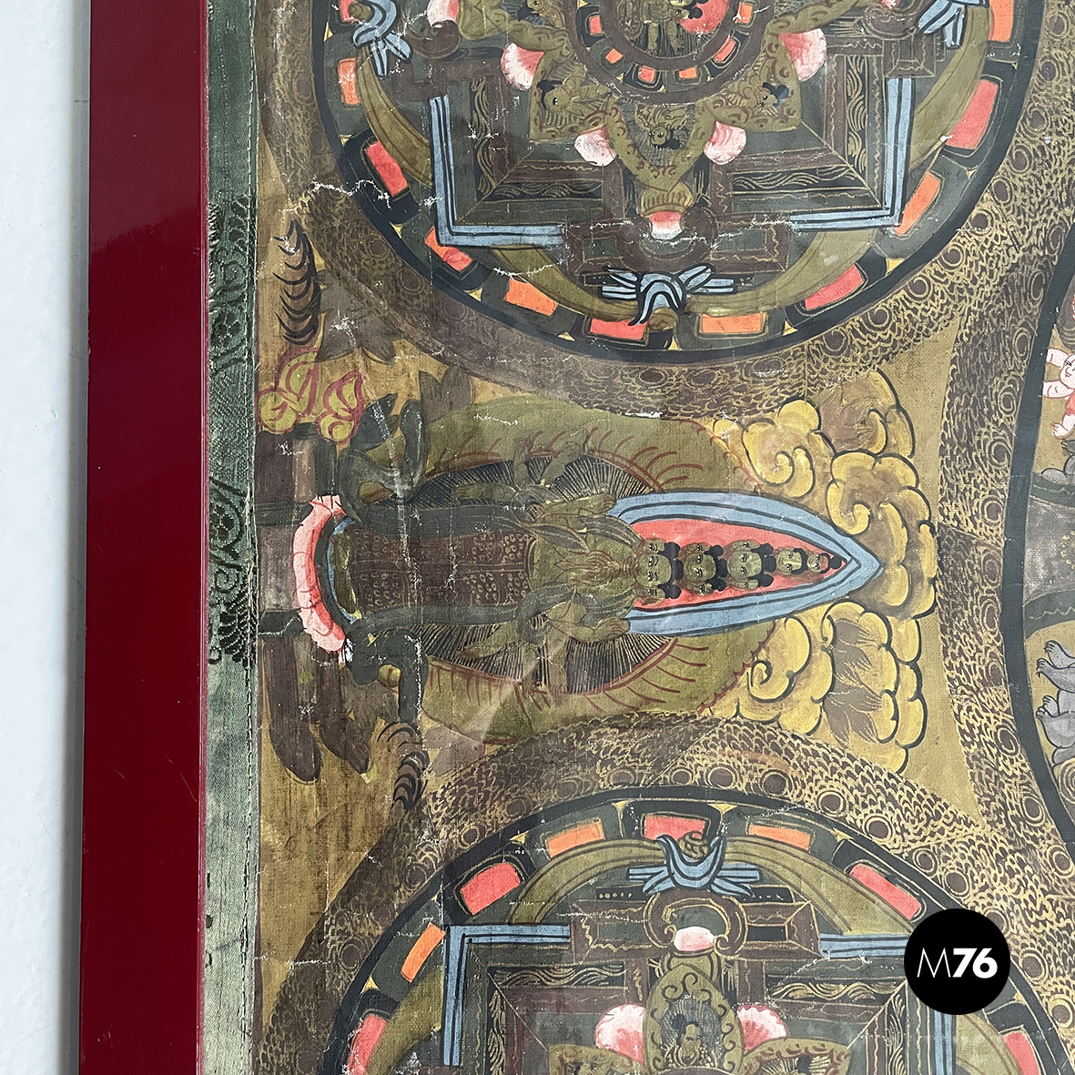 Quadro dipinto con la tecnica batik su tessuto. La struttura del dipinto è divisa in ciqnue cerchi uno per angolo più uno centrale. In ogni cerchio e tra i cerchi sono presenti diversi dei e figure appartenenti alla religione indiana. I colori del dipinto spaziano dal rosso all’azzurro al verde al giallo dorato. In cornice di legno verniciata bordeaux.