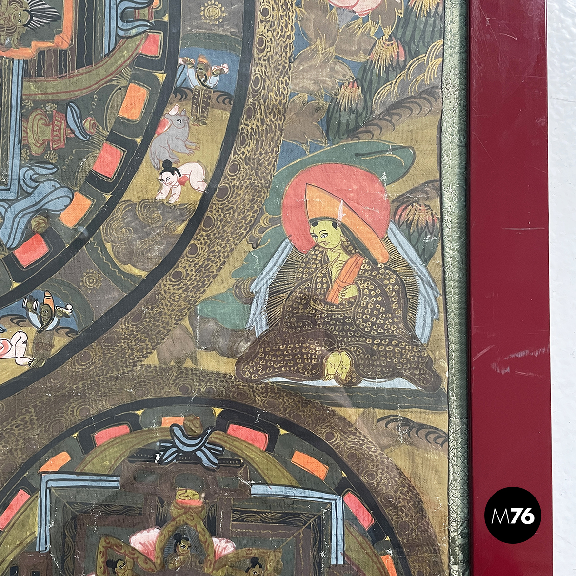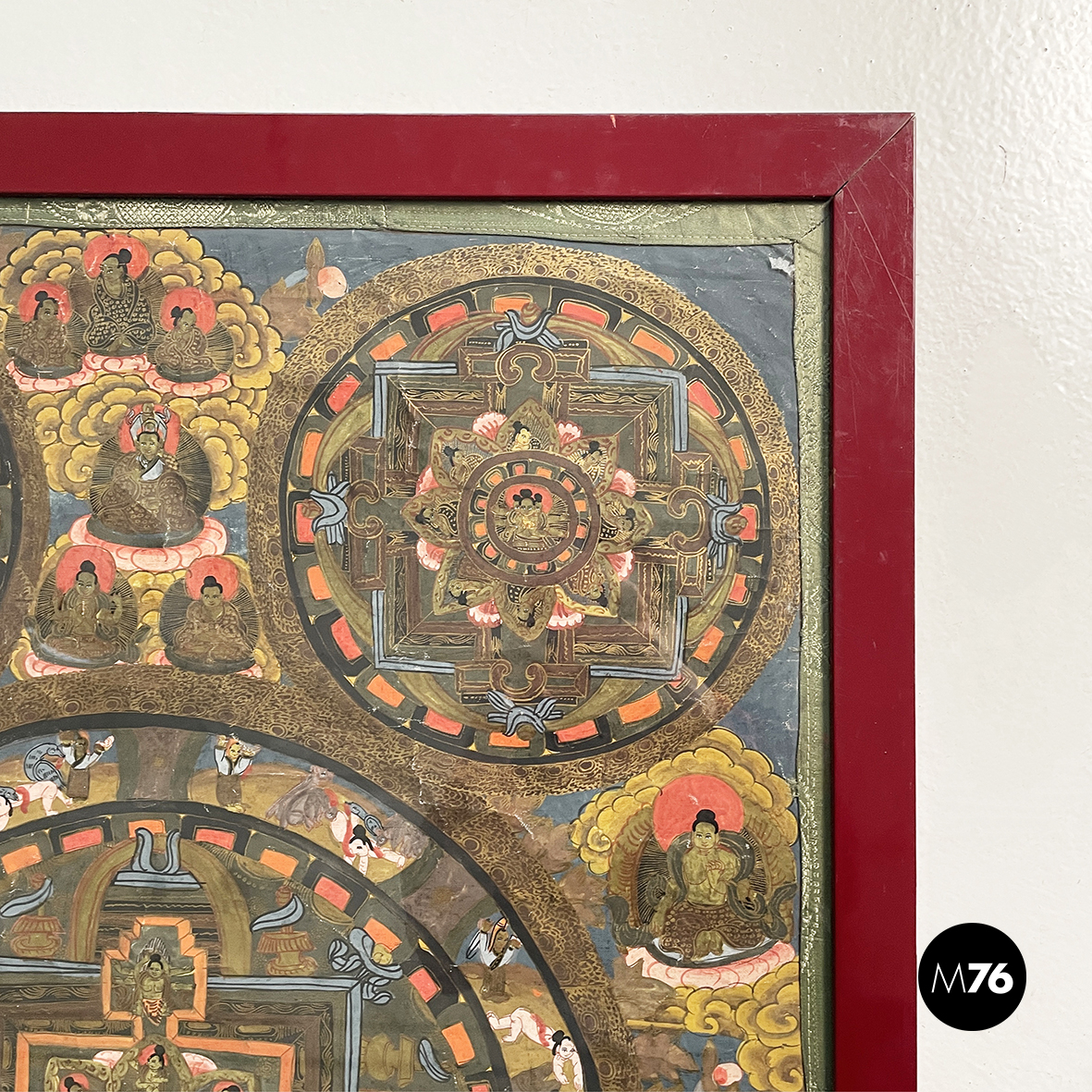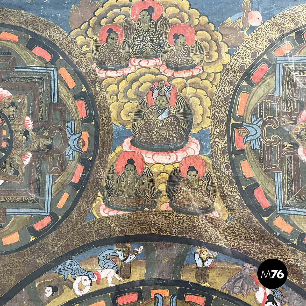 Quadro dipinto con la tecnica batik su tessuto. La struttura del dipinto è divisa in ciqnue cerchi uno per angolo più uno centrale. In ogni cerchio e tra i cerchi sono presenti diversi dei e figure appartenenti alla religione indiana. I colori del dipinto spaziano dal rosso all’azzurro al verde al giallo dorato. In cornice di legno verniciata bordeaux.