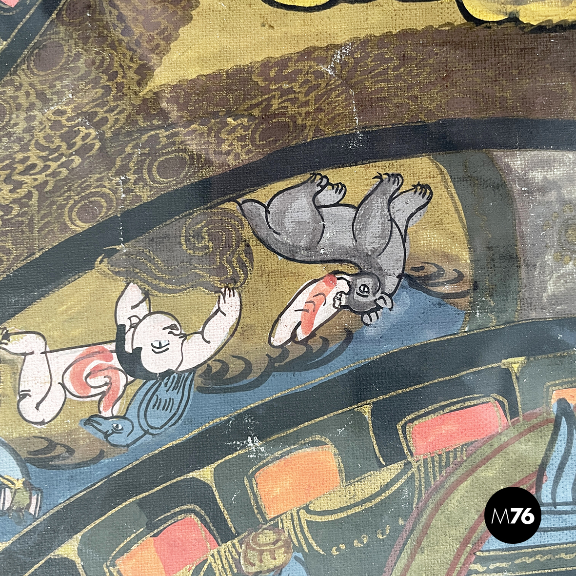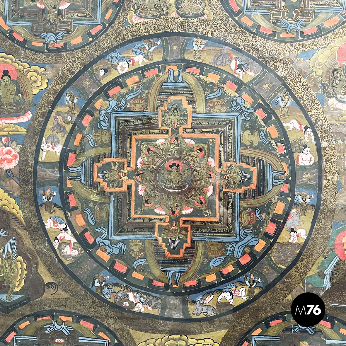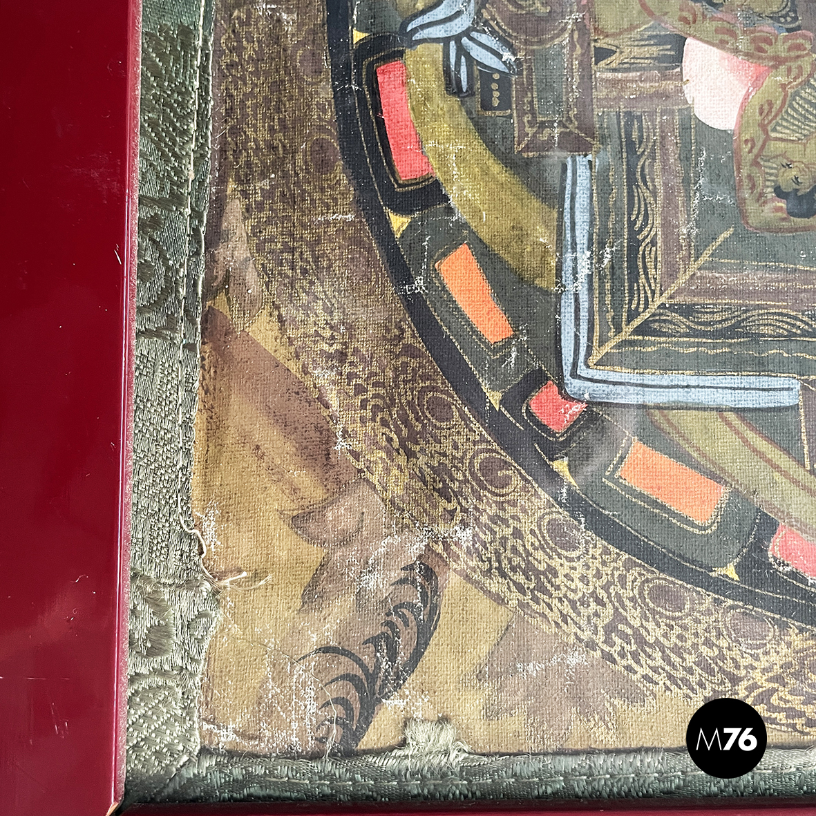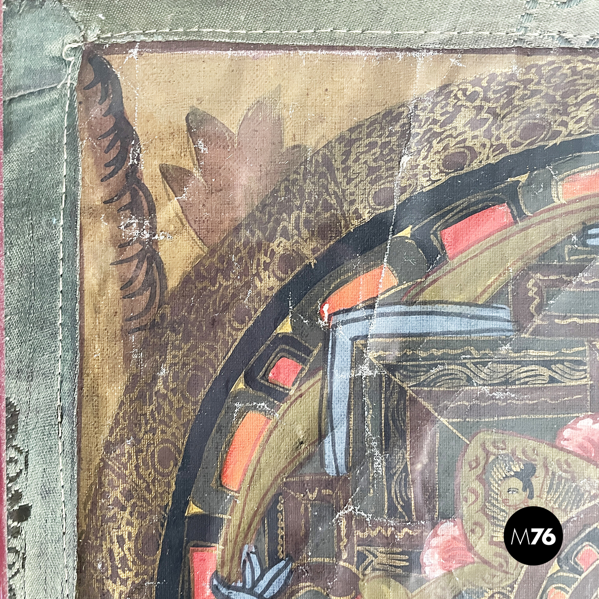 Quadro dipinto con la tecnica batik su tessuto. La struttura del dipinto è divisa in ciqnue cerchi uno per angolo più uno centrale. In ogni cerchio e tra i cerchi sono presenti diversi dei e figure appartenenti alla religione indiana. I colori del dipinto spaziano dal rosso all’azzurro al verde al giallo dorato. In cornice di legno verniciata bordeaux.