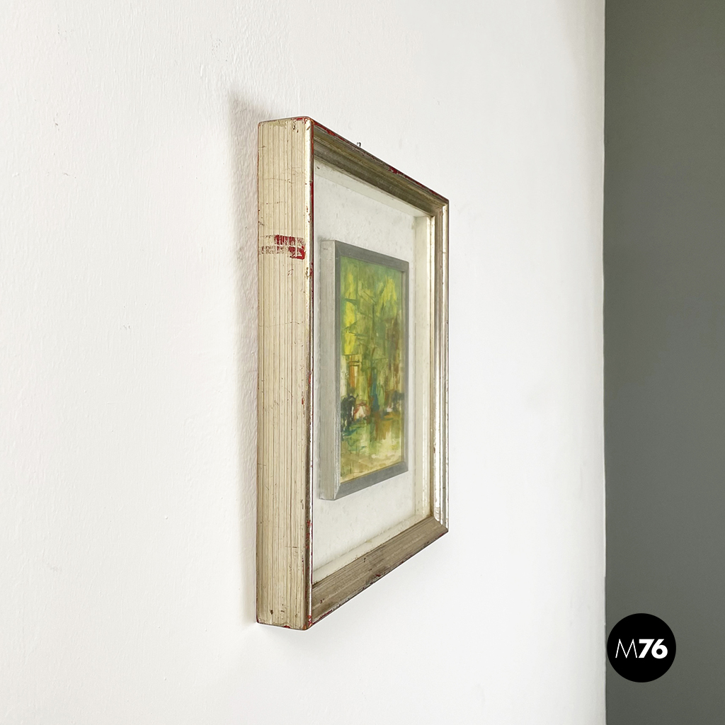 Quadro a tecnica mista con soggetto in stile astratto di una casa in mezzo alla natura. Il quadro presenta una prima cornice in metallo inserita in un passepartout bianco. Cornice esterna in legno argentato.