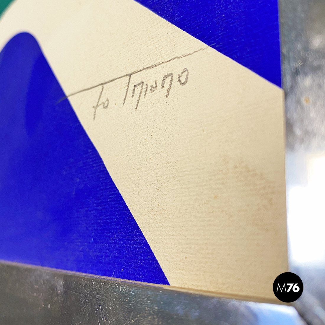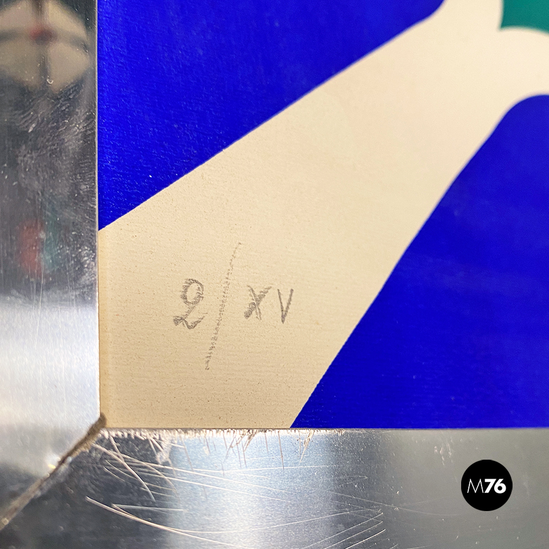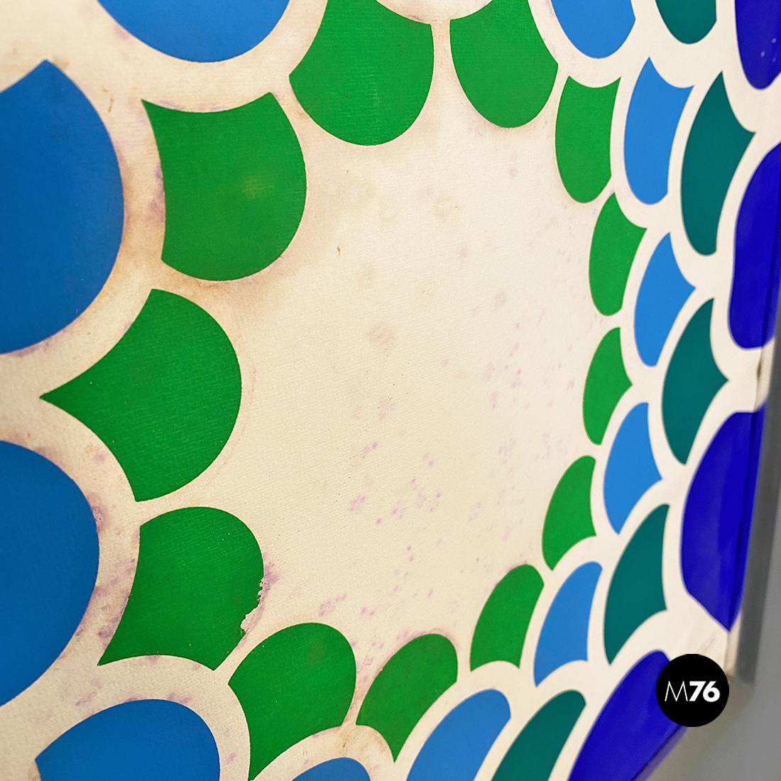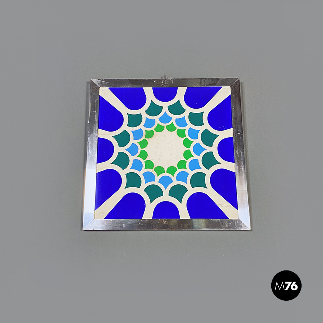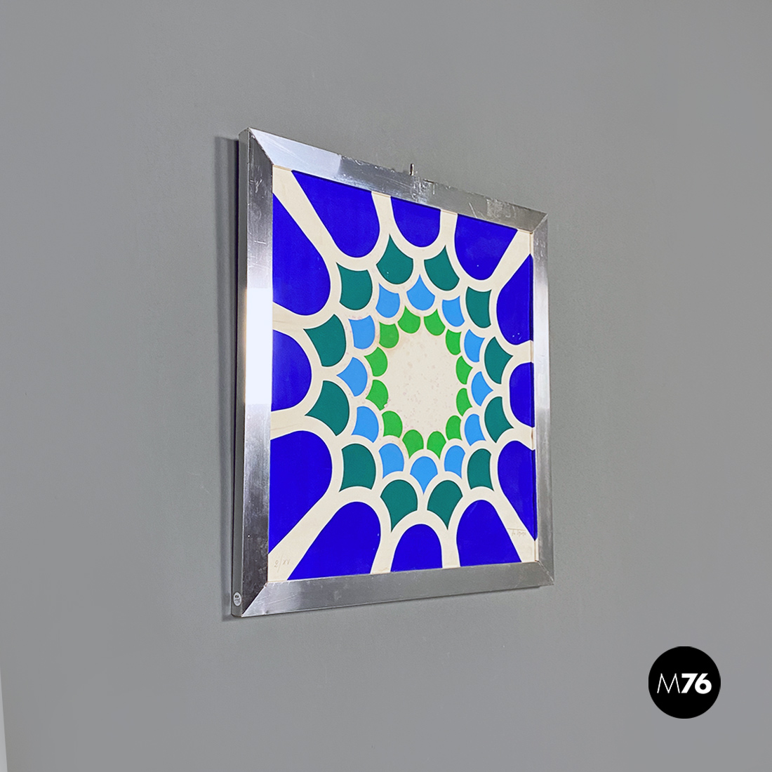 Quadro con cornice in acciaio cromato e disegno astratto sui toni del blu bianco e verde ricorda i motivi optical tipici del periodo Space Age. Privo di vetro o plexiglass a copertura.