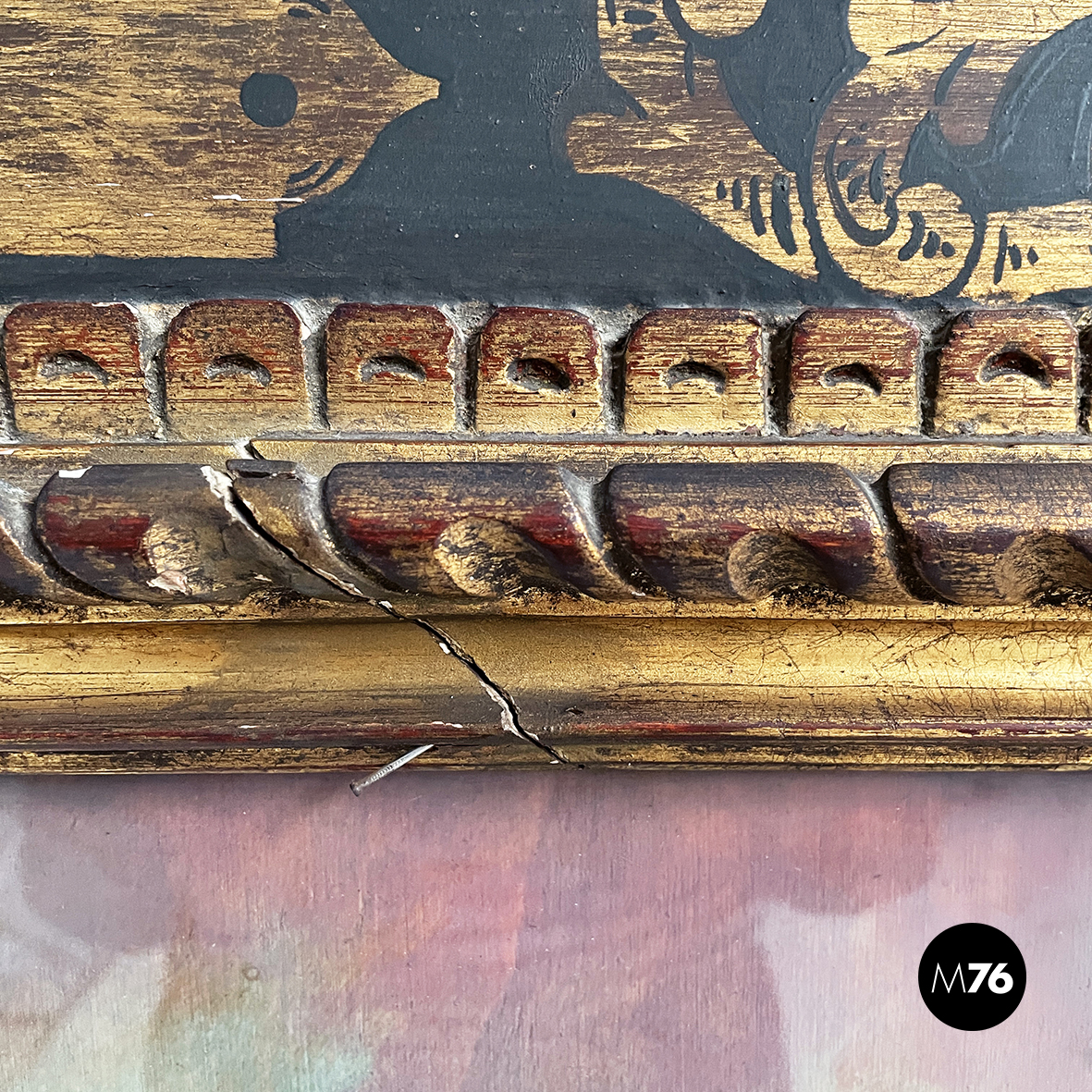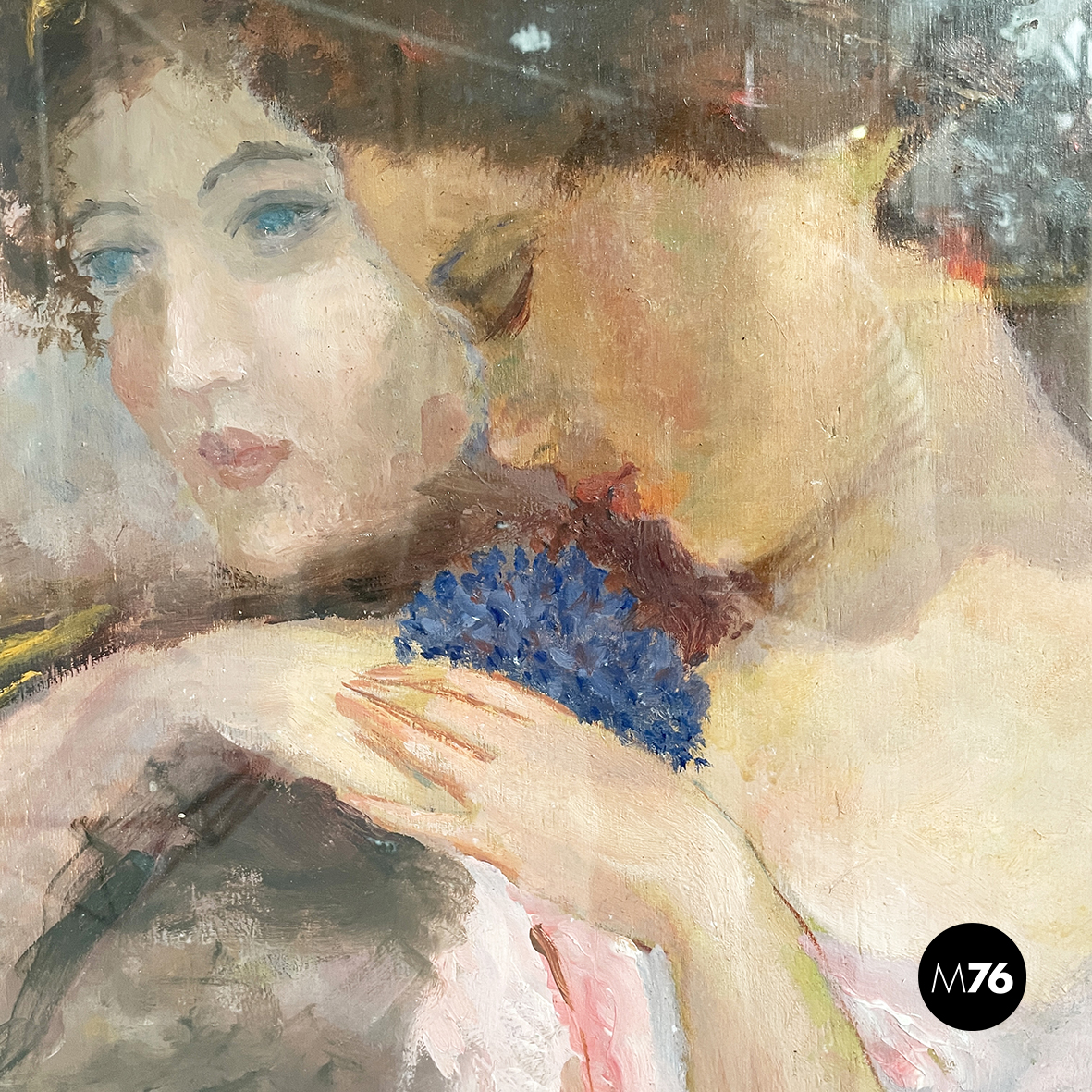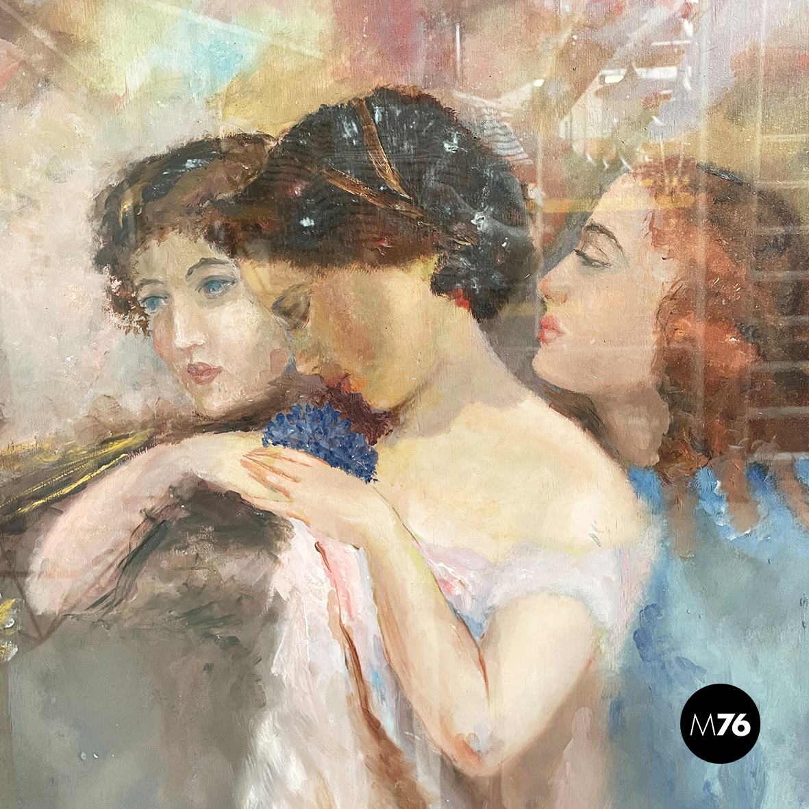 Quadro rettangolare con cornice in legno finemente lavorato e decorato con disegni in oro. Il dipinto raffigura tre donne con i capelli corti o legati. I colori del dipinto sono sfumati e vividi. La cornice presenta il vetro.