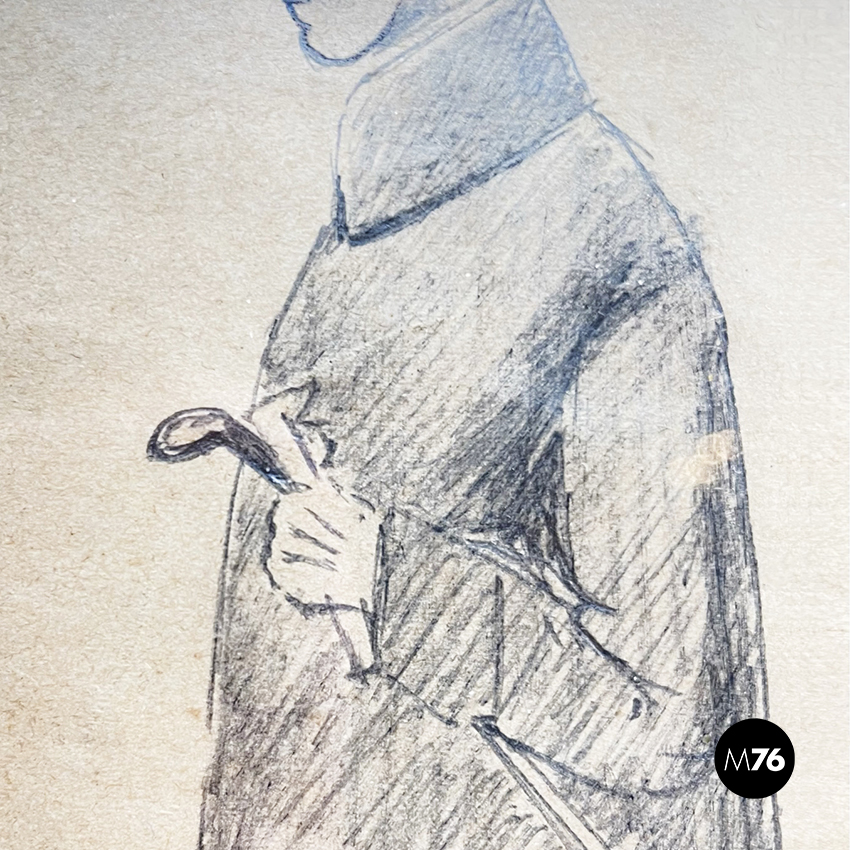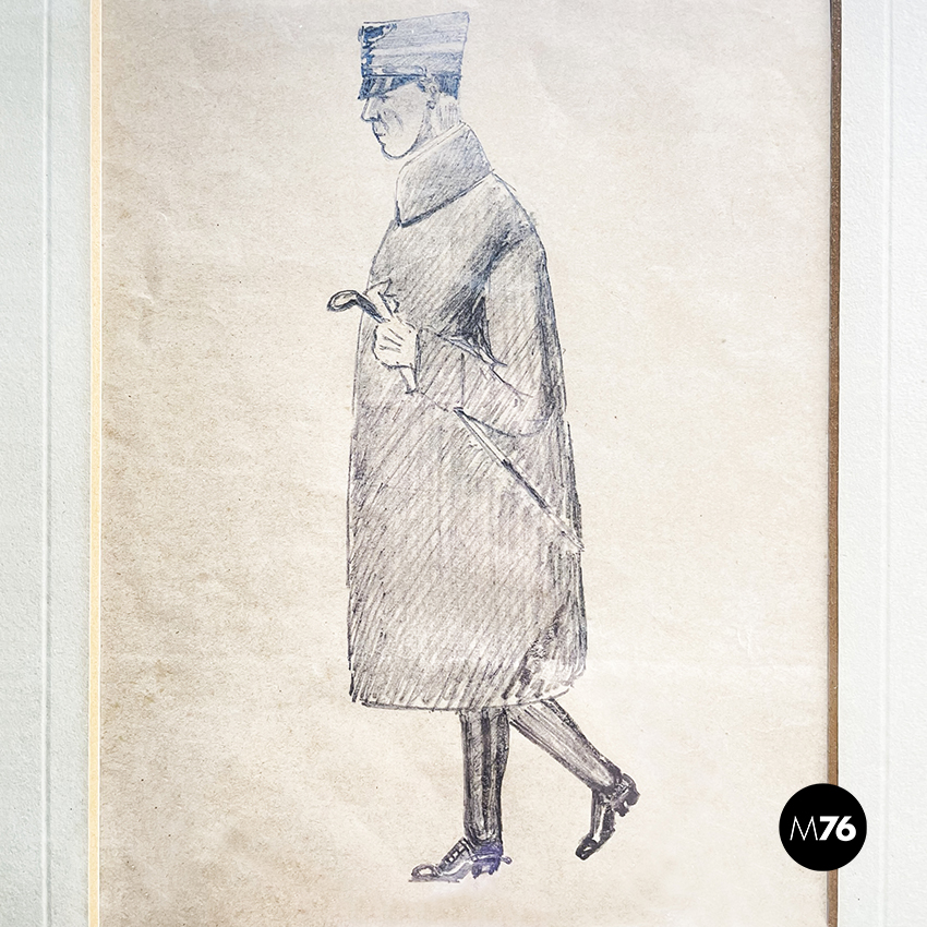 Disegno a matita su carta rappresentante un uomo in cappotto con cappello e bastone che passeggia. In passepartout bianco-beige e cornice in legno.