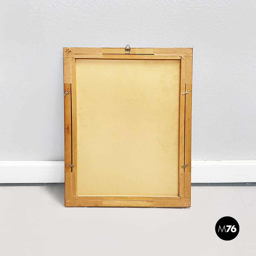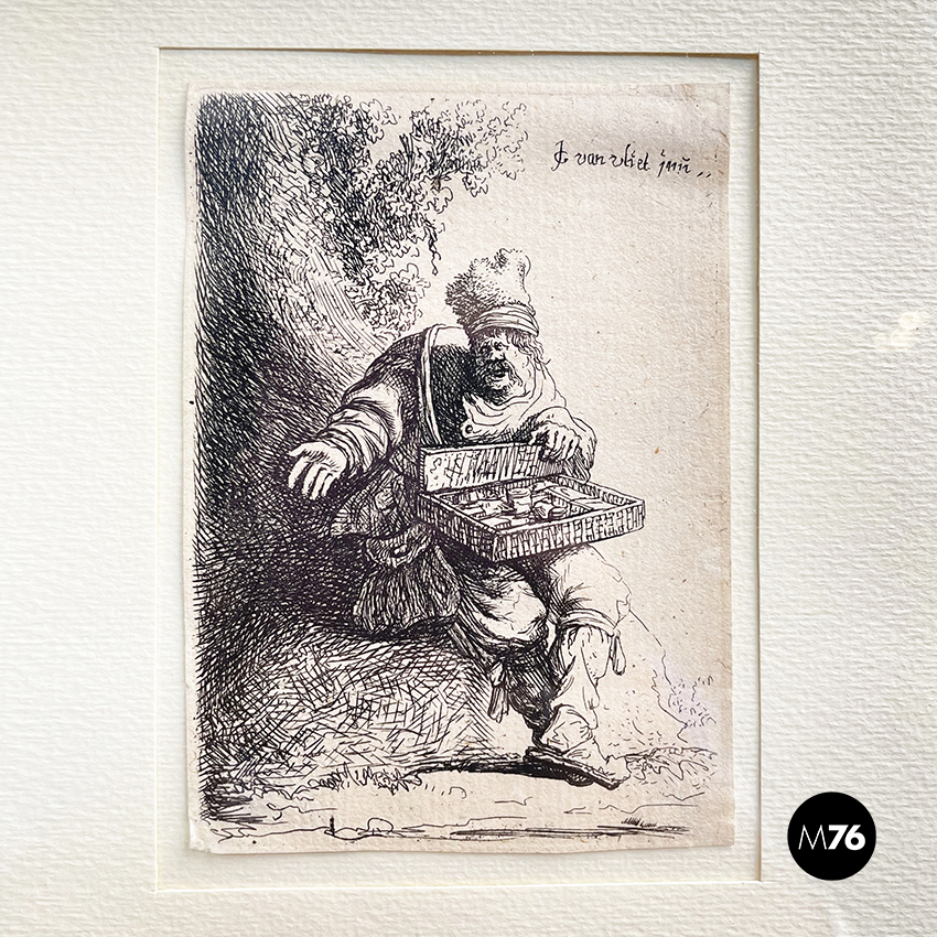 Stampa realizzata con la tecnica di incisione ad acquaforte su carta rappresentante un venditore ambulante che vende merci dal suo vassoio. La scena riprende un soggetto di un’incisione di Rembrandt. In passepartout bianco e cornice in legno.