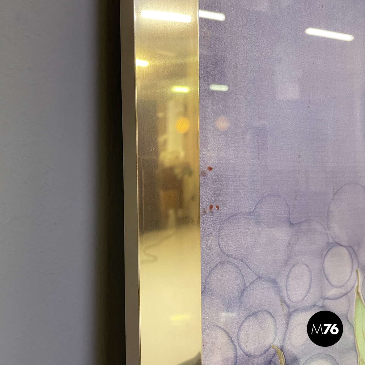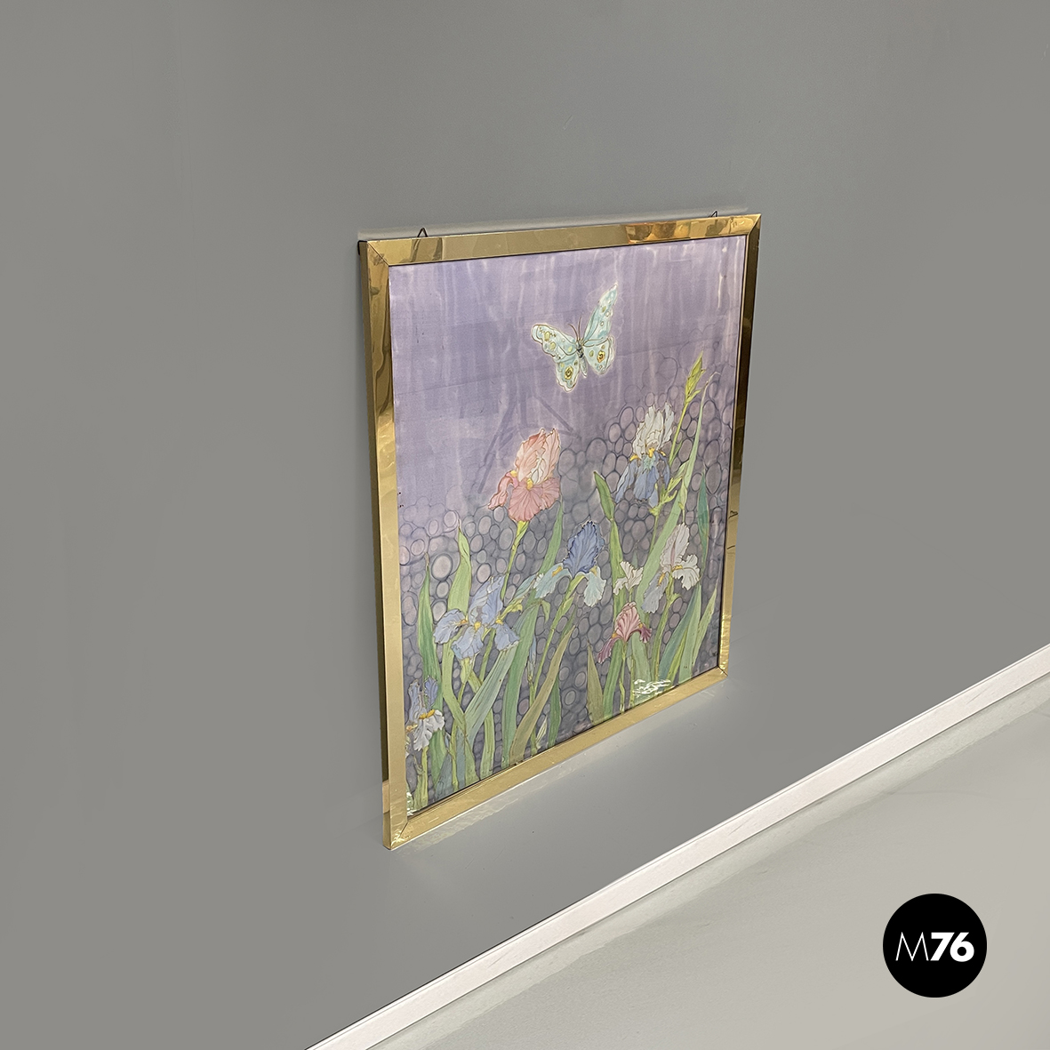Quadro su tela raffigurante dei fiori colorati blu e rosati in perfetto stile liberty. Nella parte alta del disegno è presente una farfalla azzurra. Lo sfondo è sui toni del viola. In cornice di metallo con finitura dorata.