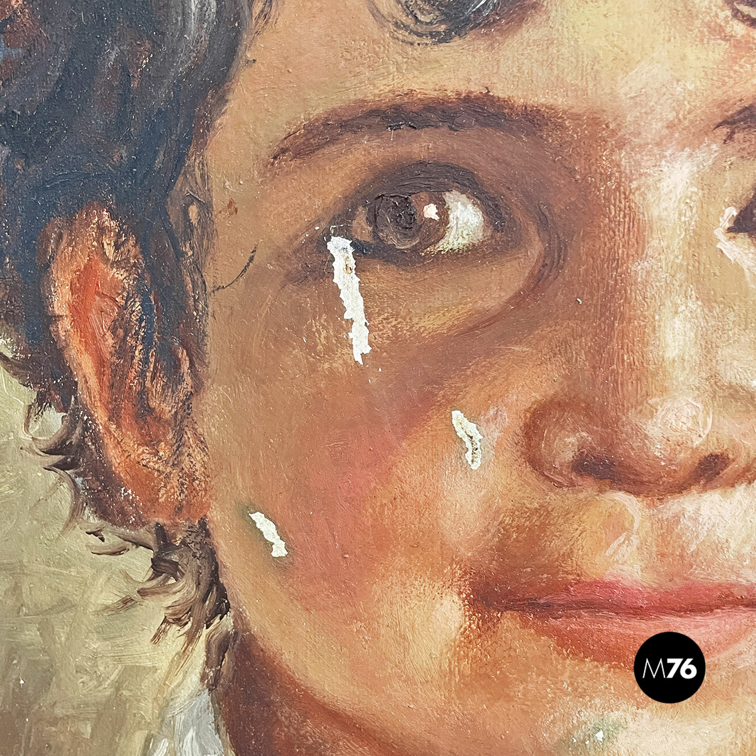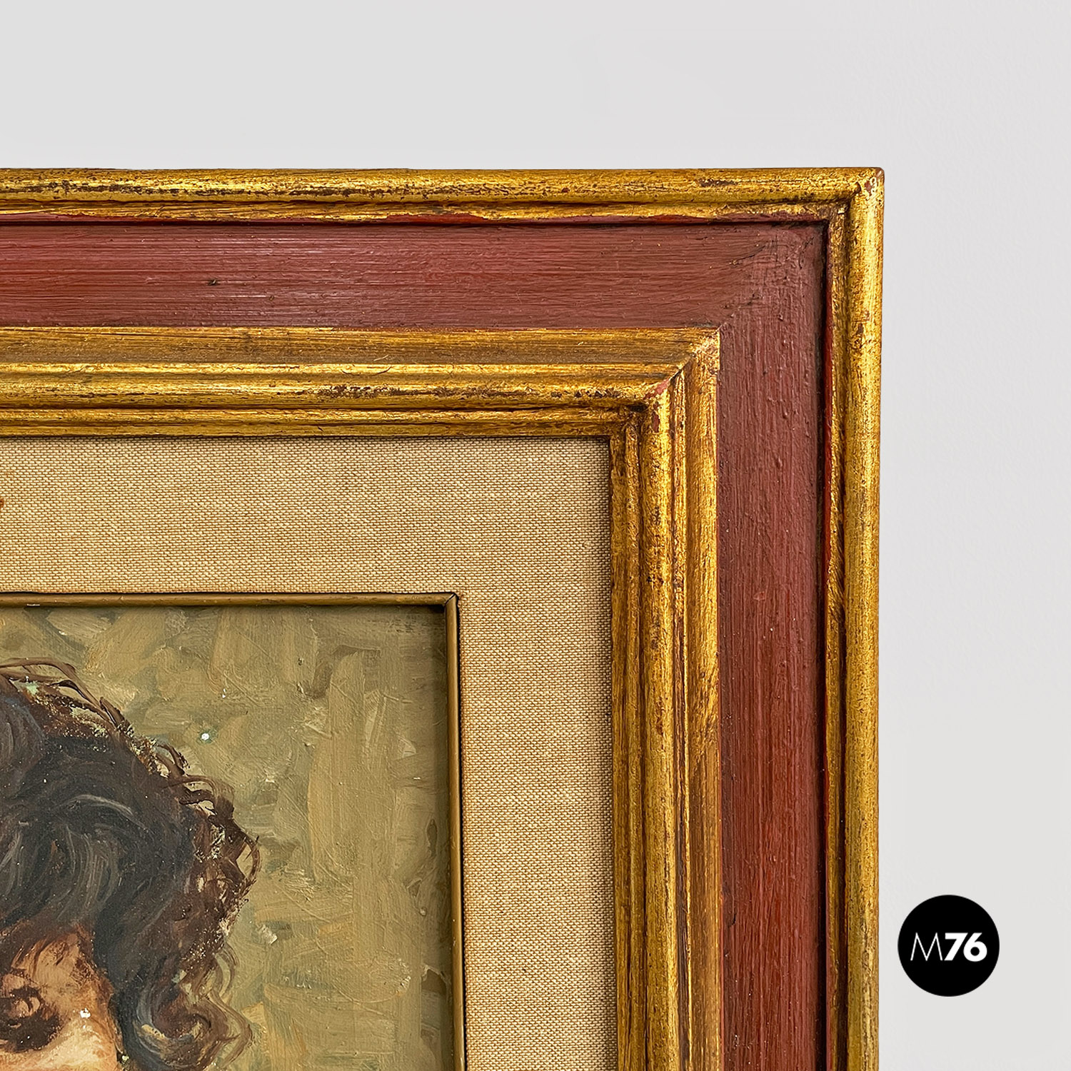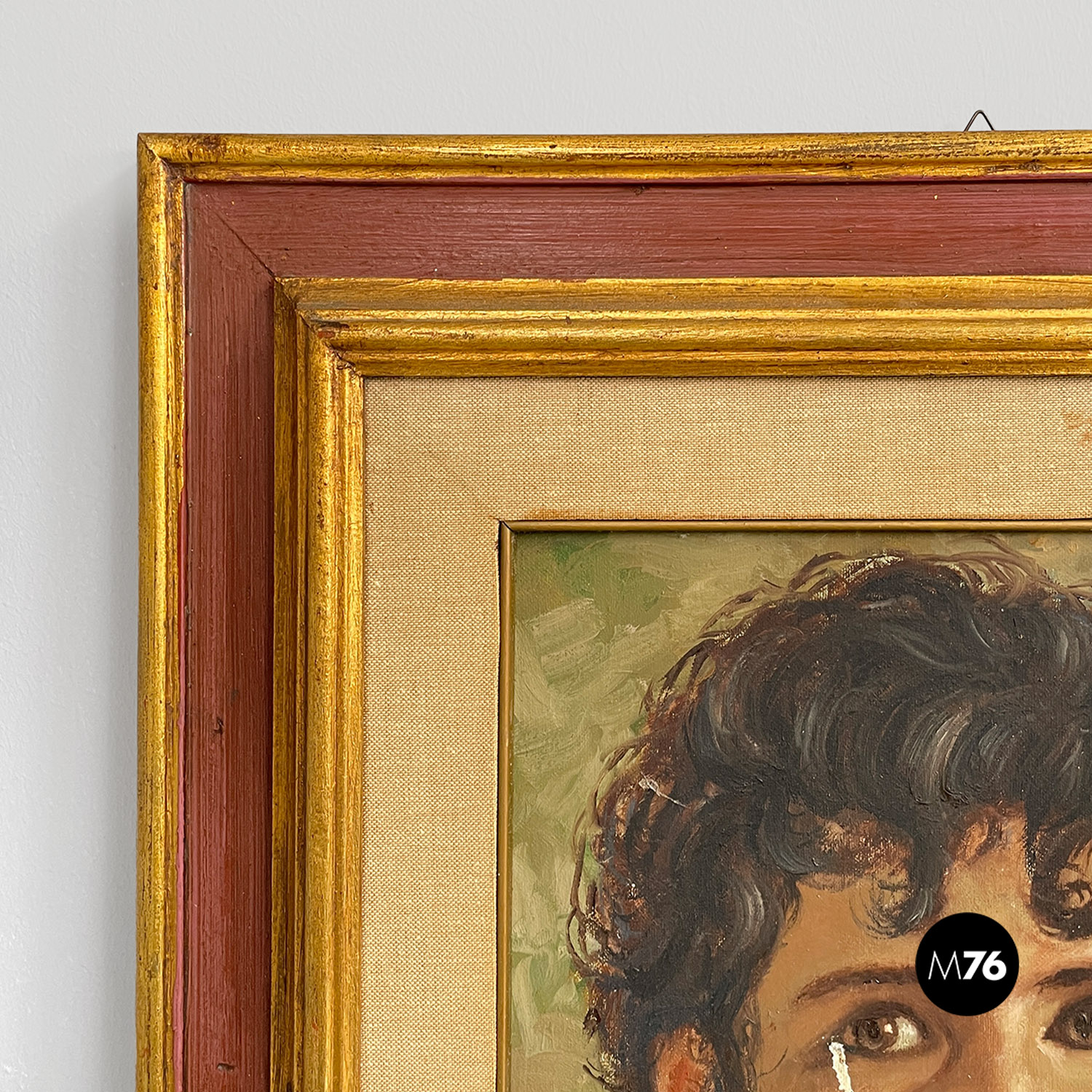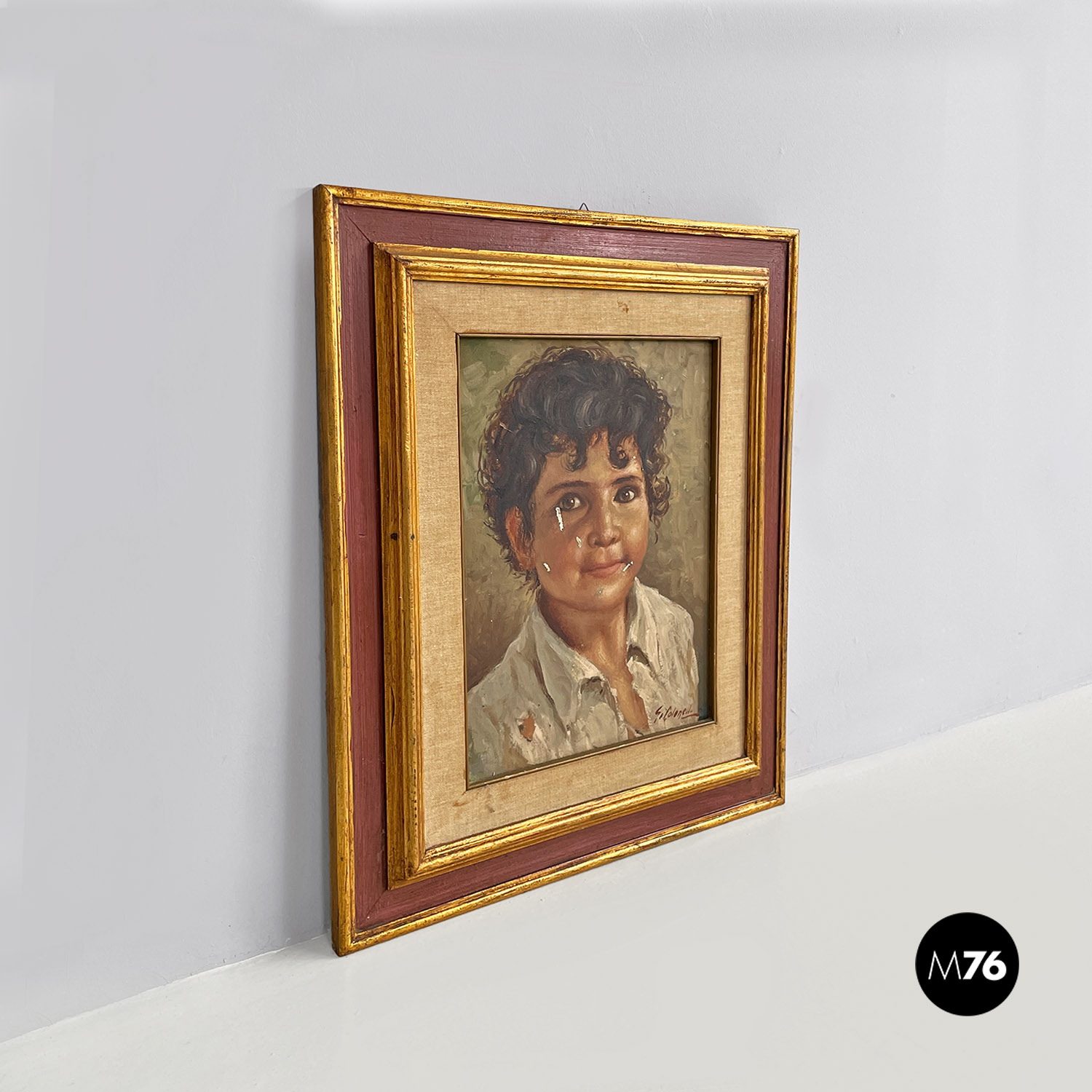 Dipinto realizzato con colori a tempera rappresentante un bambino dai capelli scuri e mossi e un volto tondeggiante. I colori sono caldi e la cornice è realizzata in legno dipinto oro o in tinta marrone e tessuto beige.