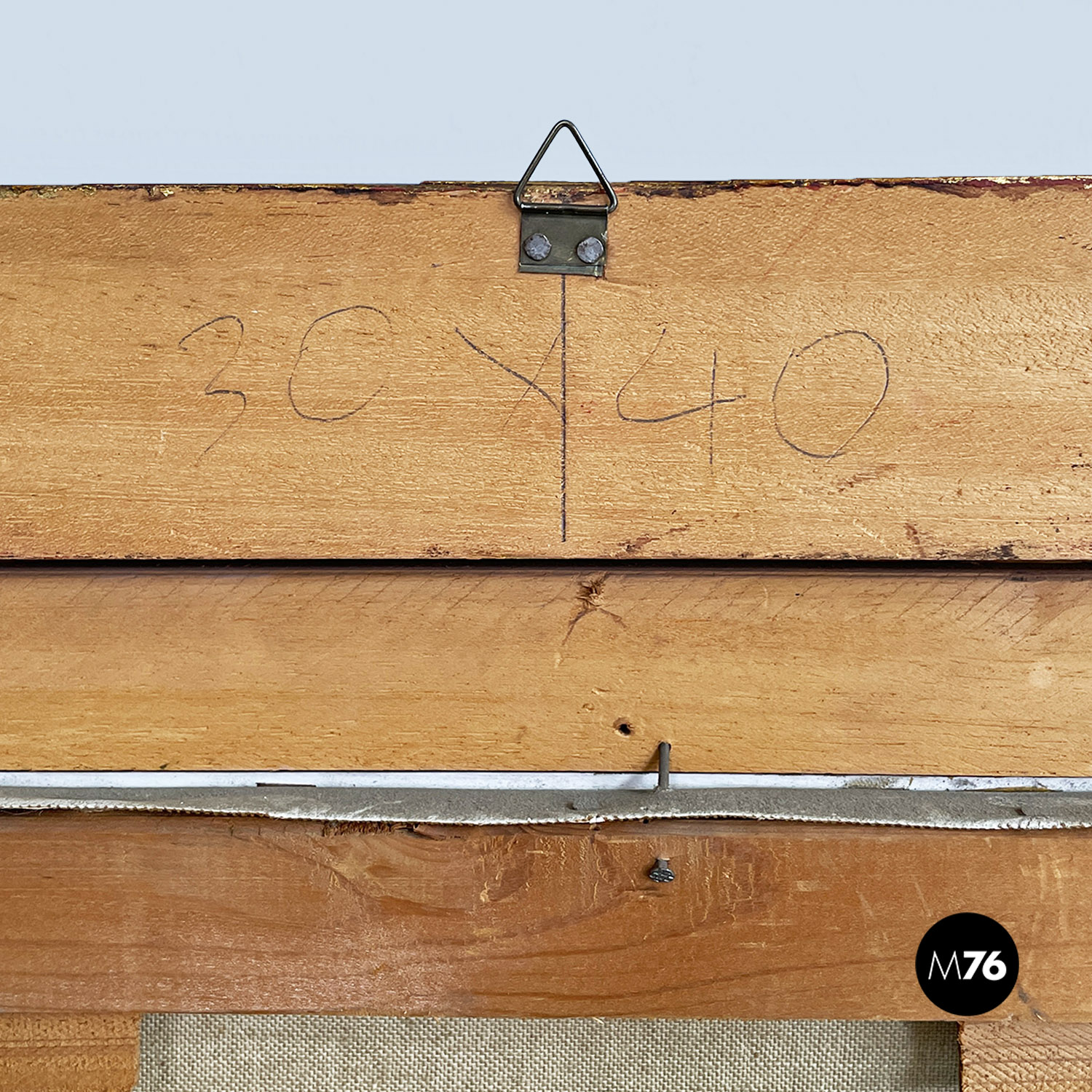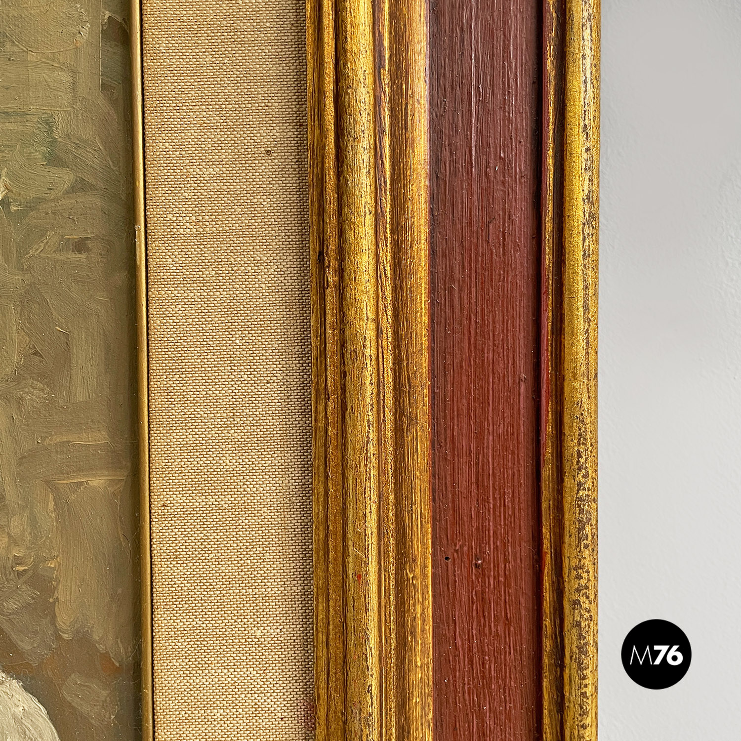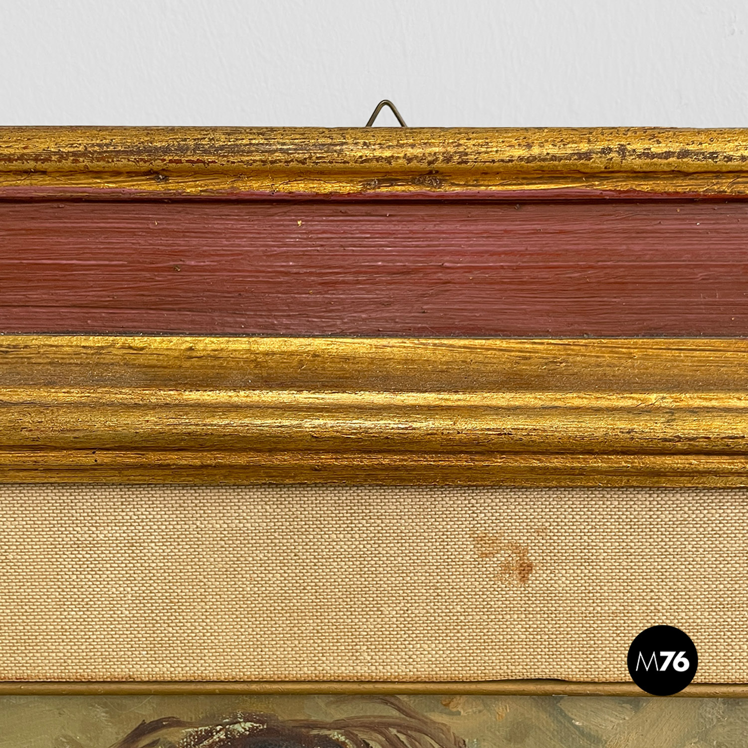 Dipinto realizzato con colori a tempera rappresentante un bambino dai capelli scuri e mossi e un volto tondeggiante. I colori sono caldi e la cornice è realizzata in legno dipinto oro o in tinta marrone e tessuto beige.