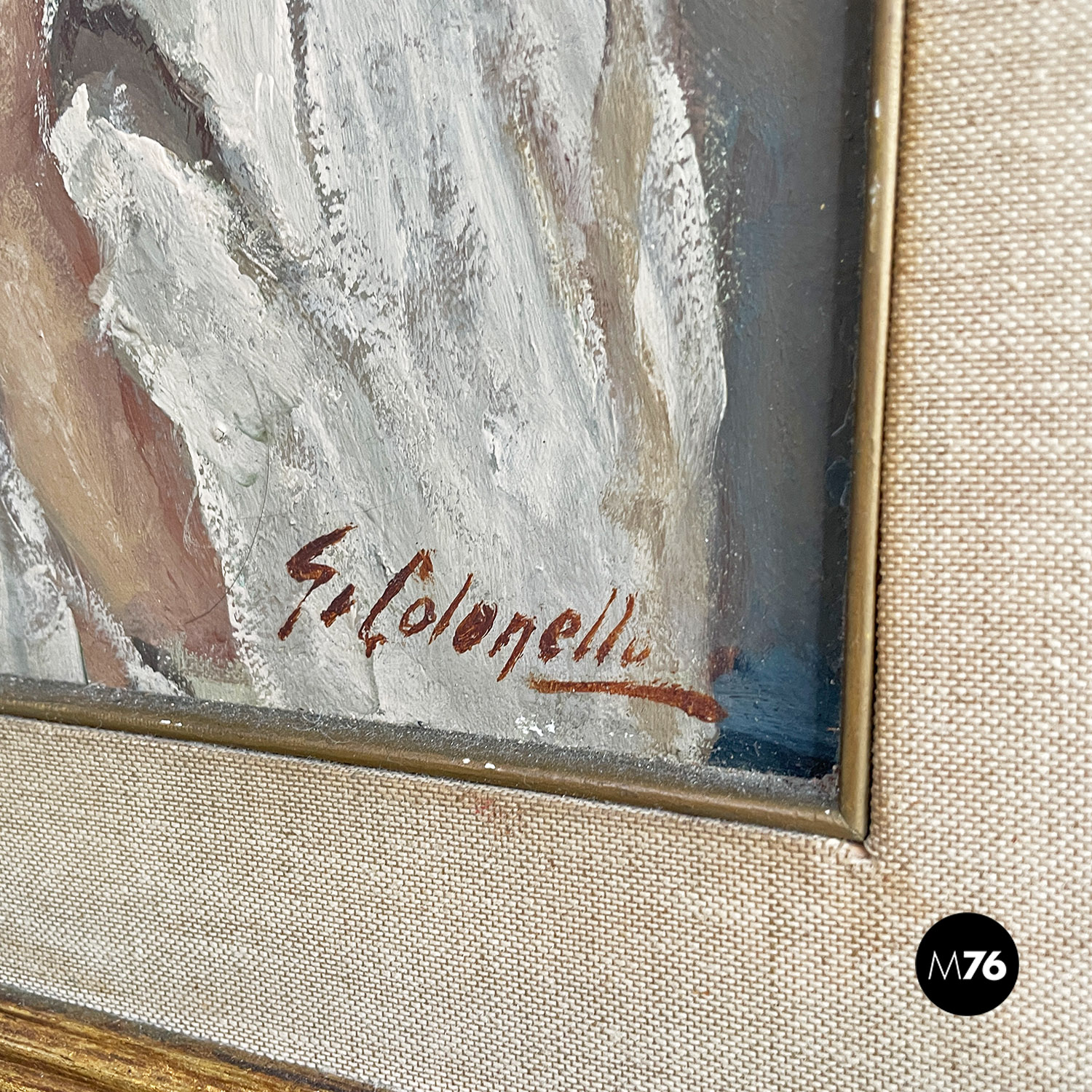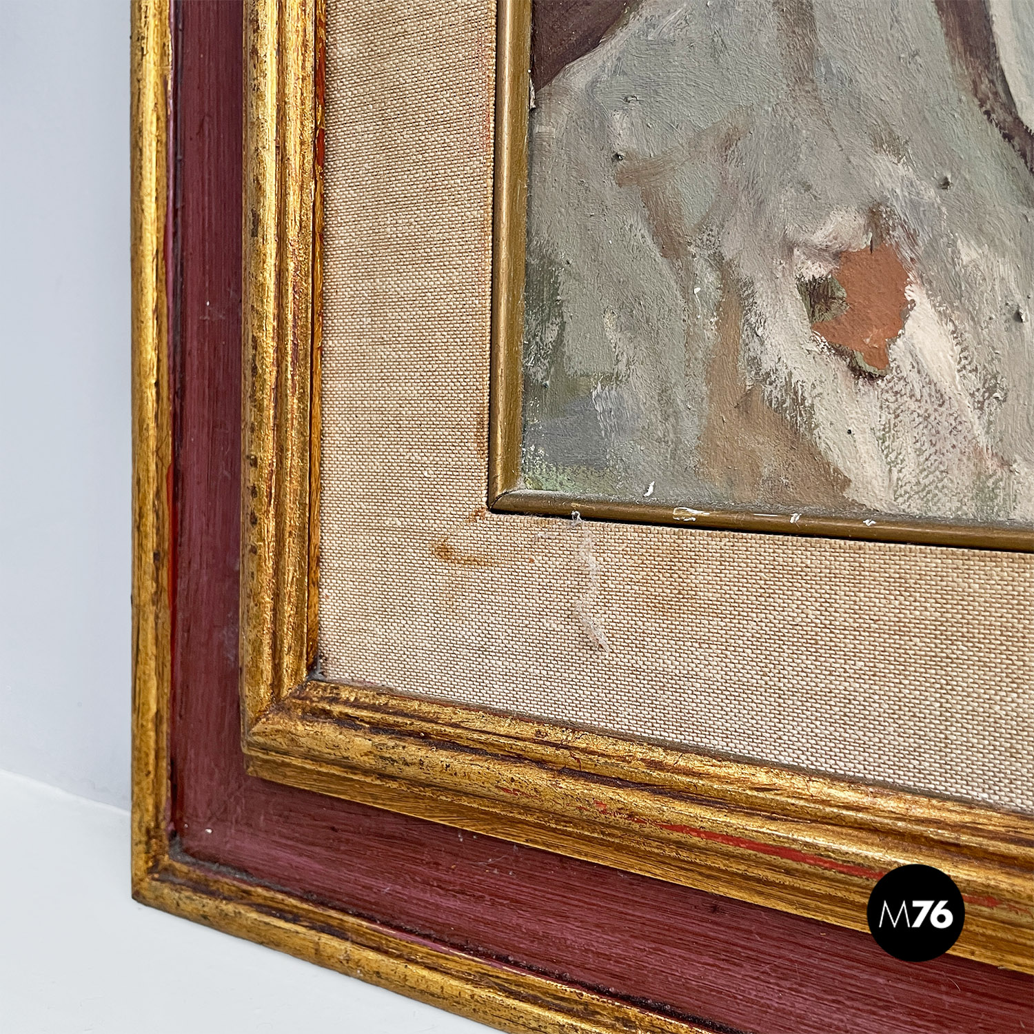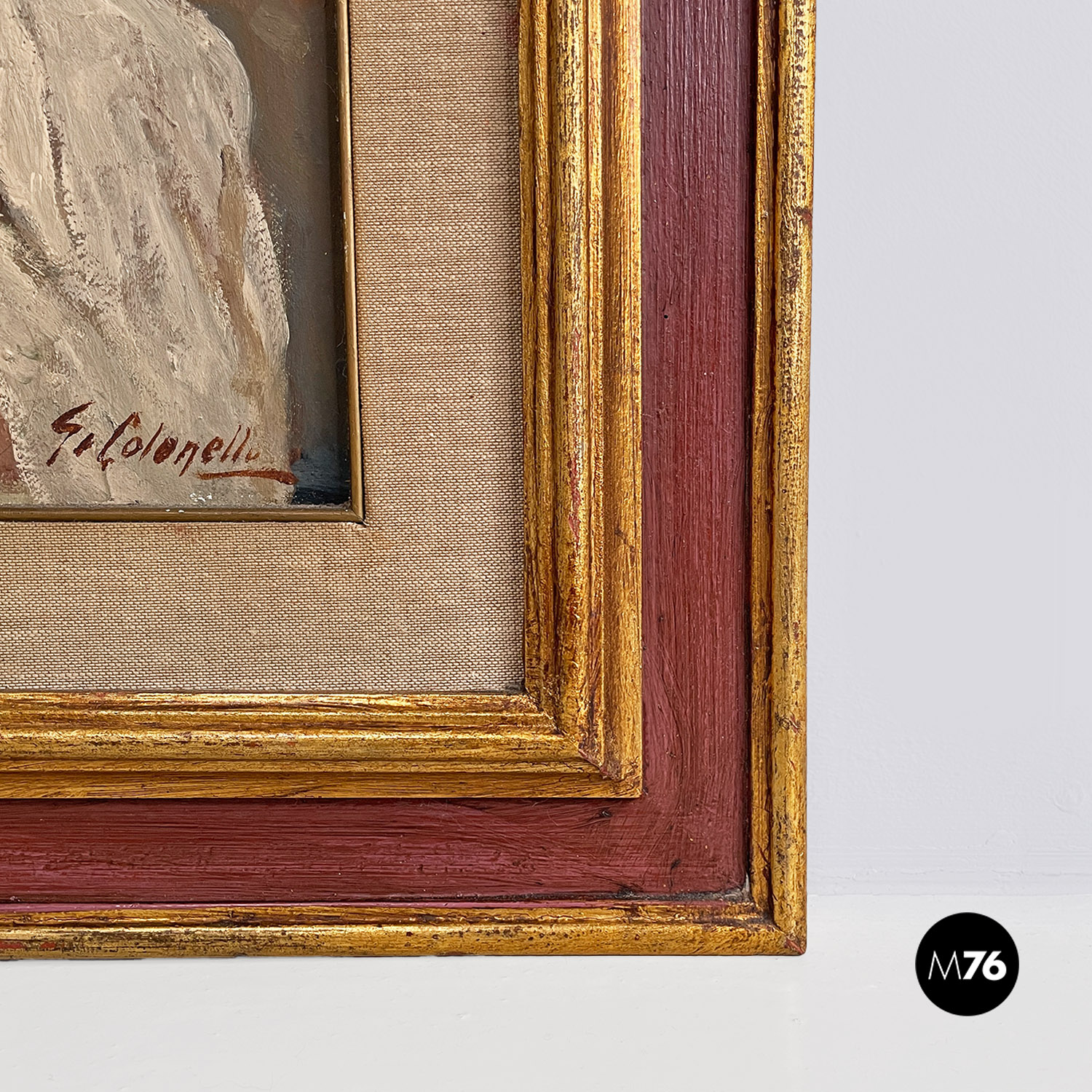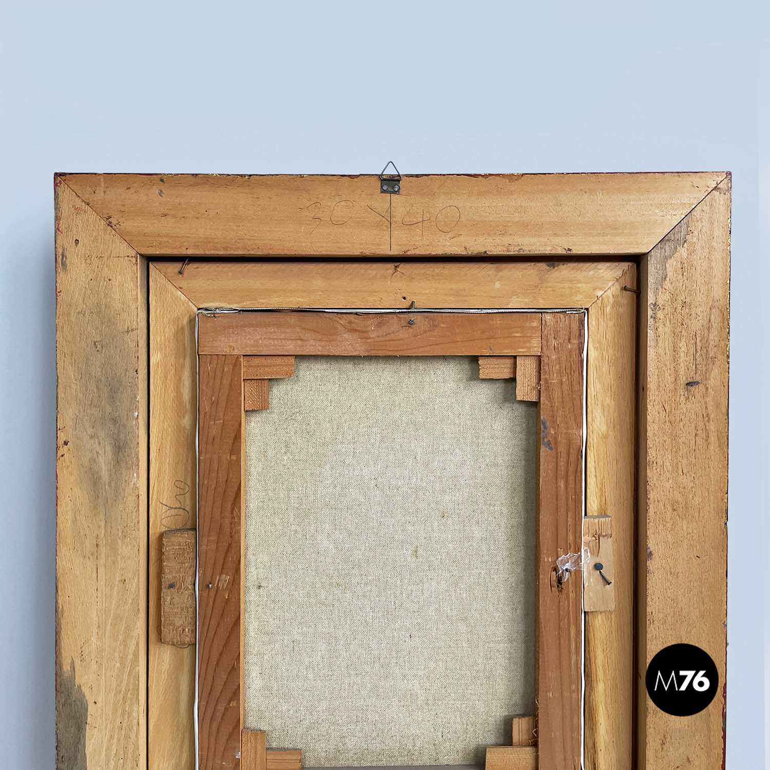 Dipinto realizzato con colori a tempera rappresentante un bambino dai capelli scuri e mossi e un volto tondeggiante. I colori sono caldi e la cornice è realizzata in legno dipinto oro o in tinta marrone e tessuto beige.