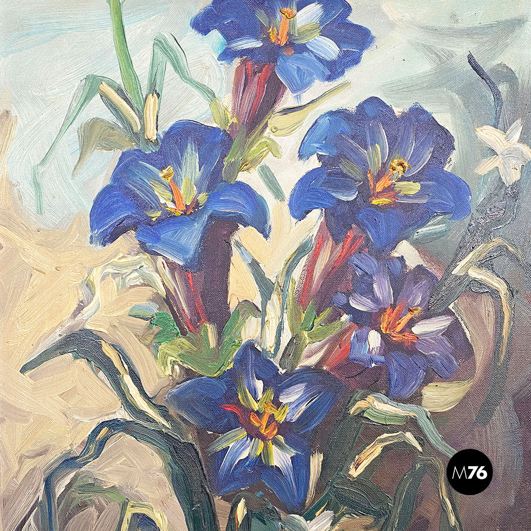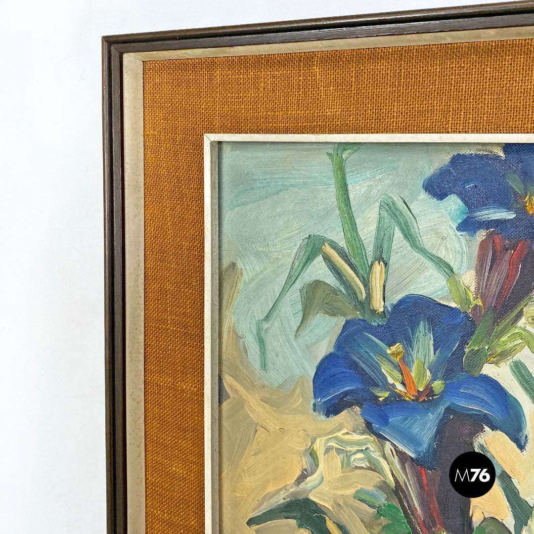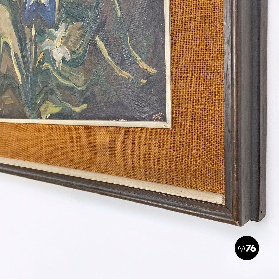Quadro con rappresentazione floreale con cornice in legno passe-partout in tessuto e firma dell’autore nella parte bassa a sinistra e sul retro.