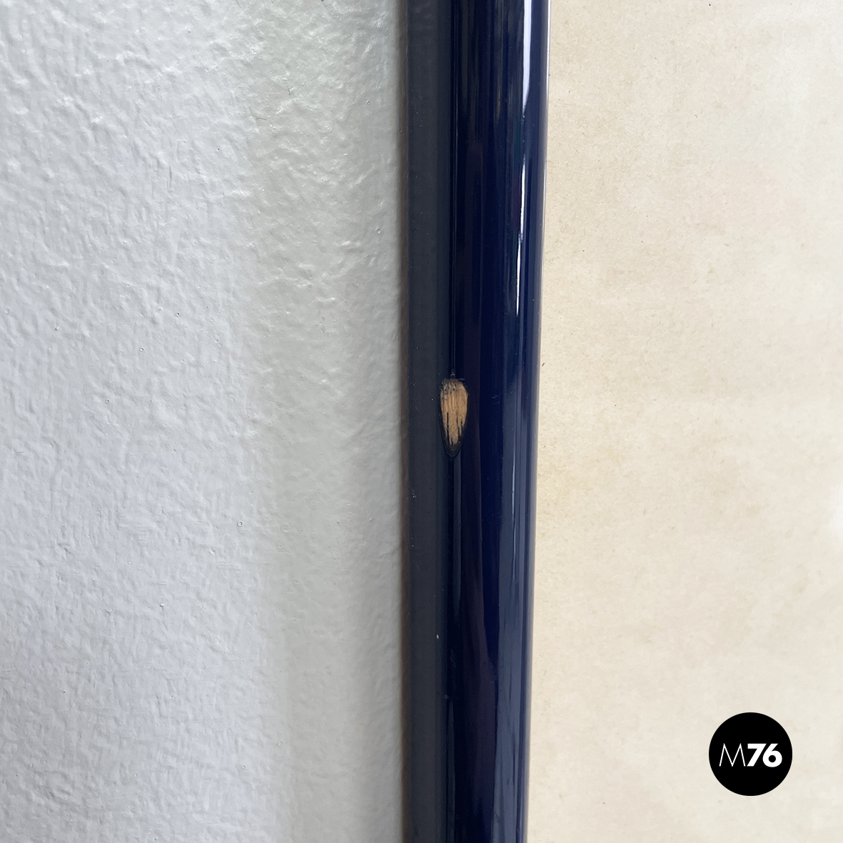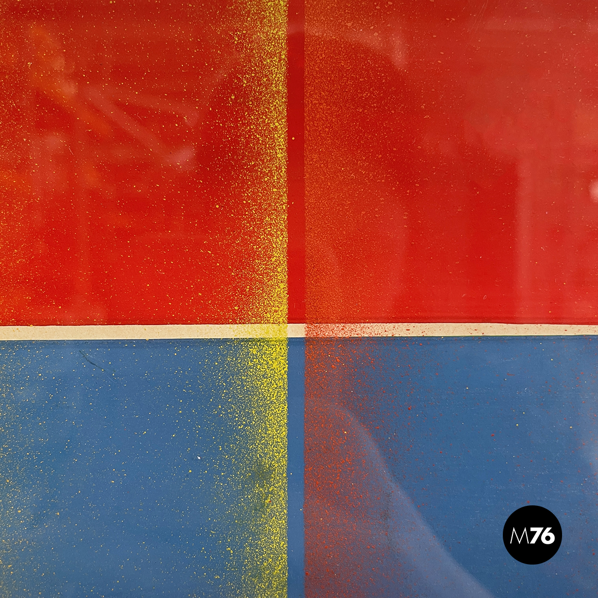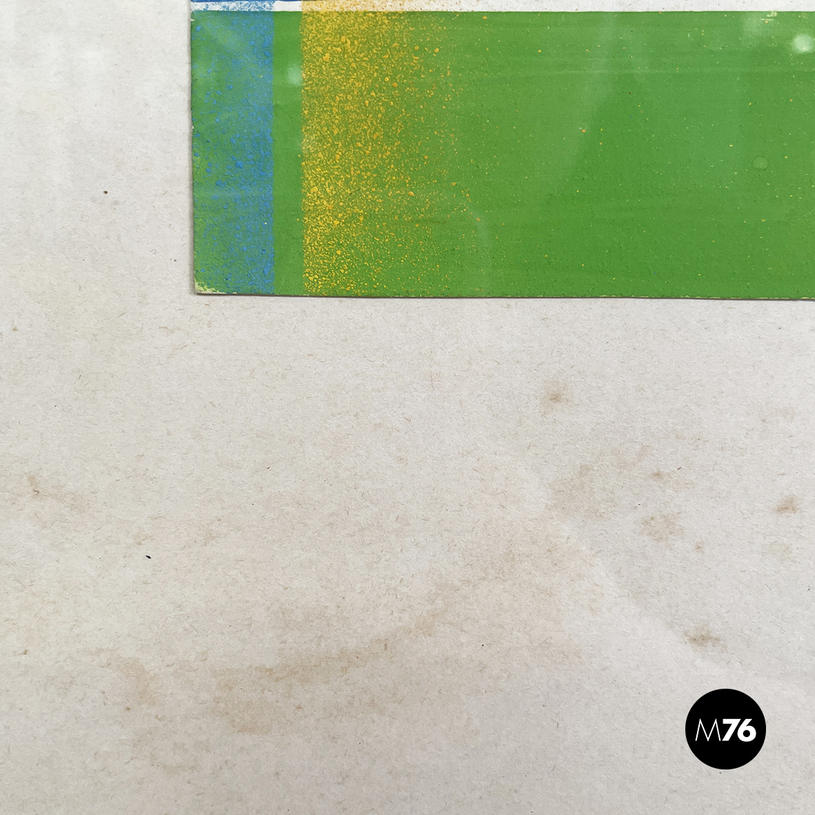 Quadro rettangolare su carta. Il soggetto geometrico del dipinto presenta delle linee spesse orizzontali in azzurro rosso e verde a cui si sovrappongono sfumature puntinate verticali in giallo rosso e azzurro. In cornice di legno sottile verniciata blu con finitura lucida e in passeparout.