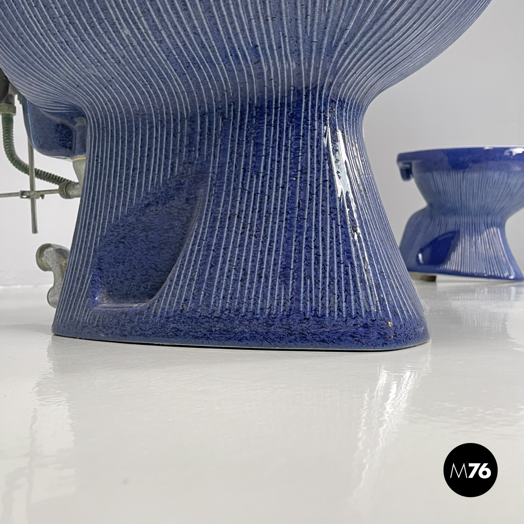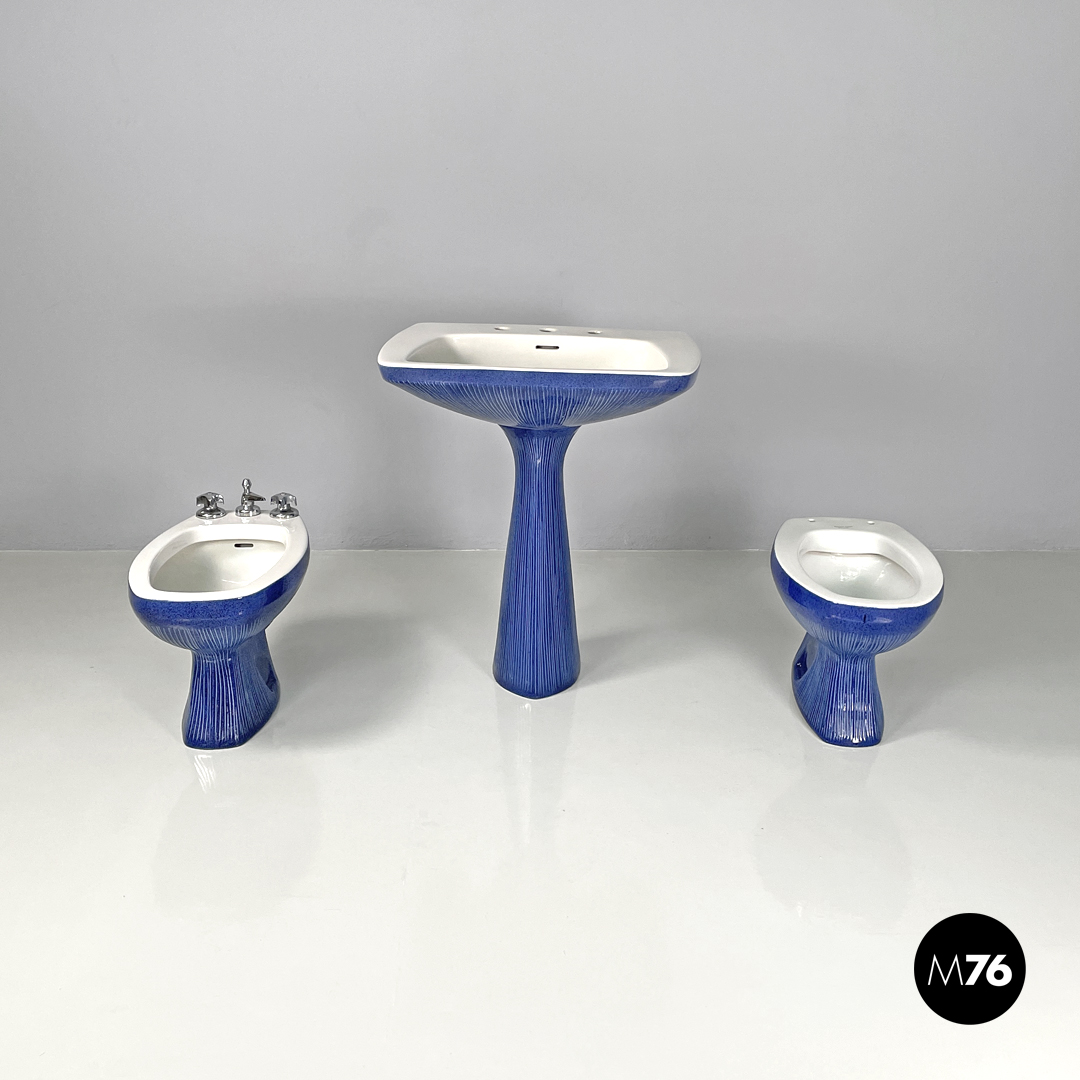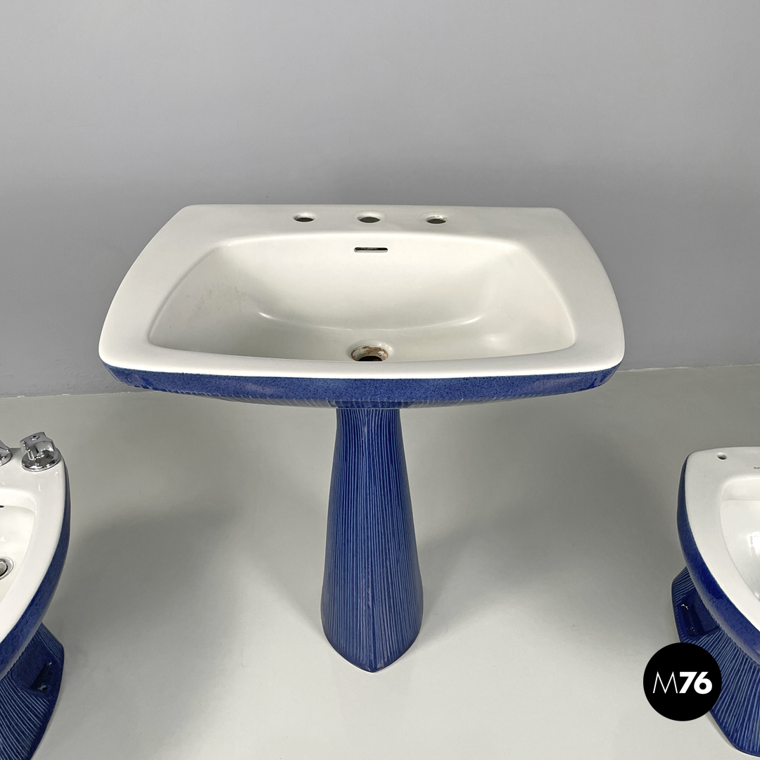 Set di tre sanitari da bagno modello Gardena composto da wc bidet e lavandino. I sanitari in ceramica bianca nella parte in alto mentre l’esterno della struttura è smaltata sui toni del blu con striature rialzate più chiare. Il bidet presenta il rubinetto e le manopole in acciaio cromato.