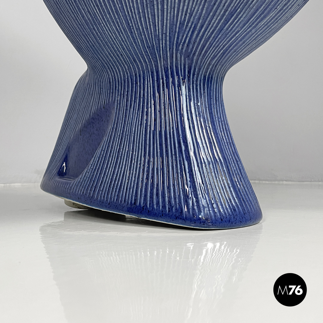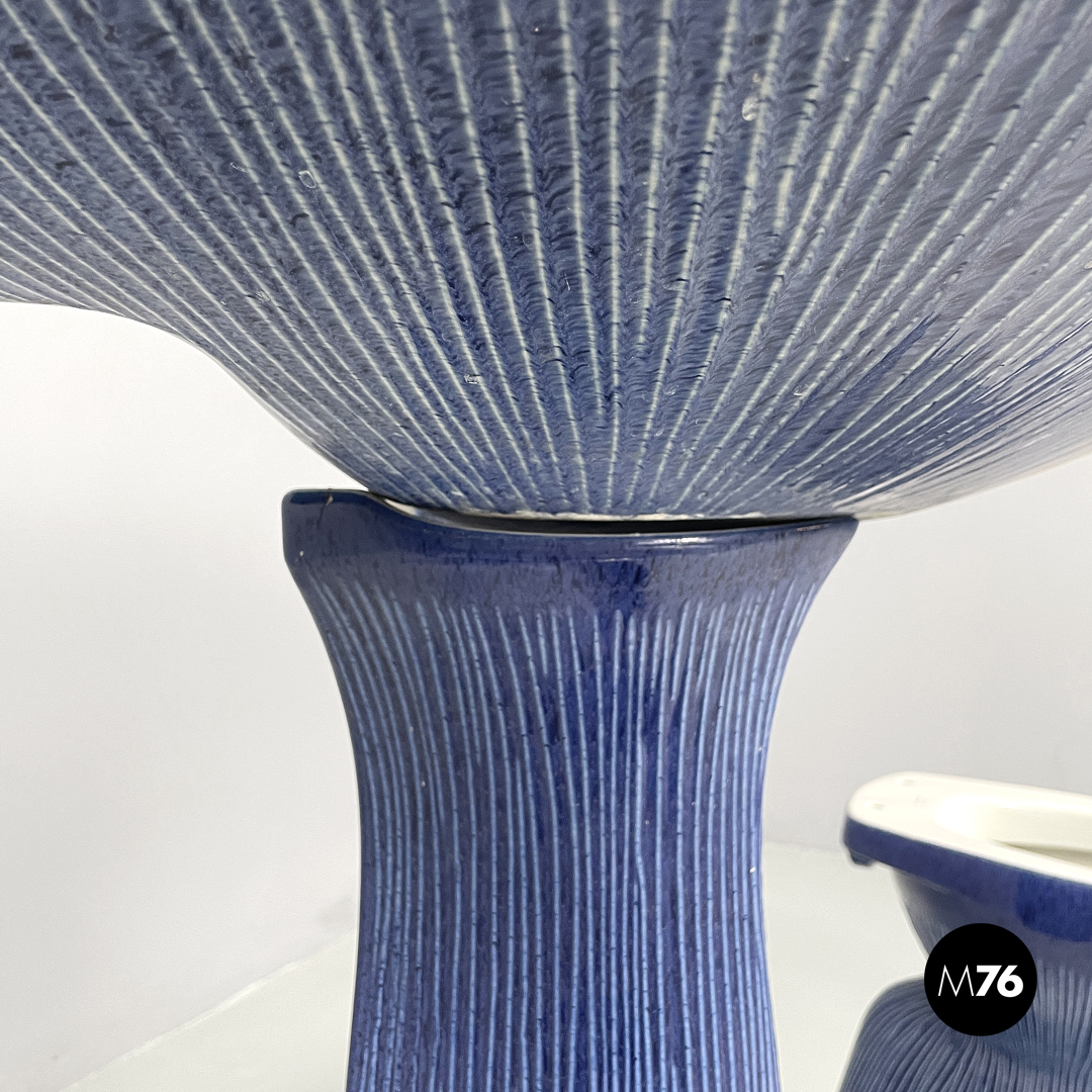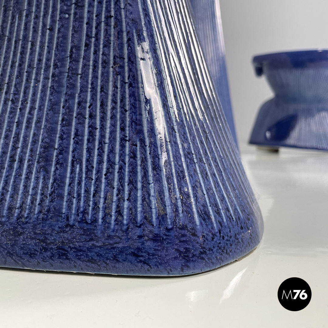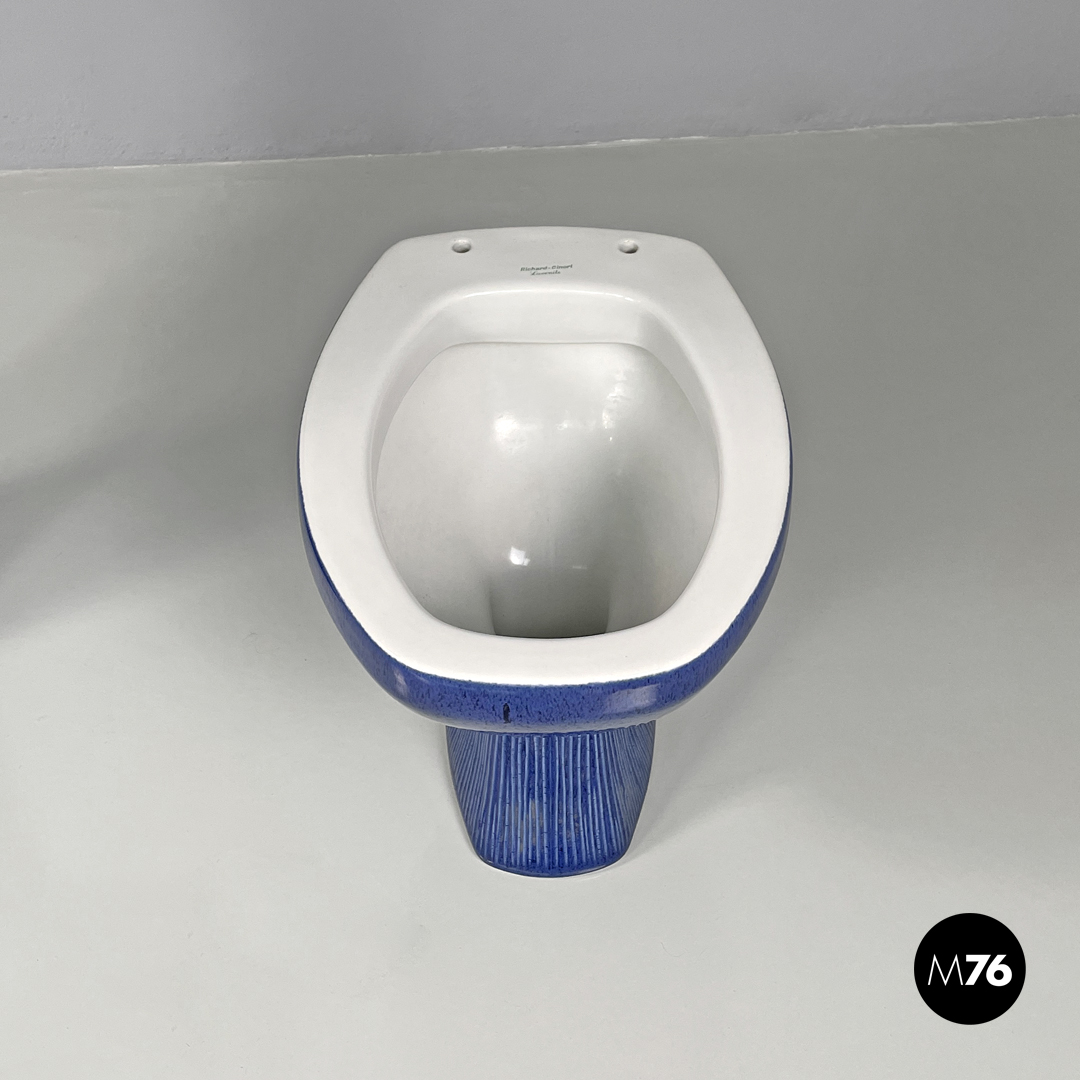 Set di tre sanitari da bagno modello Gardena composto da wc bidet e lavandino. I sanitari in ceramica bianca nella parte in alto mentre l’esterno della struttura è smaltata sui toni del blu con striature rialzate più chiare. Il bidet presenta il rubinetto e le manopole in acciaio cromato.