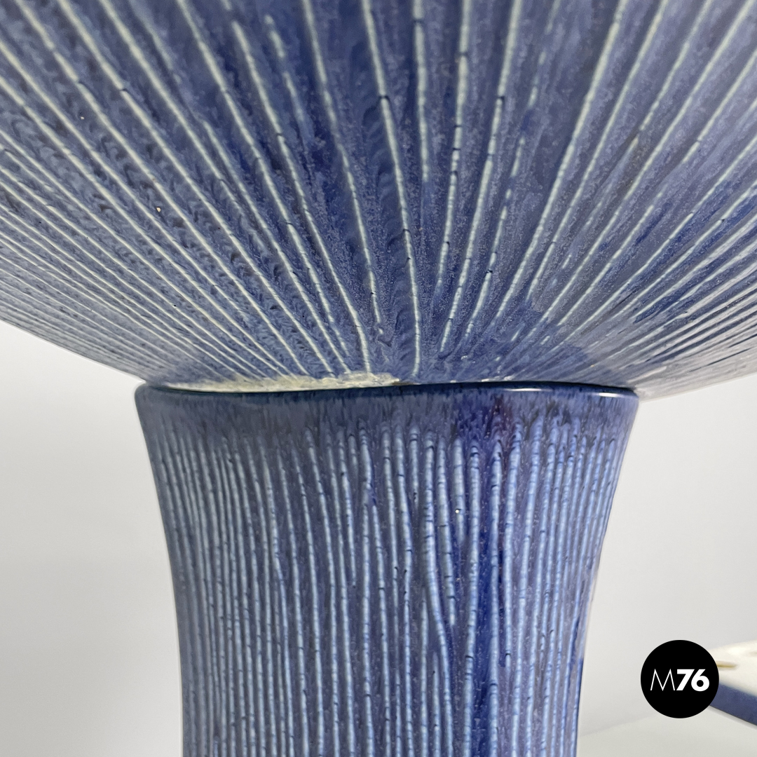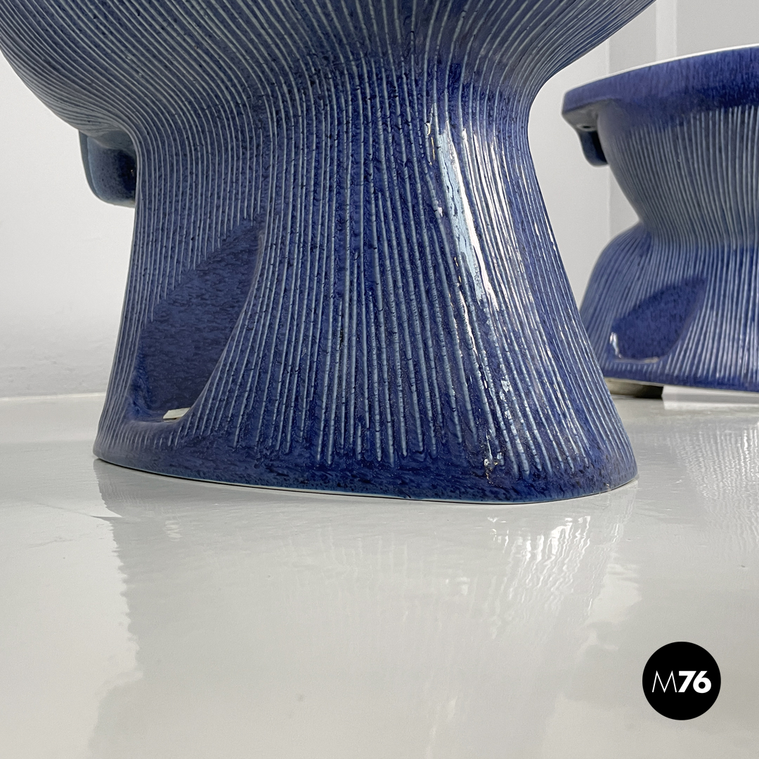 Set di tre sanitari da bagno modello Gardena composto da wc bidet e lavandino. I sanitari in ceramica bianca nella parte in alto mentre l’esterno della struttura è smaltata sui toni del blu con striature rialzate più chiare.
