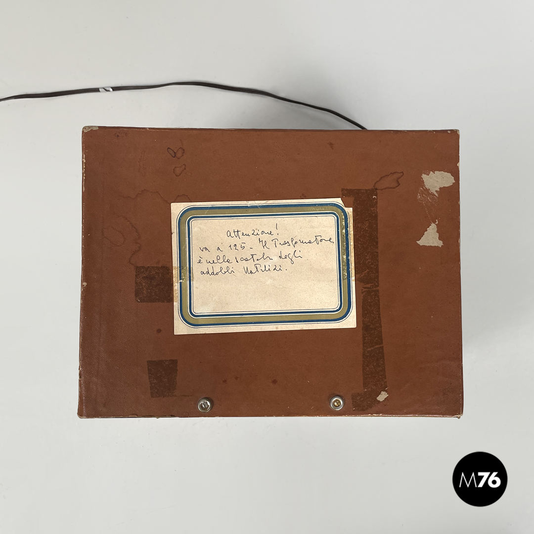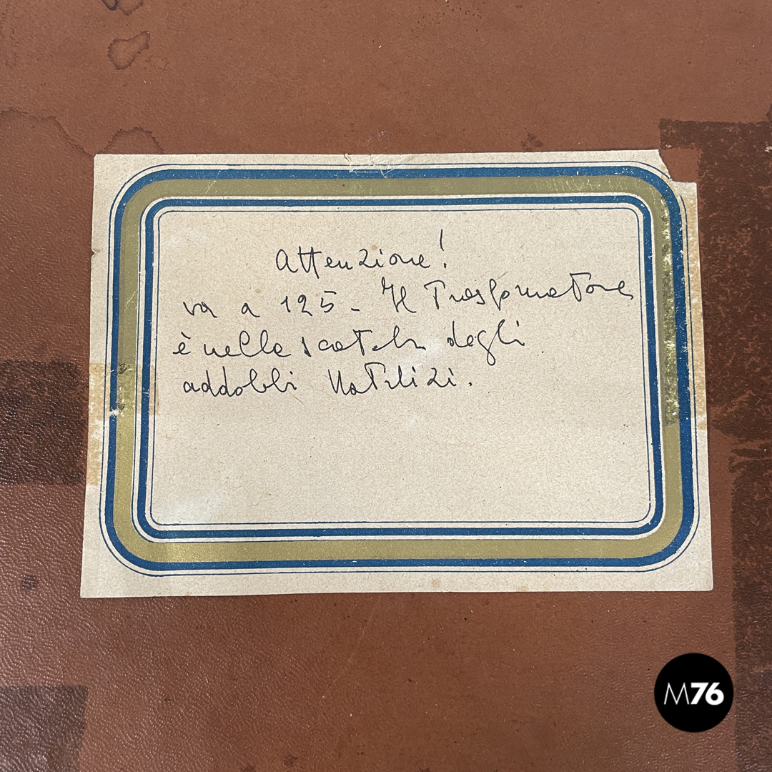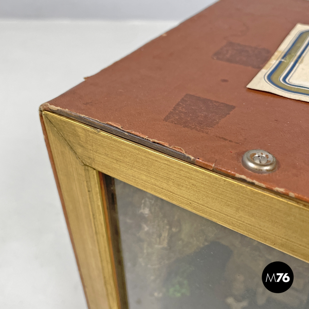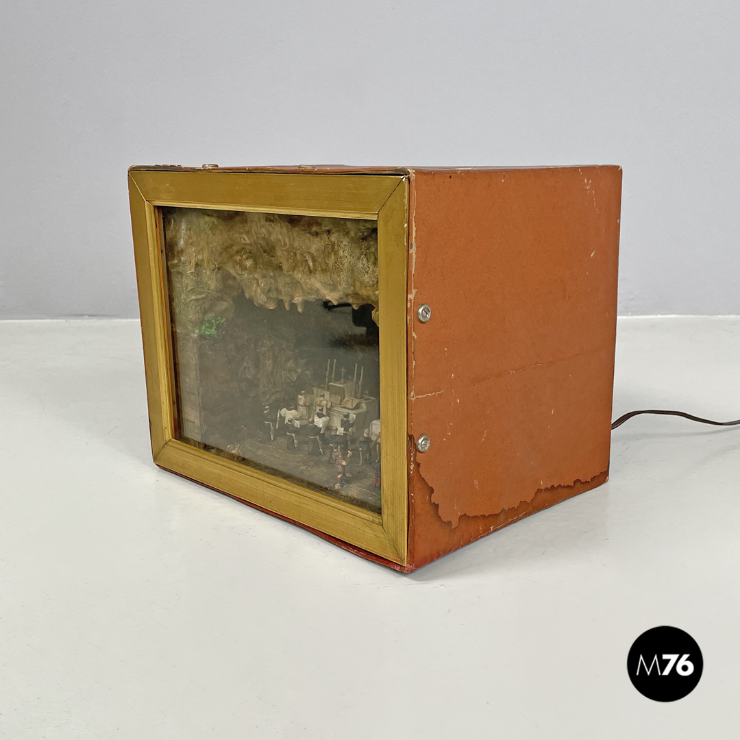 Scatola diorama cubica rappresentante una scena cerimoniale cristiana. L’esterno della scatola è rivestito di cartone marrone la faccia frontale della scatola è in vetro con cornice dorata e mostra la composizione interna che vede sulla sinistra una celebrazione religiosa e sulla sinistra una scena di lavoro il tutto ambientato in una grotta. Presente trasformatore che ne rende possibile l’illuminazione. Sulla parte superiore riporta un’etichetta scritta a mano che dice “Attenzione! Va a 125 il trasformatore è nella scatola degli addobbi natalizi”.