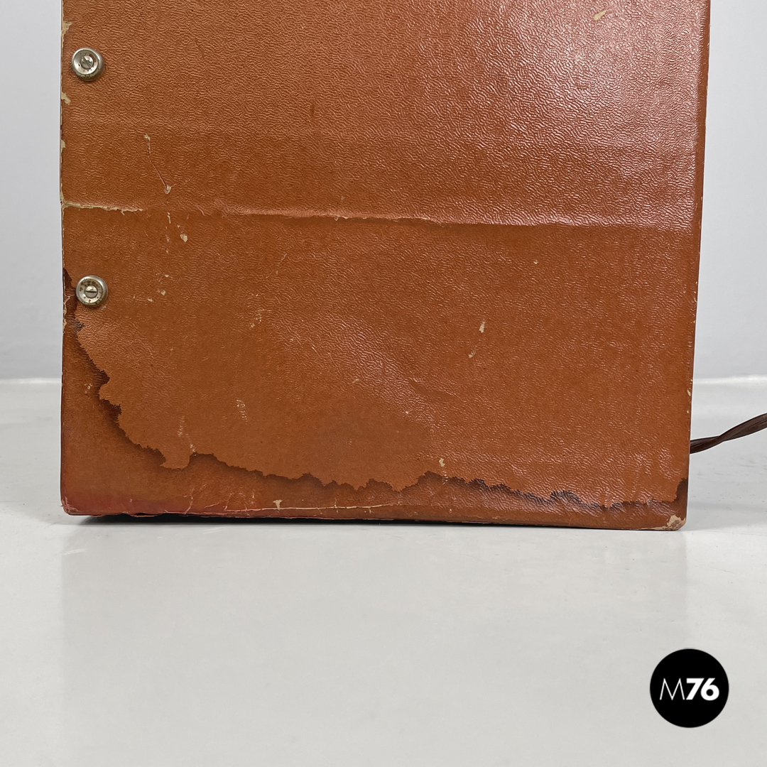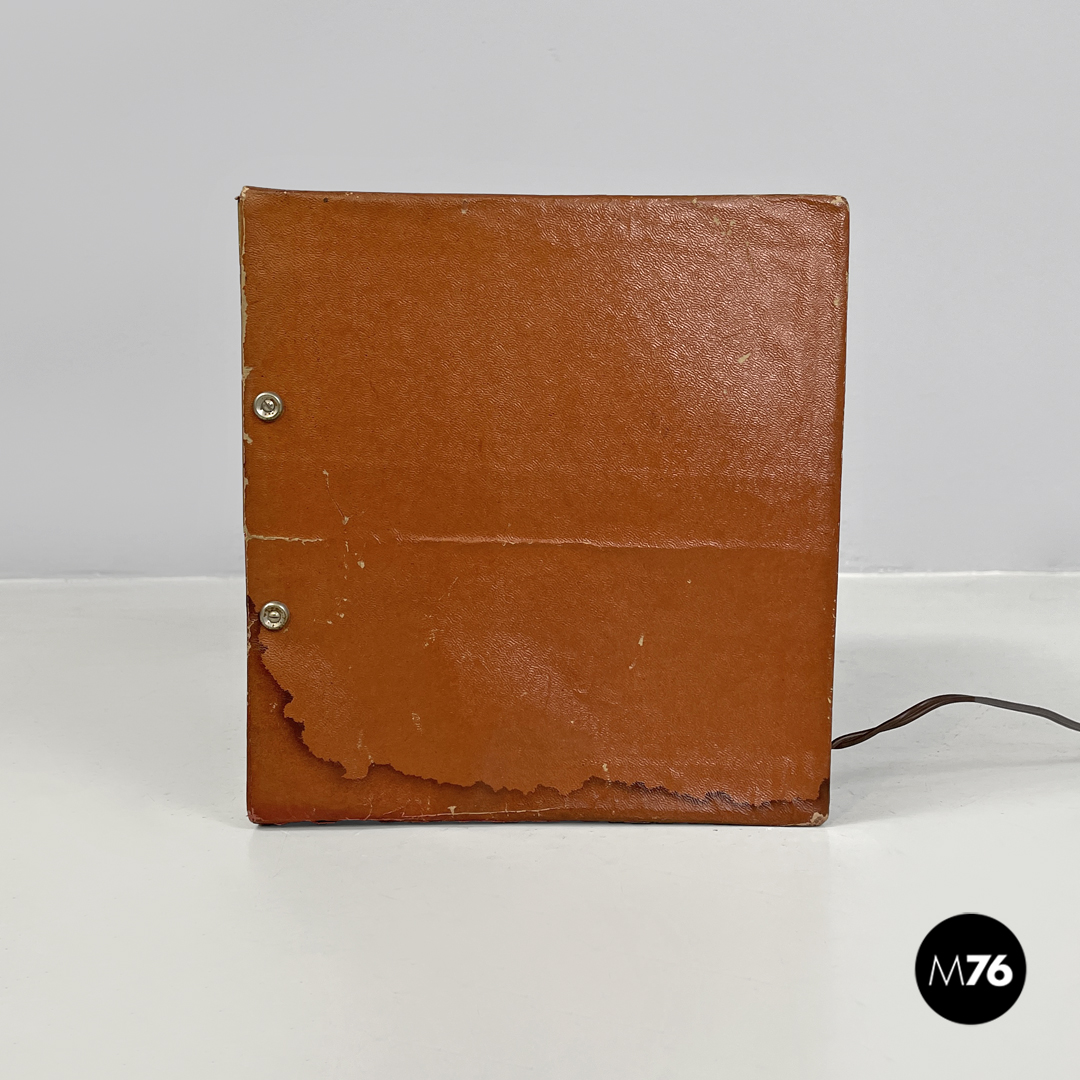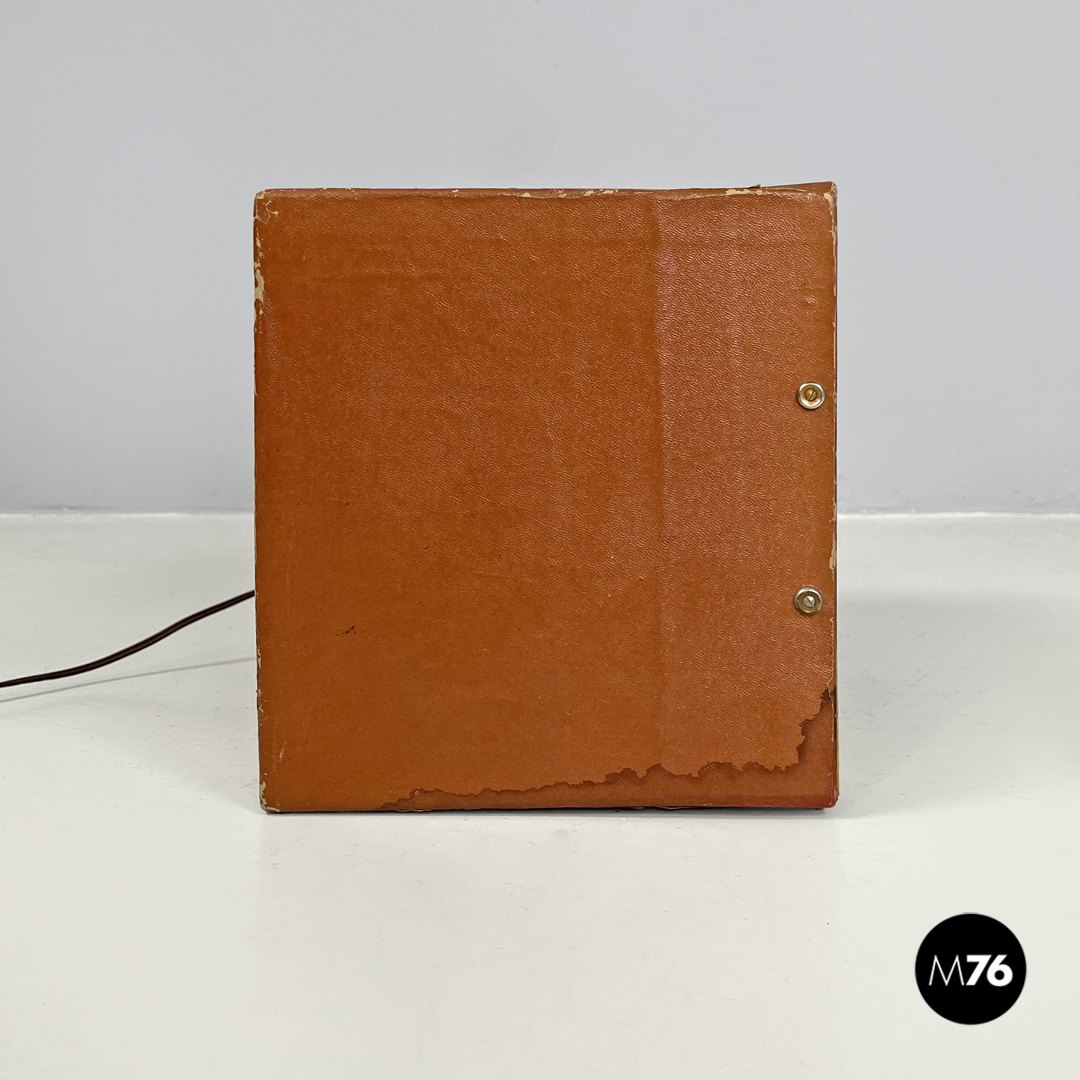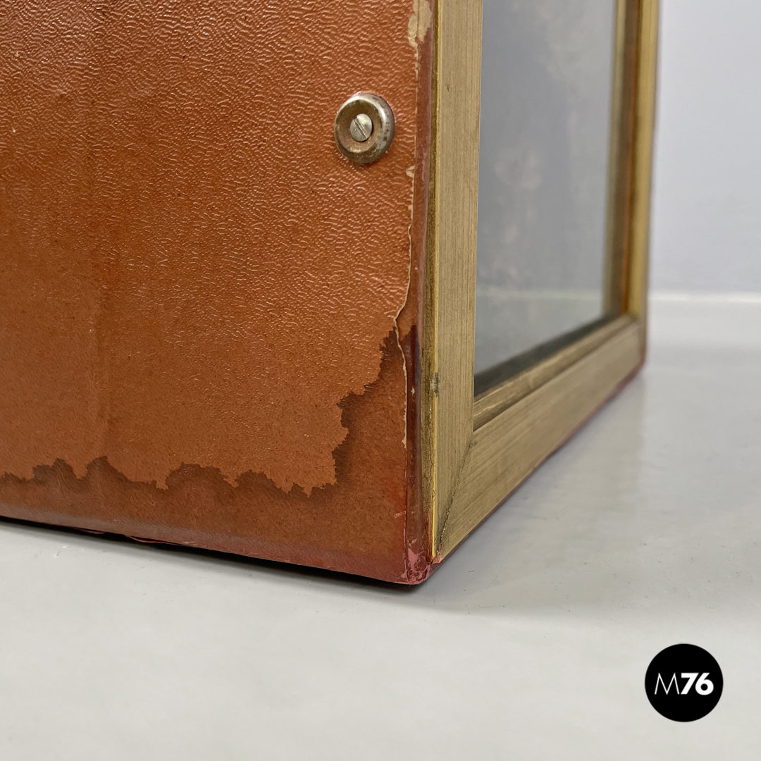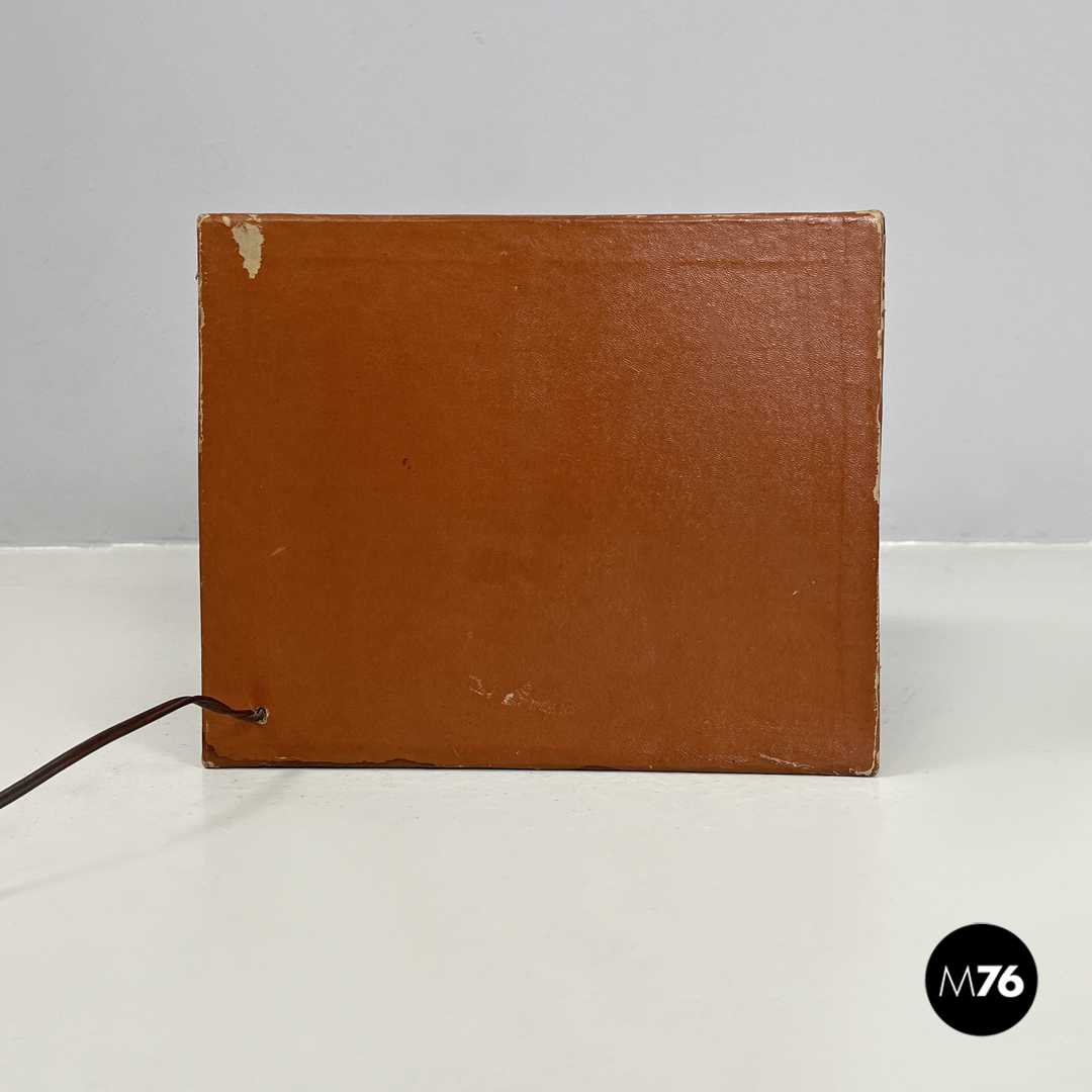Scatola diorama cubica rappresentante una scena cerimoniale cristiana. L’esterno della scatola è rivestito di cartone marrone la faccia frontale della scatola è in vetro con cornice dorata e mostra la composizione interna che vede sulla sinistra una celebrazione religiosa e sulla sinistra una scena di lavoro il tutto ambientato in una grotta. Presente trasformatore che ne rende possibile l’illuminazione. Sulla parte superiore riporta un’etichetta scritta a mano che dice “Attenzione! Va a 125 il trasformatore è nella scatola degli addobbi natalizi”.