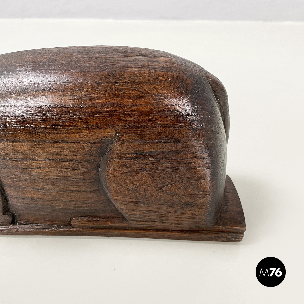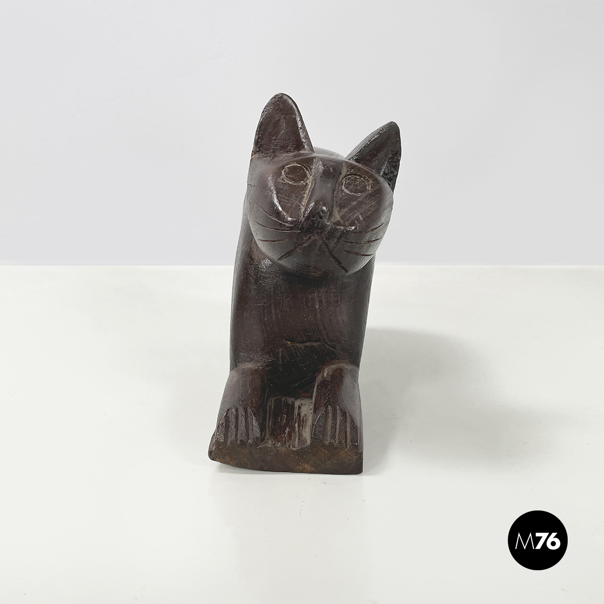 Scatola portagioie con vano a scomparsa a forma di gatto sdraiato interamente in legno scuro. I tratti del gatto sono stilizzati. Il vano a scorrimento è sulla pancia del gatto. Questa scatola da chiusa può sembrare una piccola scultura. Questa scatola è perfetta come contenitore o portaoggetti.