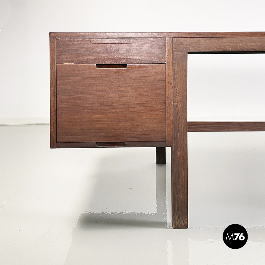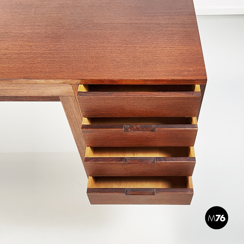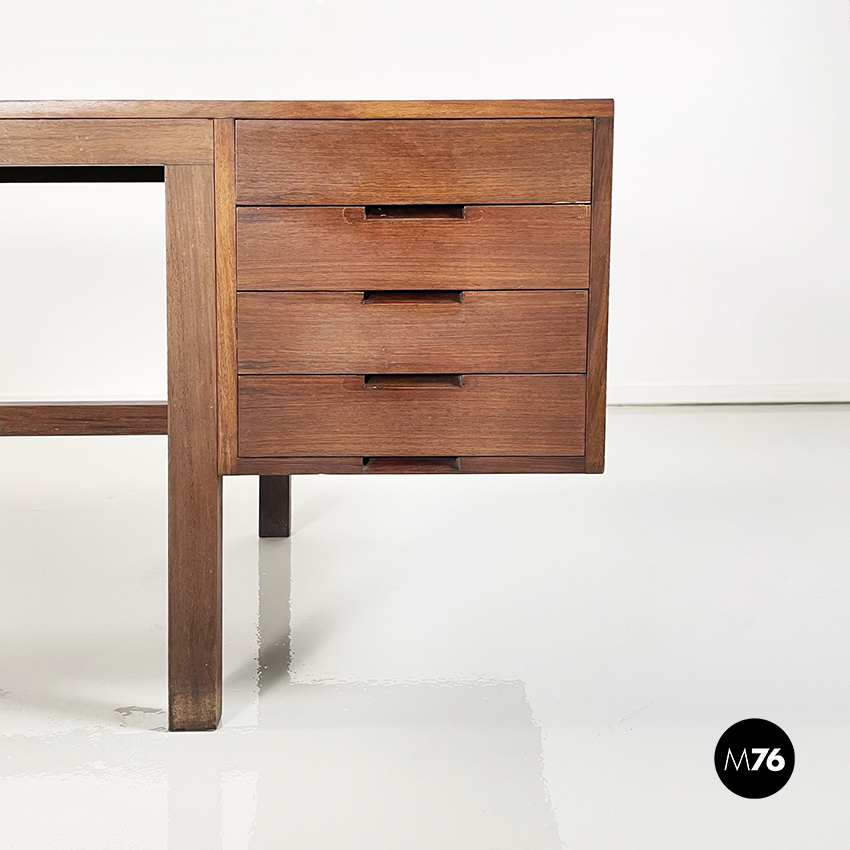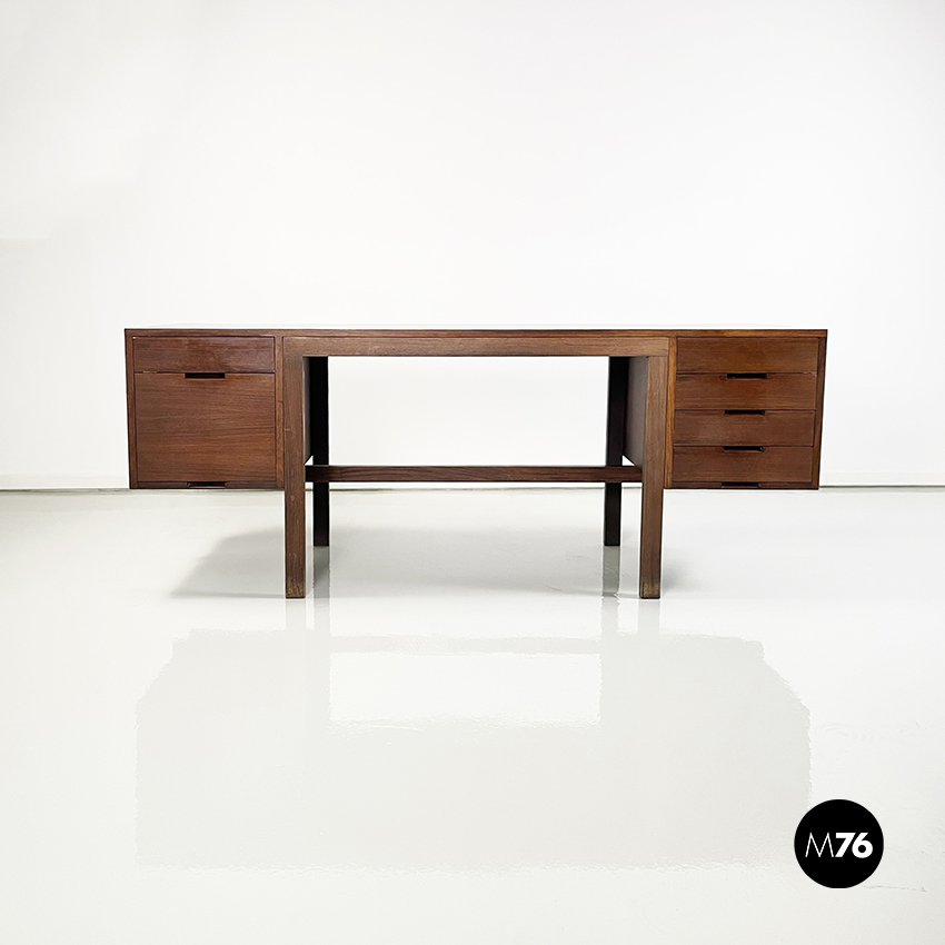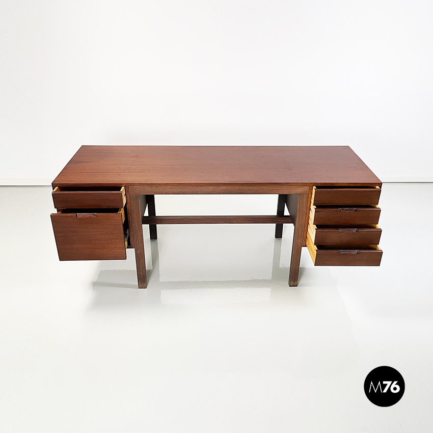 Scrivania modello Canaan con piano rettangolare in legno. Su un lato sono presenti due cassetti e sull’altro quattro. Presenta nella parte bassa una traversa in legno utilizzabile per poggiare i piedi. Gambe a sezione rettangolare.
