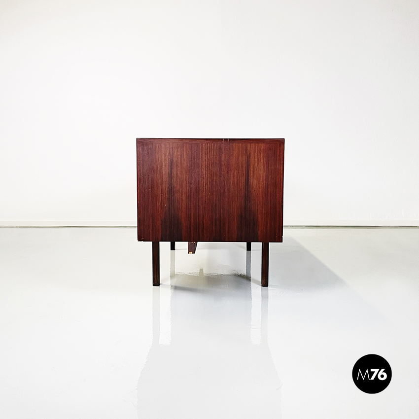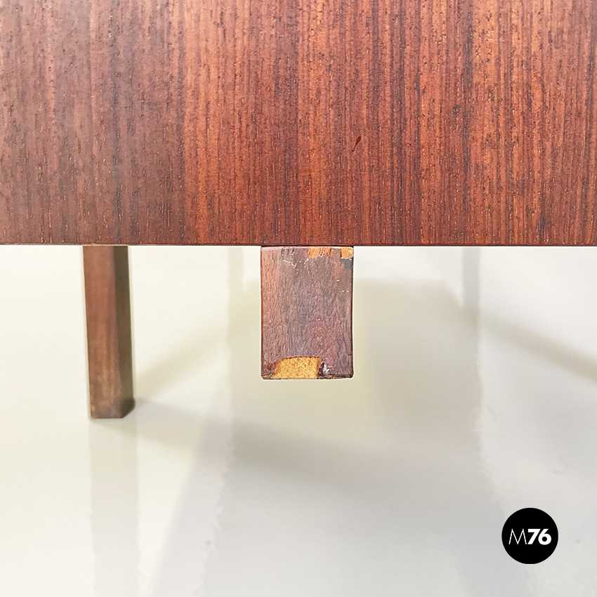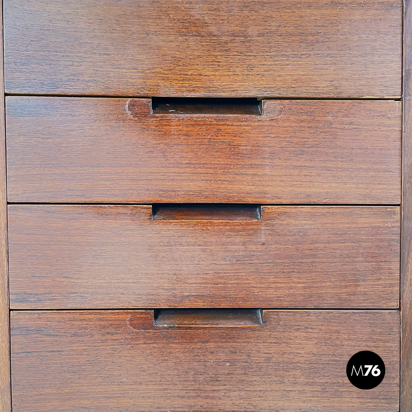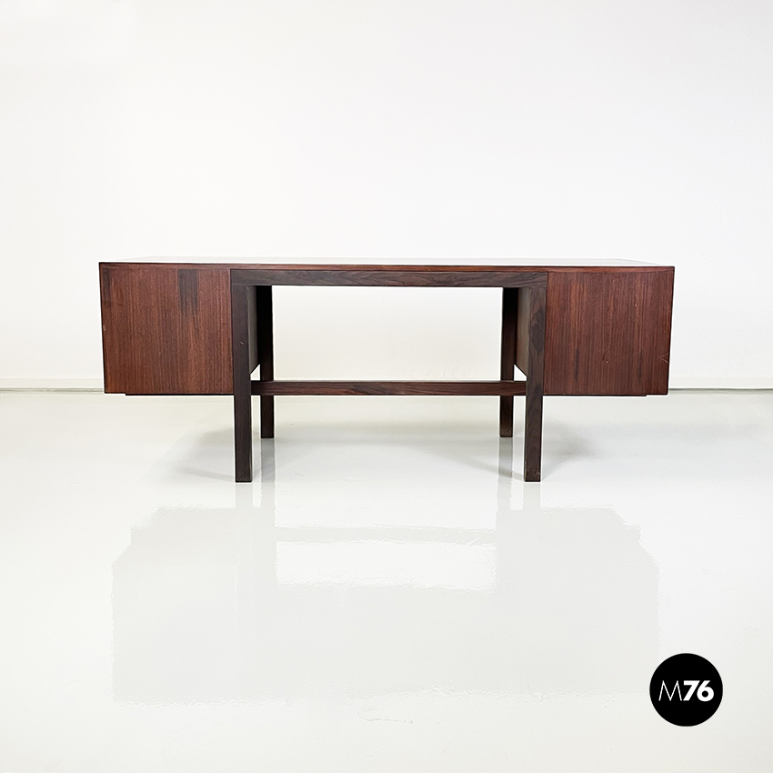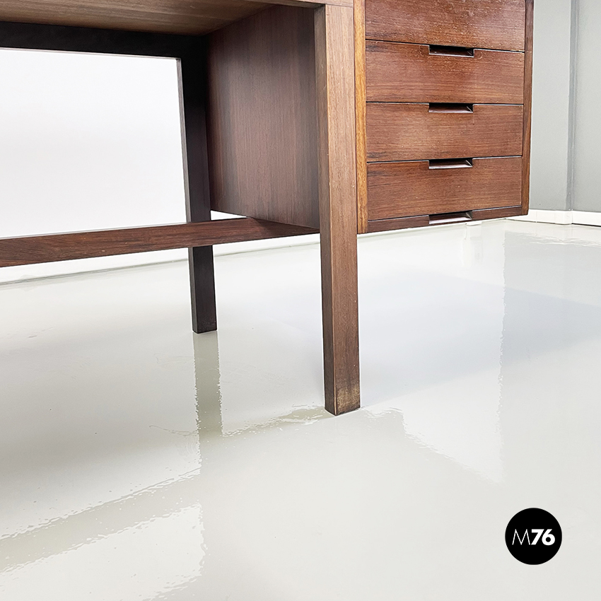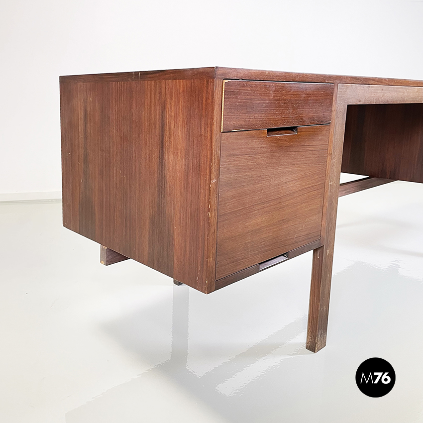 Scrivania modello Canaan con piano rettangolare in legno. Su un lato sono presenti due cassetti e sull’altro quattro. Presenta nella parte bassa una traversa in legno utilizzabile per poggiare i piedi. Gambe a sezione rettangolare.