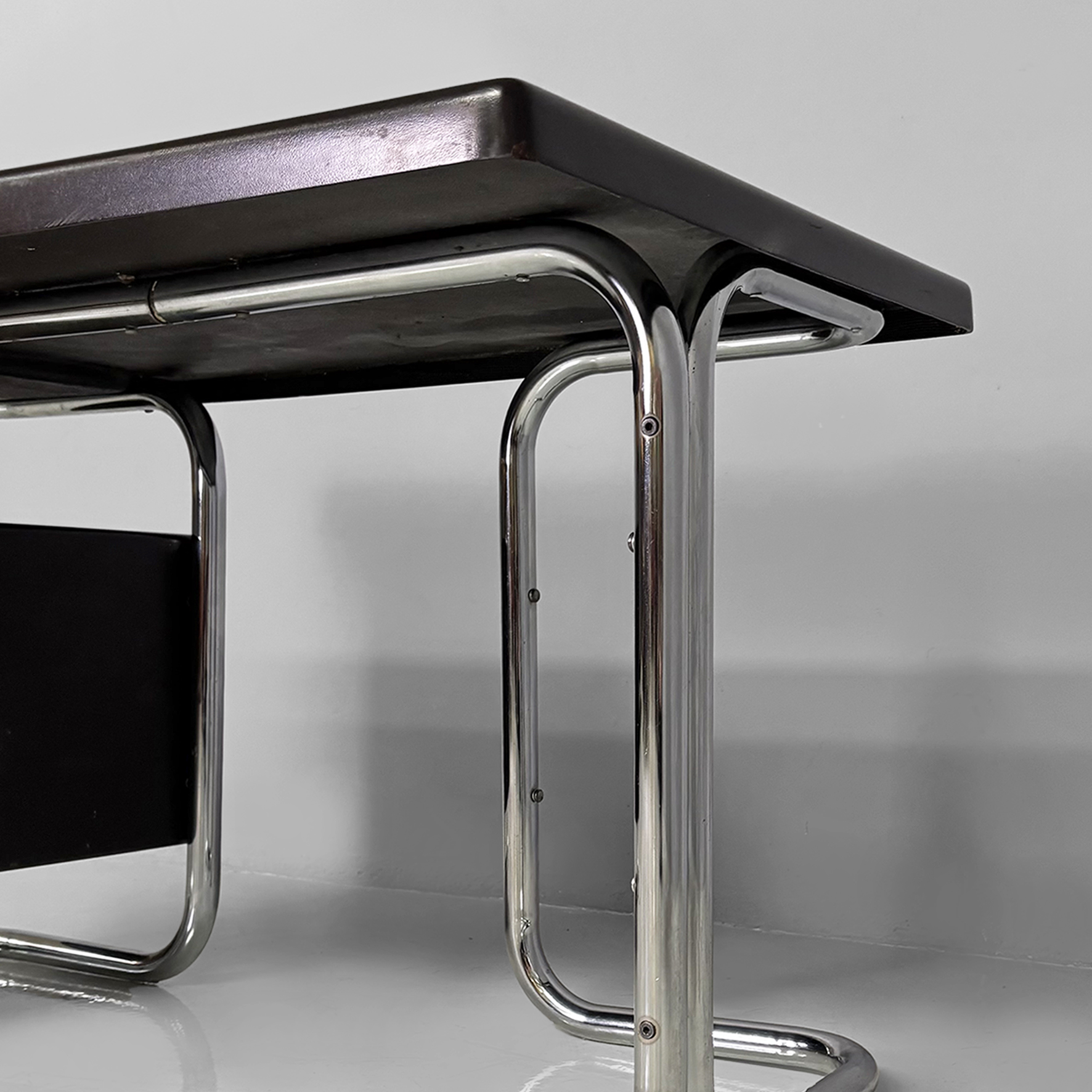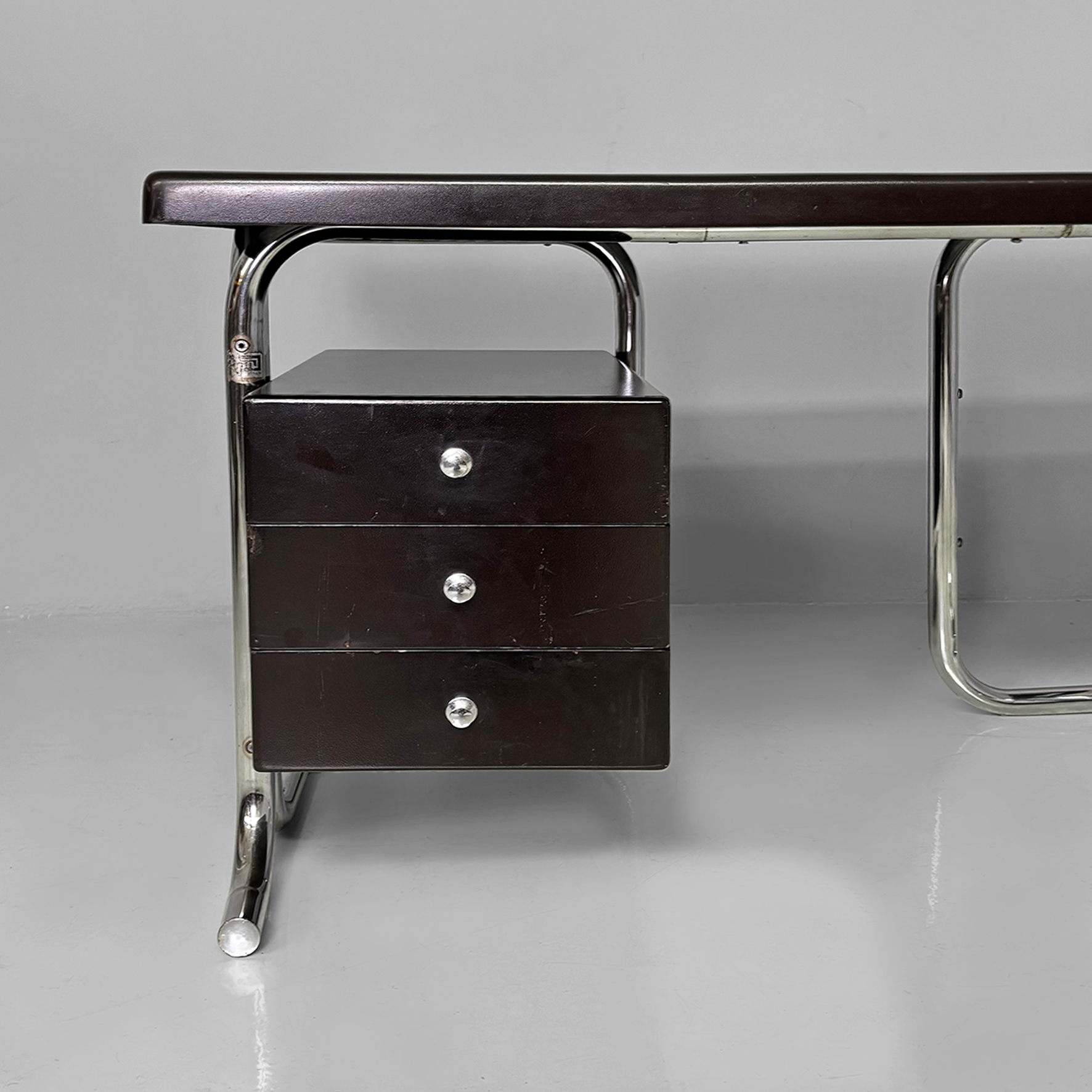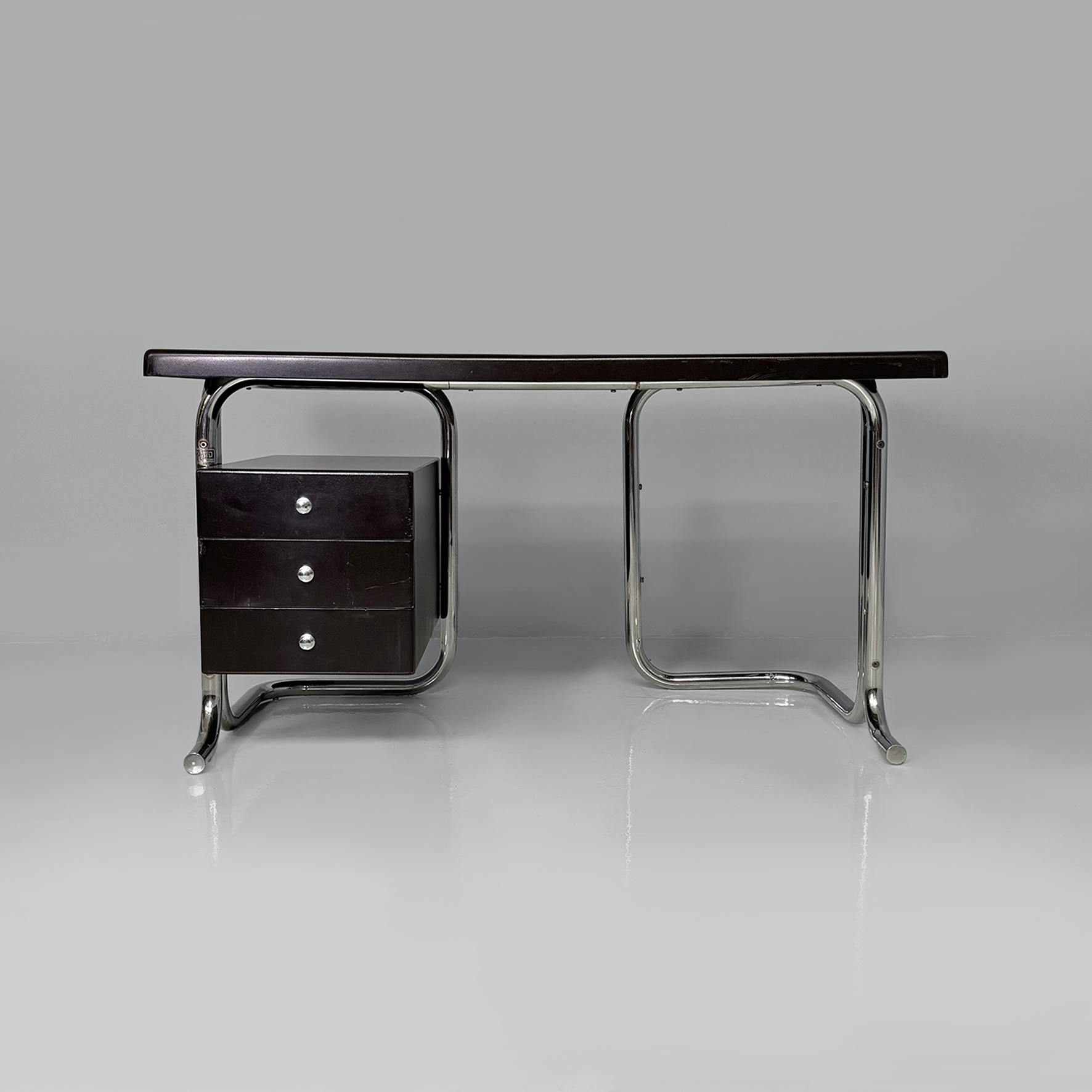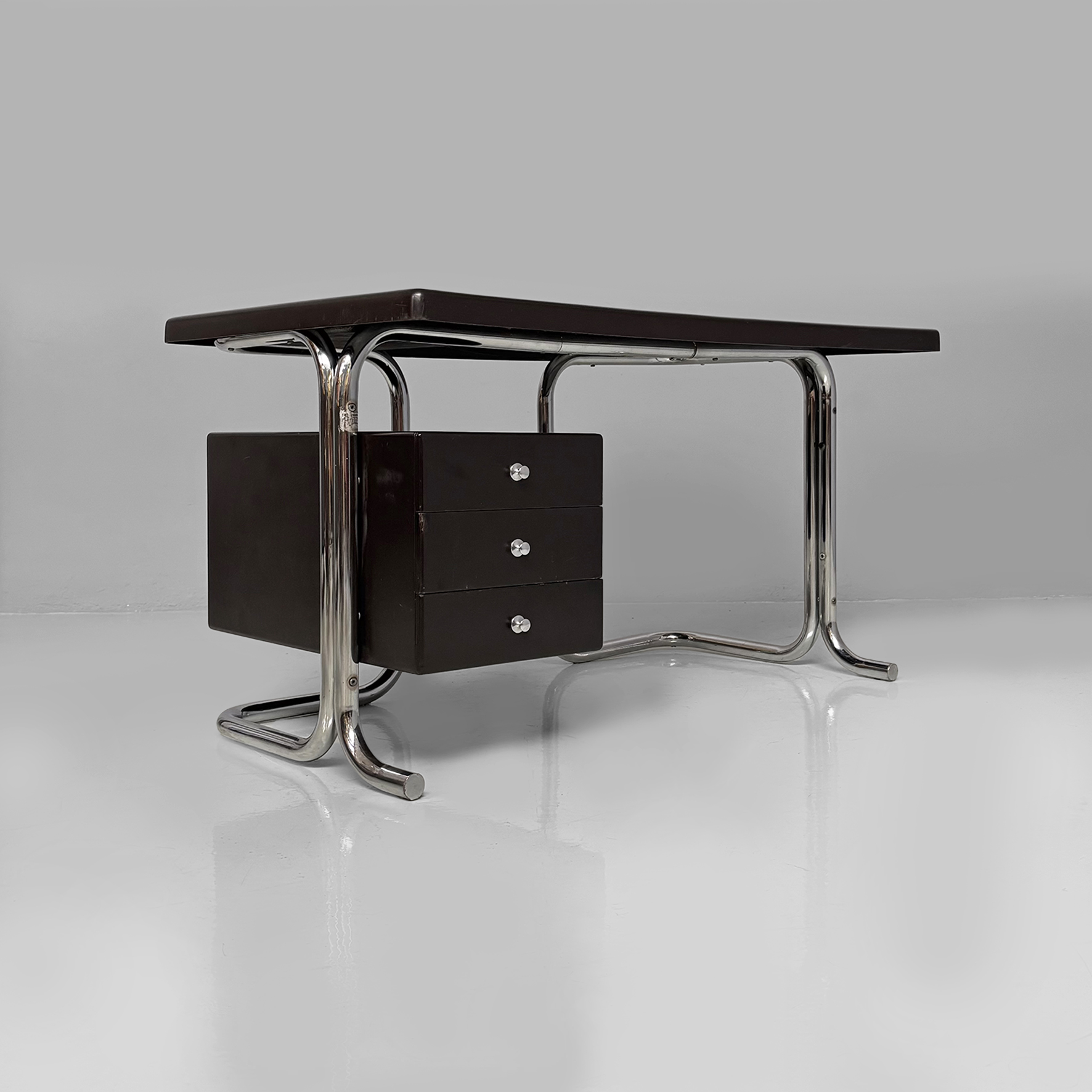 Scrivania in metallo e plastica. La struttura è in tubolare di acciaio inox curvato. Il piano rettangolare con angoli smussati è in plastica laccata colore marrone scuro con vani contenitori per oggetti da scrivania. Sul lato è presente una cassettiera composta da tre cassetti con maniglie a pomello in metallo. Appartenente allo stile Bauhaus.