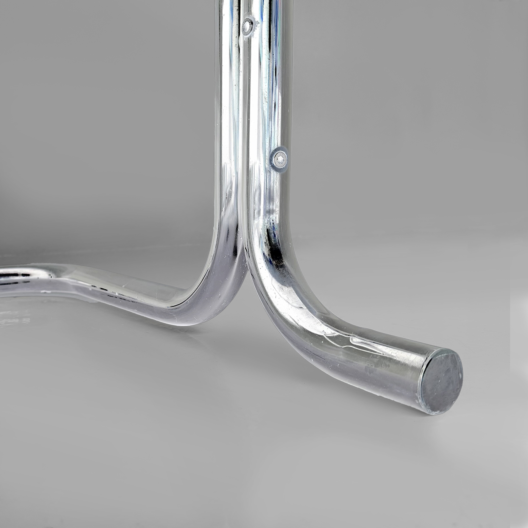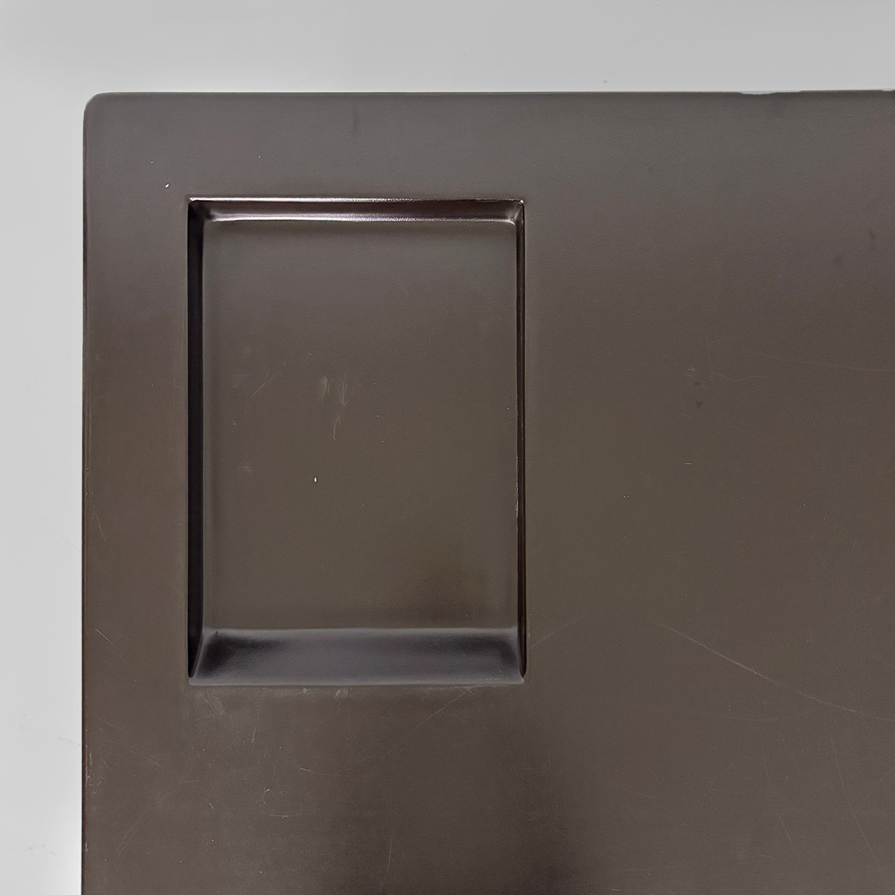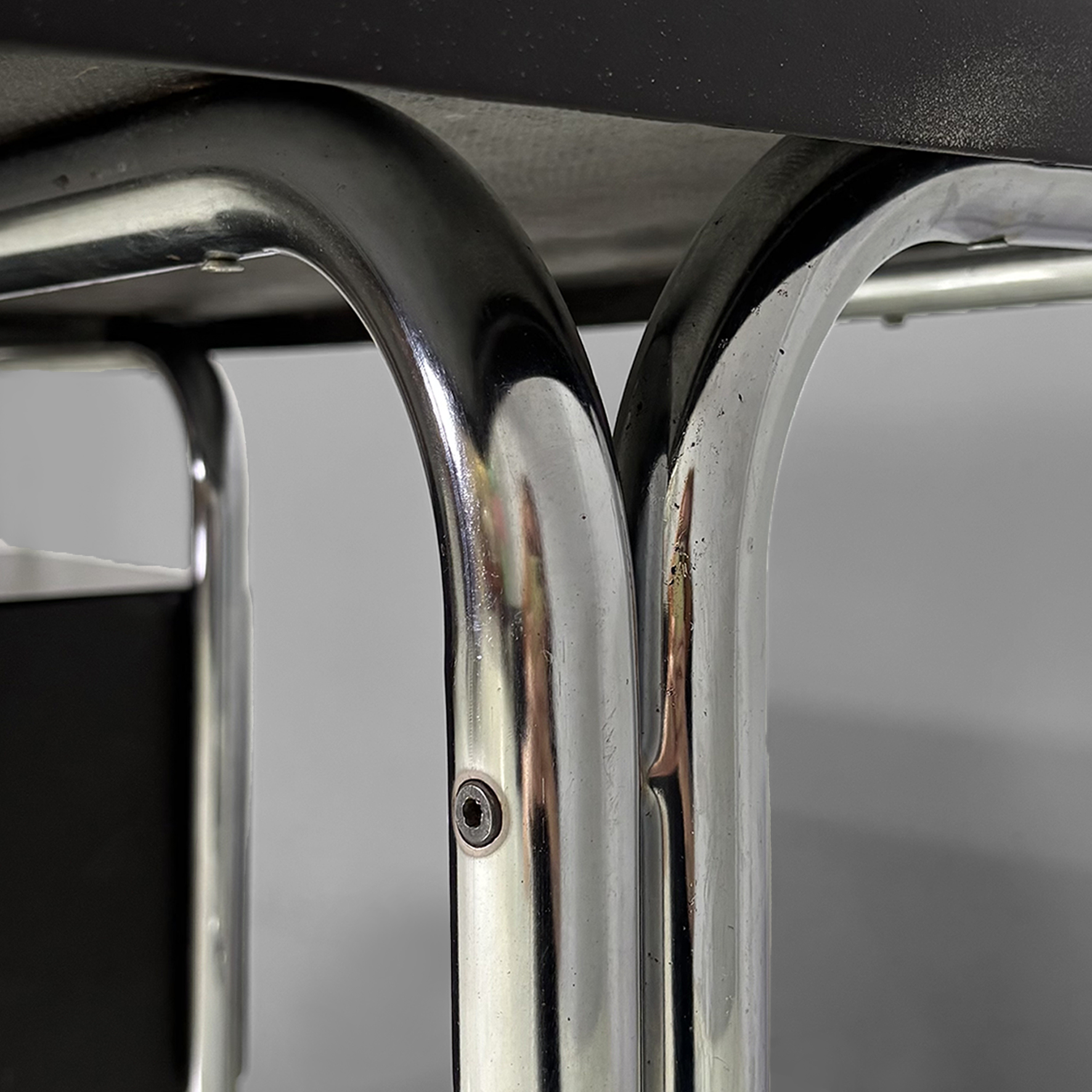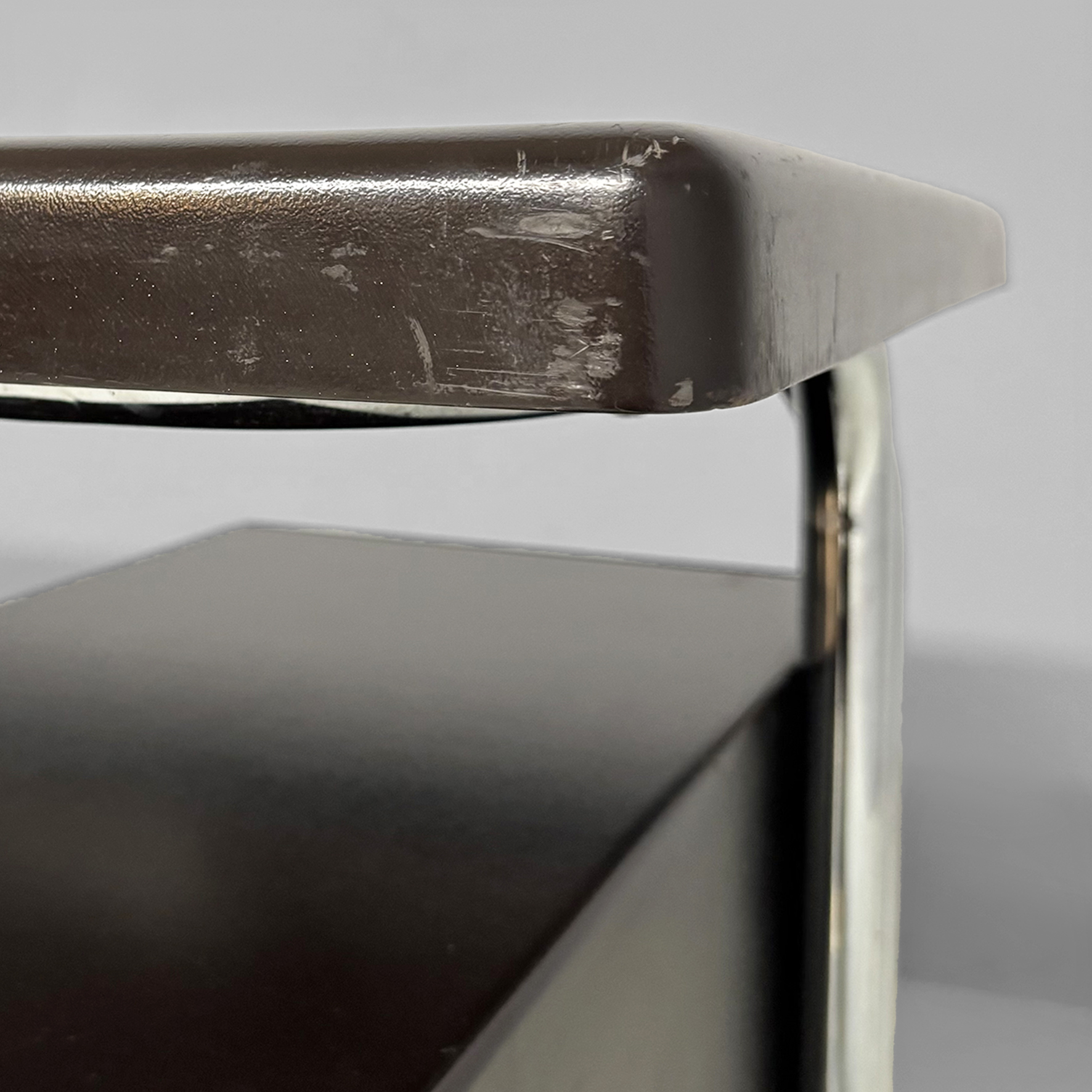 Scrivania in metallo e plastica. La struttura è in tubolare di acciaio inox curvato. Il piano rettangolare con angoli smussati è in plastica laccata colore marrone scuro con vani contenitori per oggetti da scrivania. Sul lato è presente una cassettiera composta da tre cassetti con maniglie a pomello in metallo. Appartenente allo stile Bauhaus.