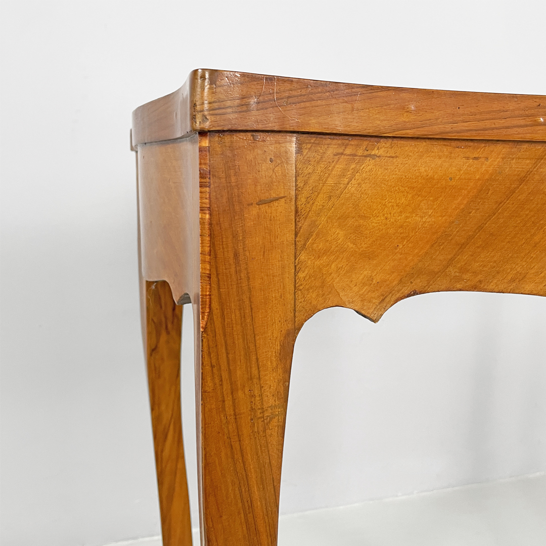 Scrivania o tavolo con piano rettangolare ad angoli arrotondati, interamente in legno di noce.