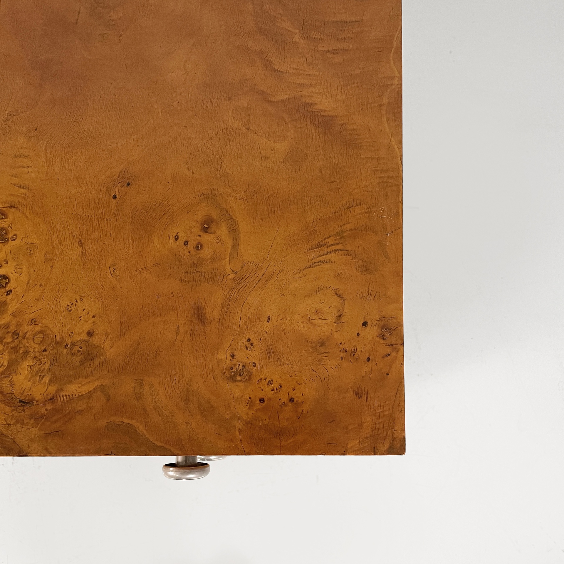 Scrivania con struttura in legno di radica. Sotto il piano rettangolare sono presenti una colonna di tre cassetti rettangolari con maniglie tonde in acciaio cromato e un cassetto rettangolare più lungo con chiave. Le due zampe a sezione rettangolare sono in legno. Rifinita su tutti i lati. Art Deco.