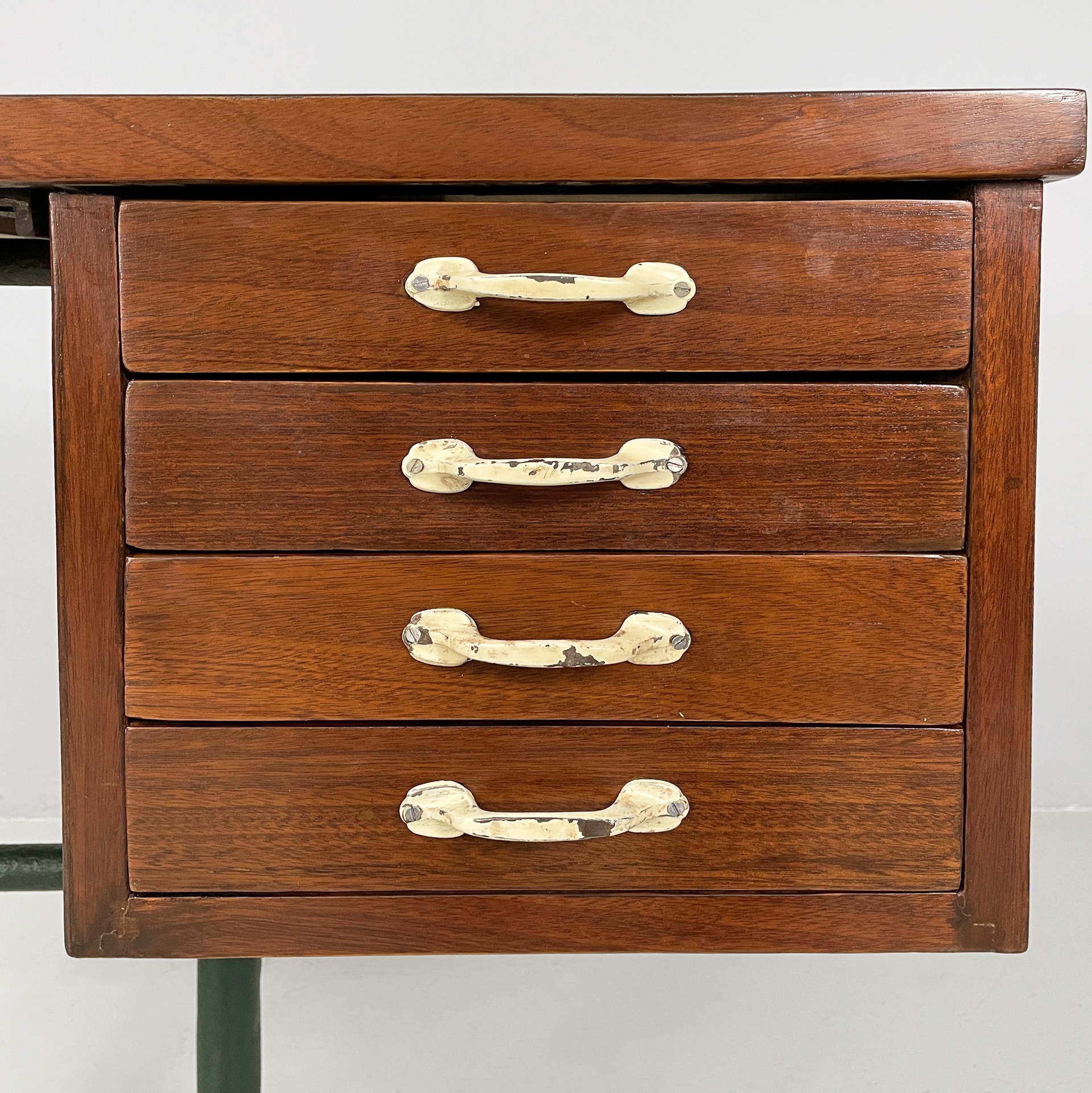 Scrivania con piano rettangolare in legno. Al centro del piano presenta un cassetto in legno con maniglia in metallo verniciato bianco panna. Su un lato presenta quattro cassetti rettangolari con maniglia in metallo verniciato bianco panna. Le zampe sono in tubolare in metallo verde.