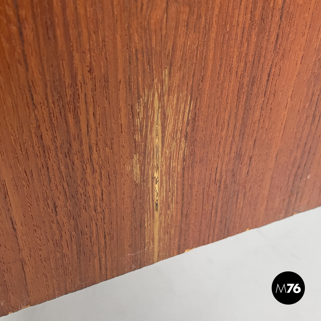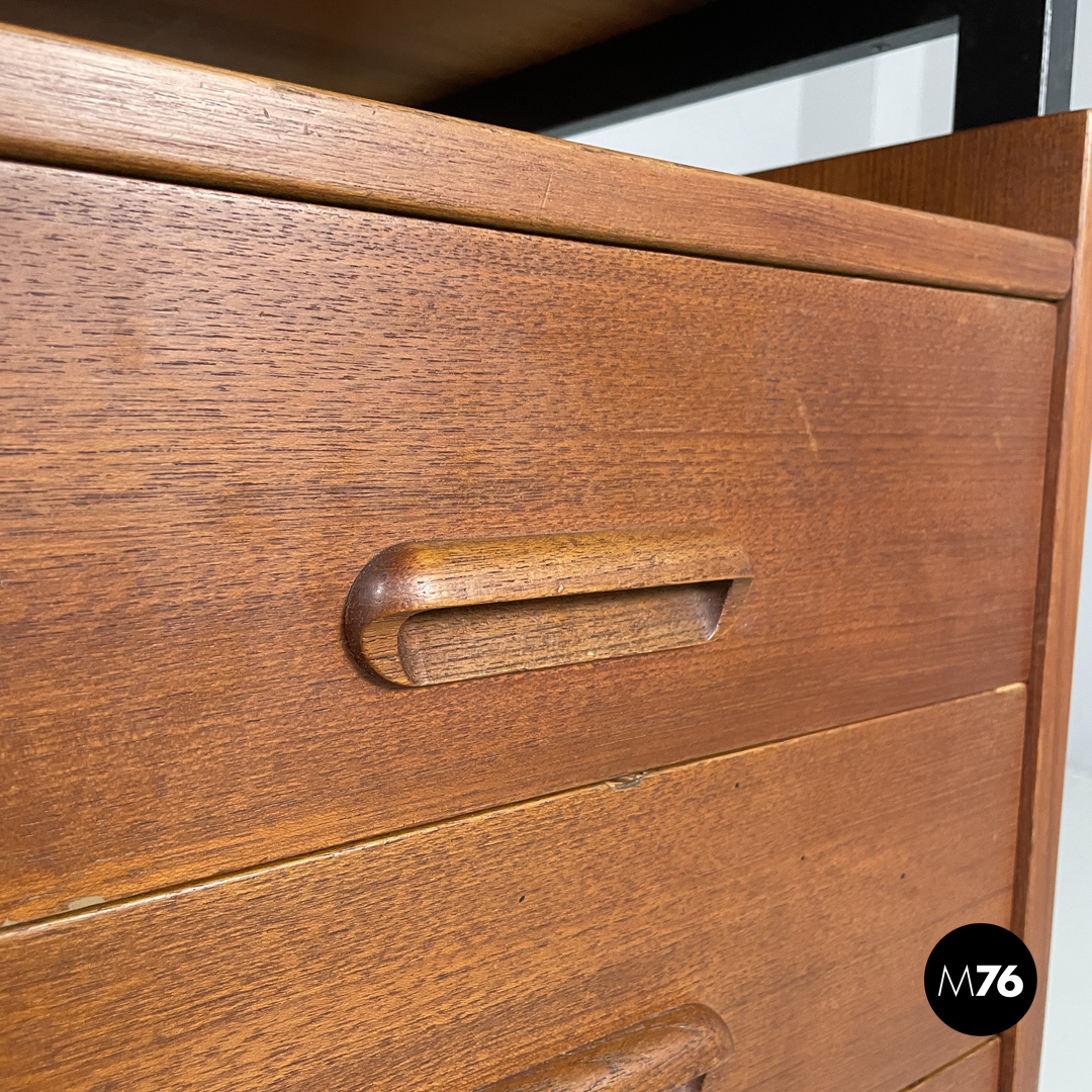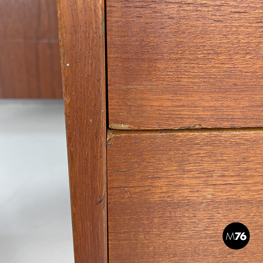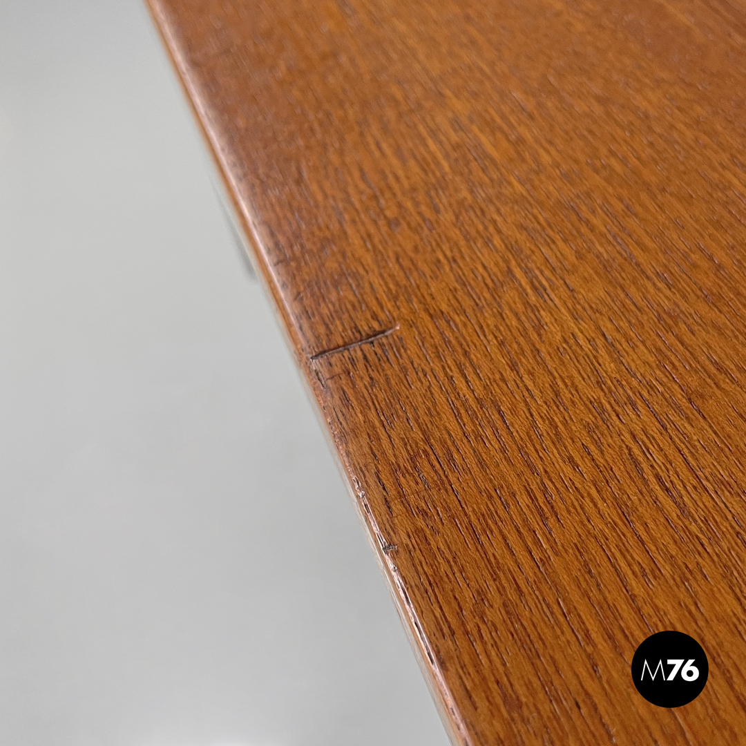 Scrivania in legno con cassetti. Il piano è rettangolare sotto il piano sulla destra si trovano i tre cassetti con maniglia allungata sempre in legno. Ai lati e sulla parte posteriore sono presenti dei pannelli. Con quattro gambe a sezione quadrata in metallo verniciato nero.