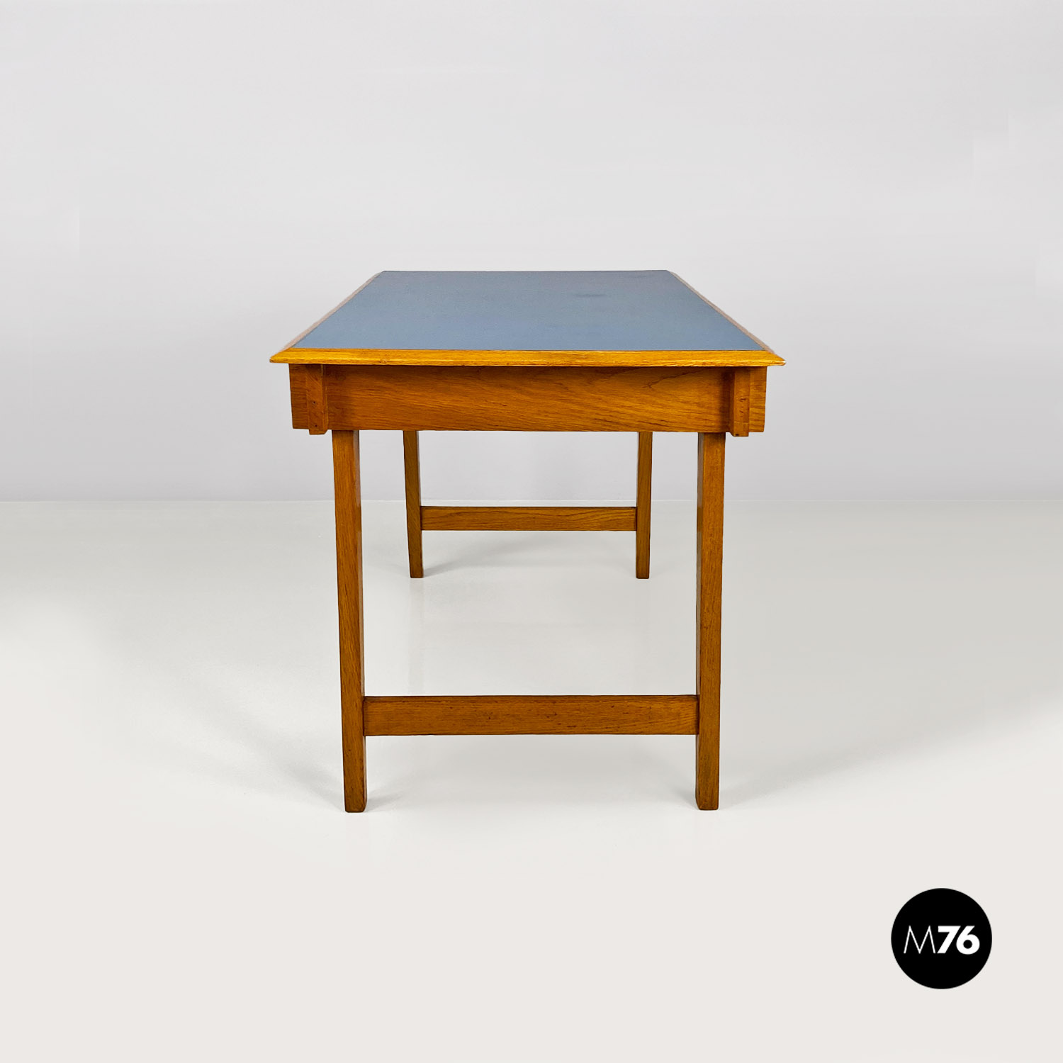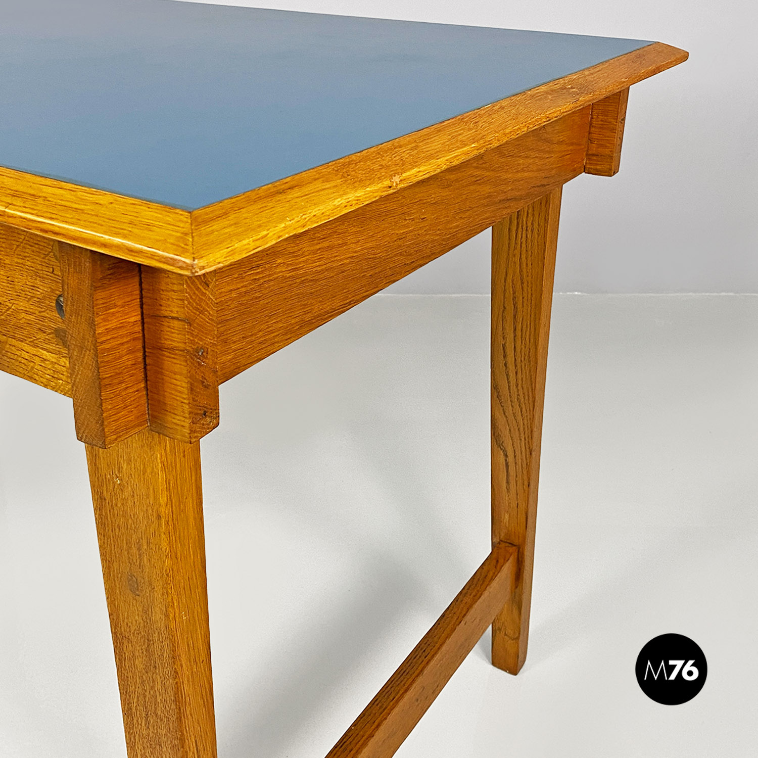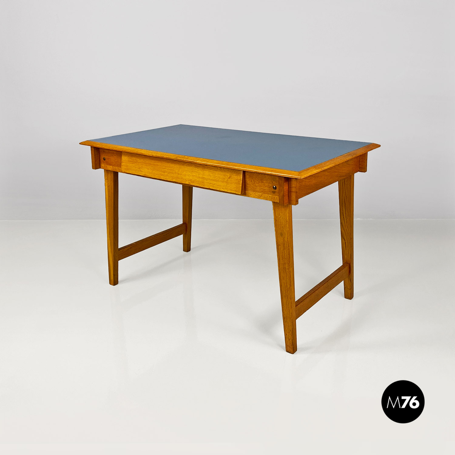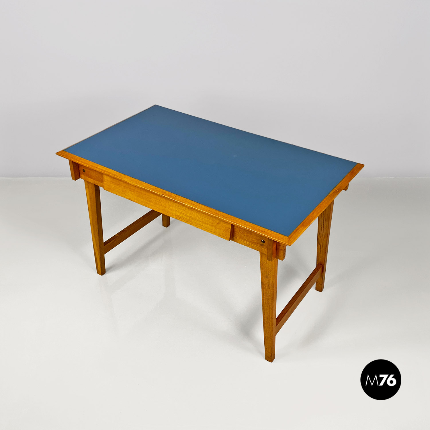 Scrivania con piano rettangolare in formica in blu chiaro con struttura composta da quattro gambe e un cassetto centrale in legno massello chiaro.