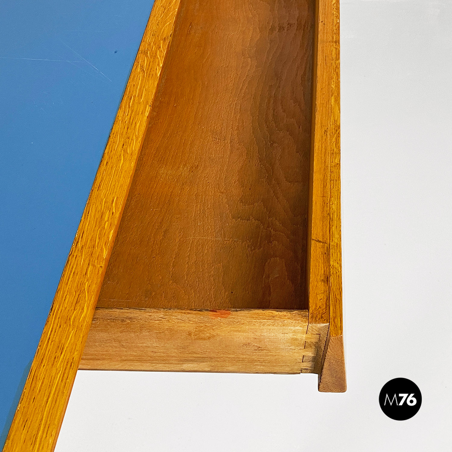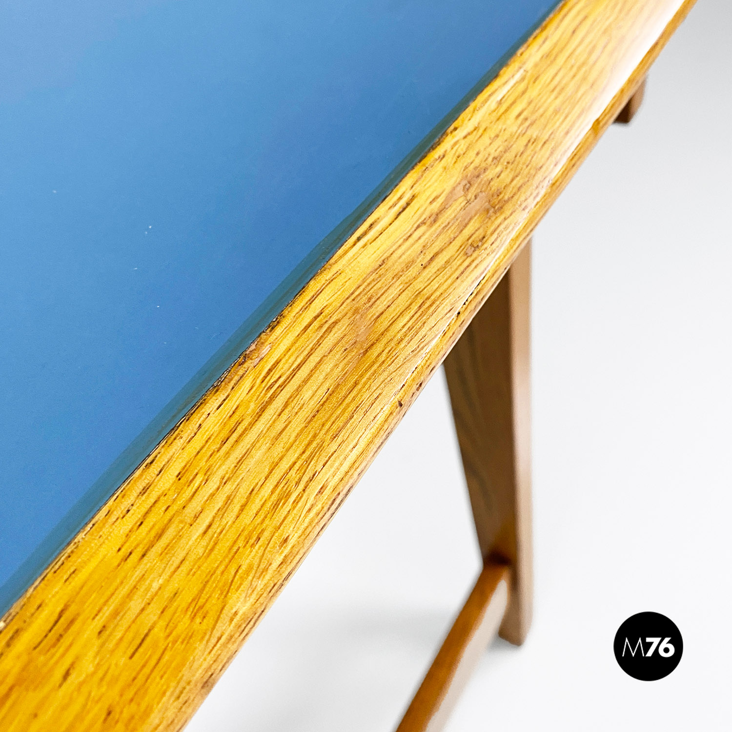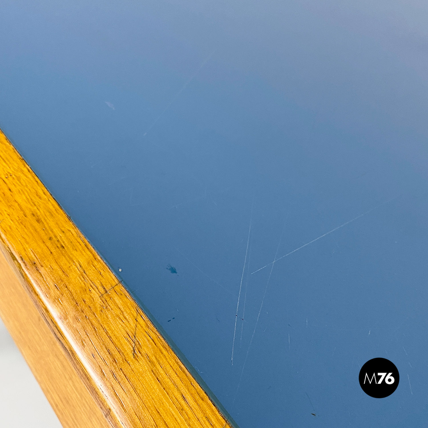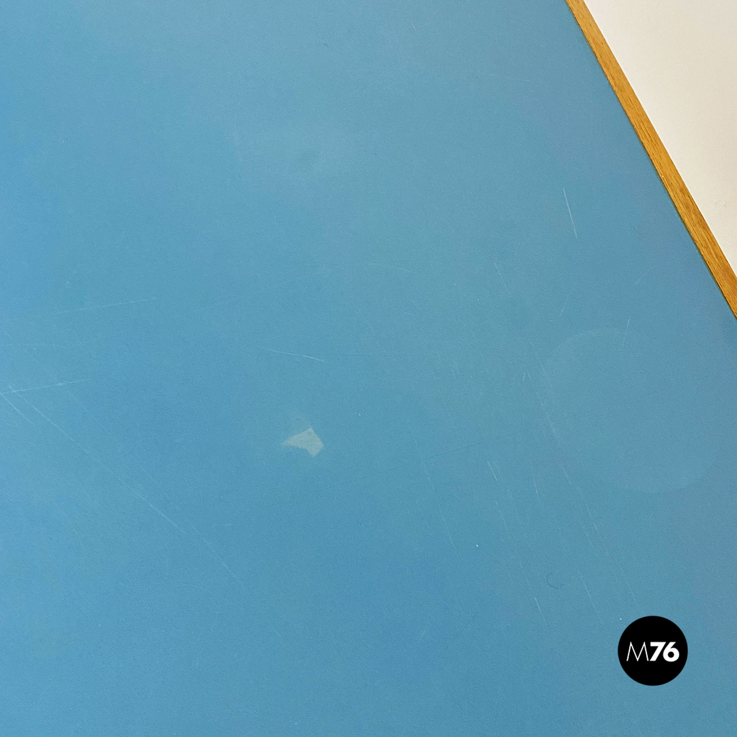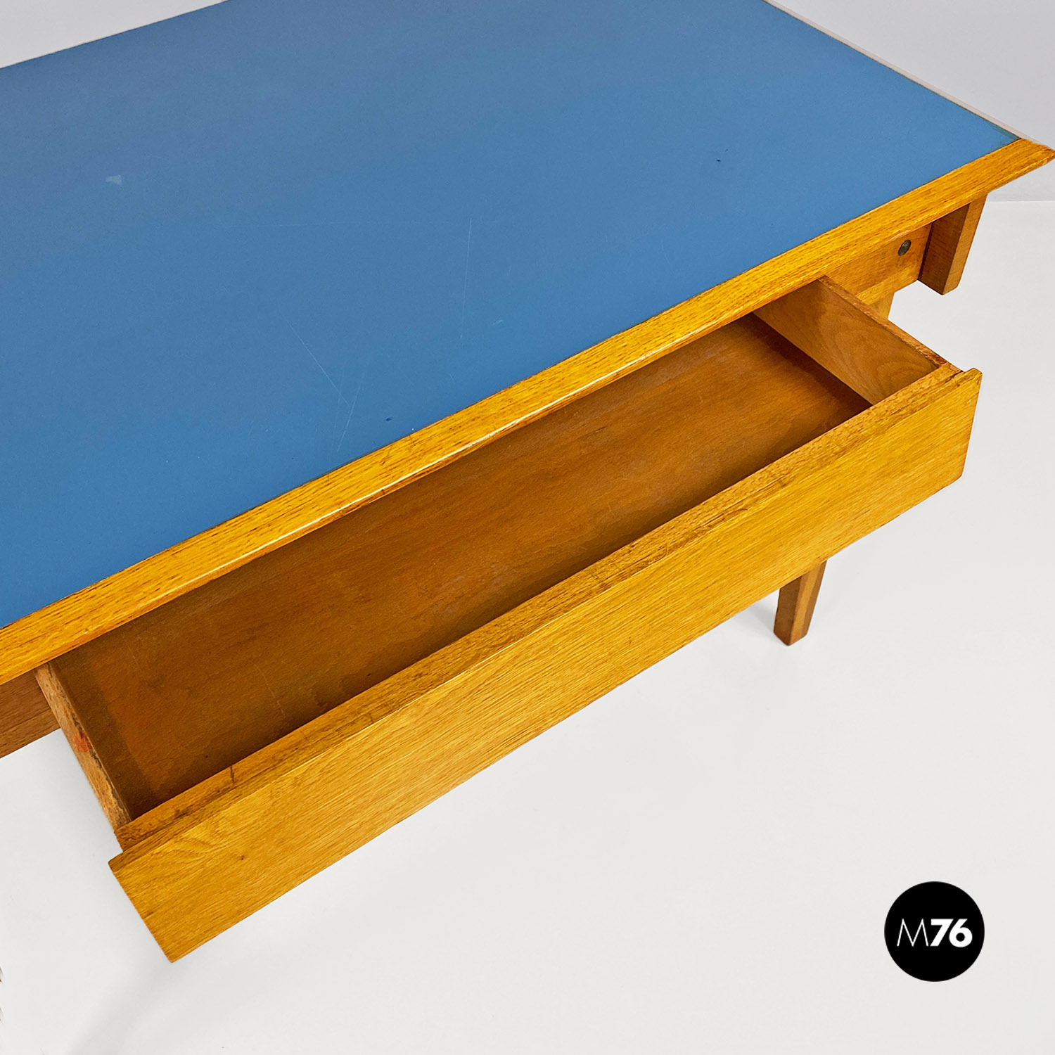 Scrivania con piano rettangolare in formica in blu chiaro con struttura composta da quattro gambe e un cassetto centrale in legno massello chiaro.