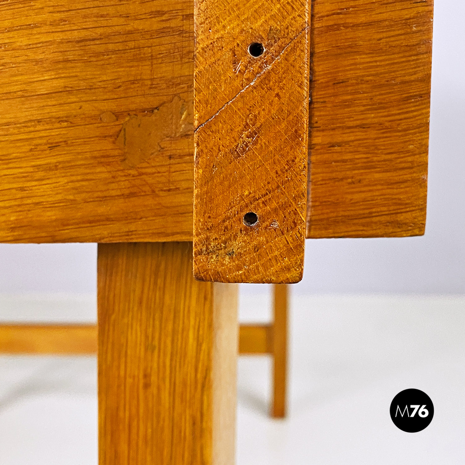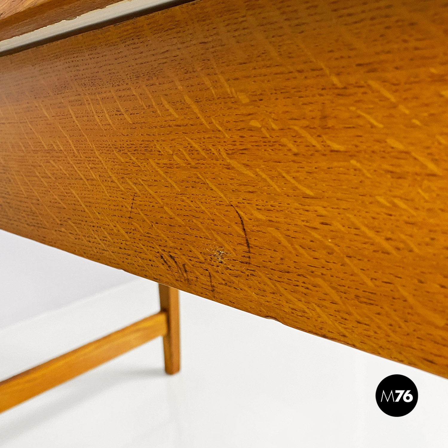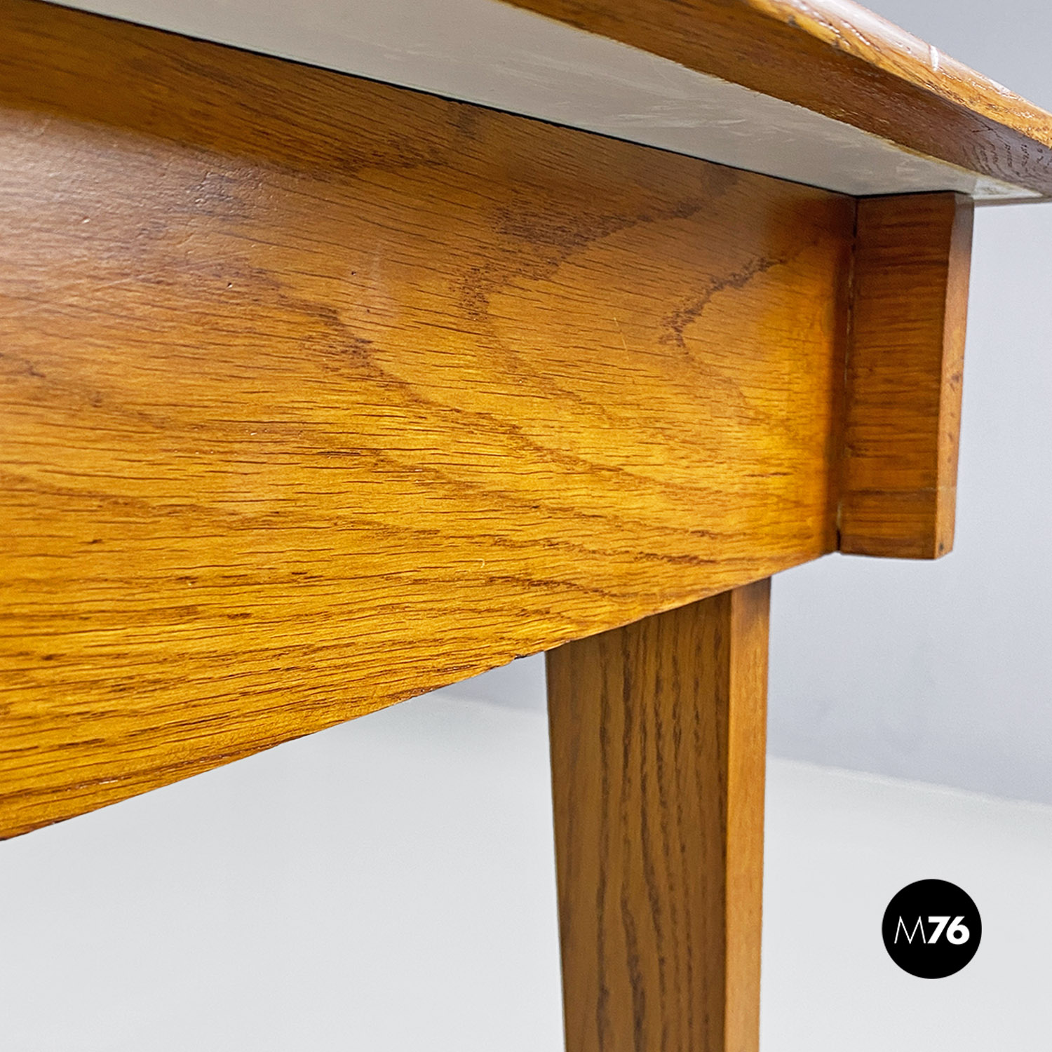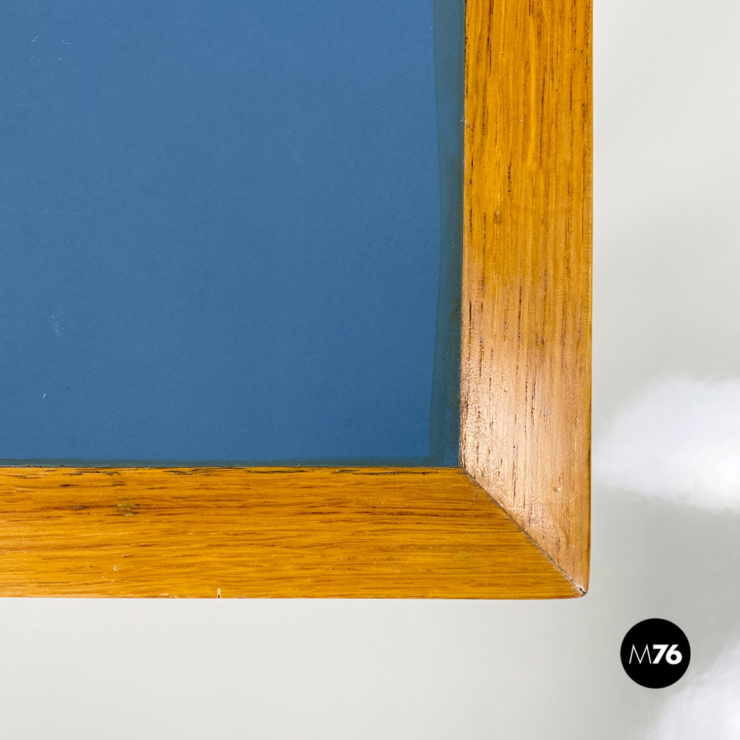Scrivania con piano rettangolare in formica in blu chiaro con struttura composta da quattro gambe e un cassetto centrale in legno massello chiaro.
