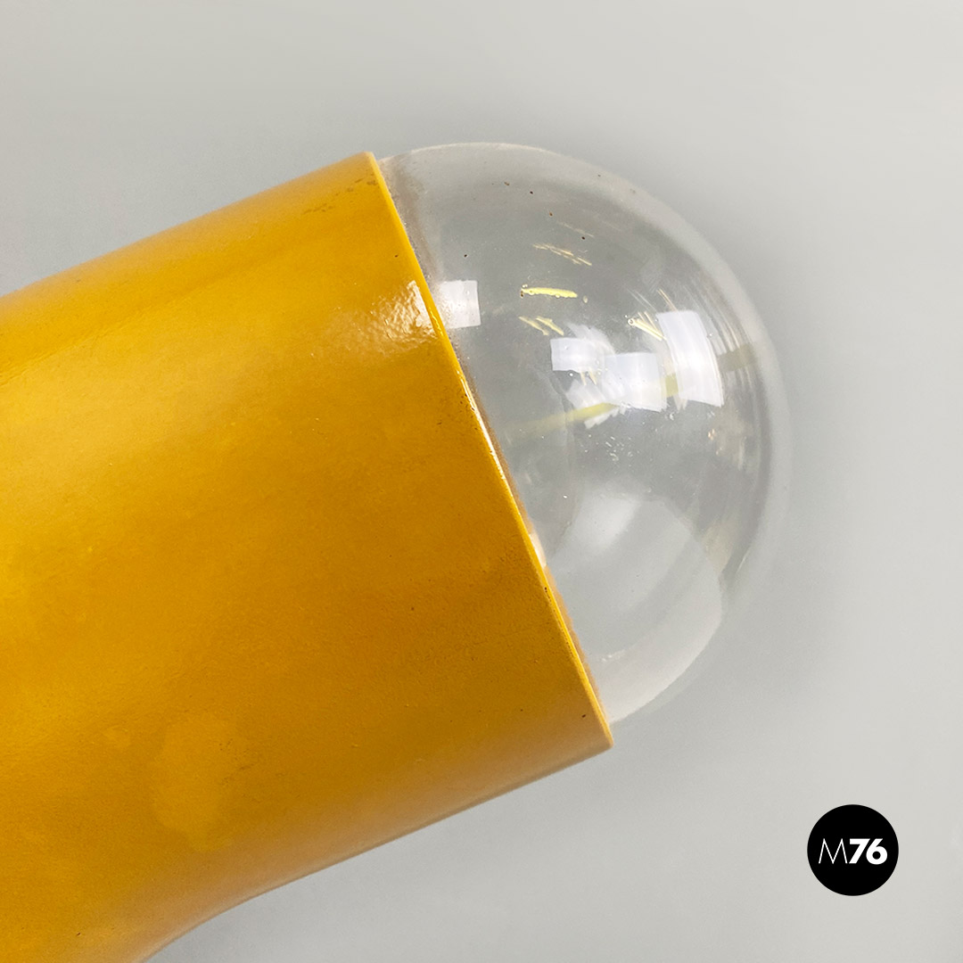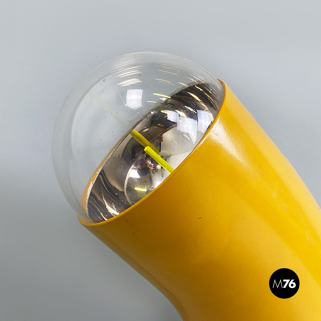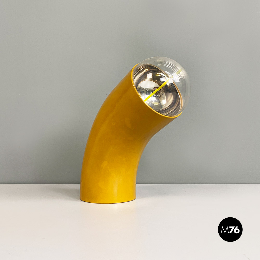 Scultura cinetica composta da un tubolare in plastica giallo senape e una sfera con all’interno una bacchetta di radio che genera fasci di colore giallo.